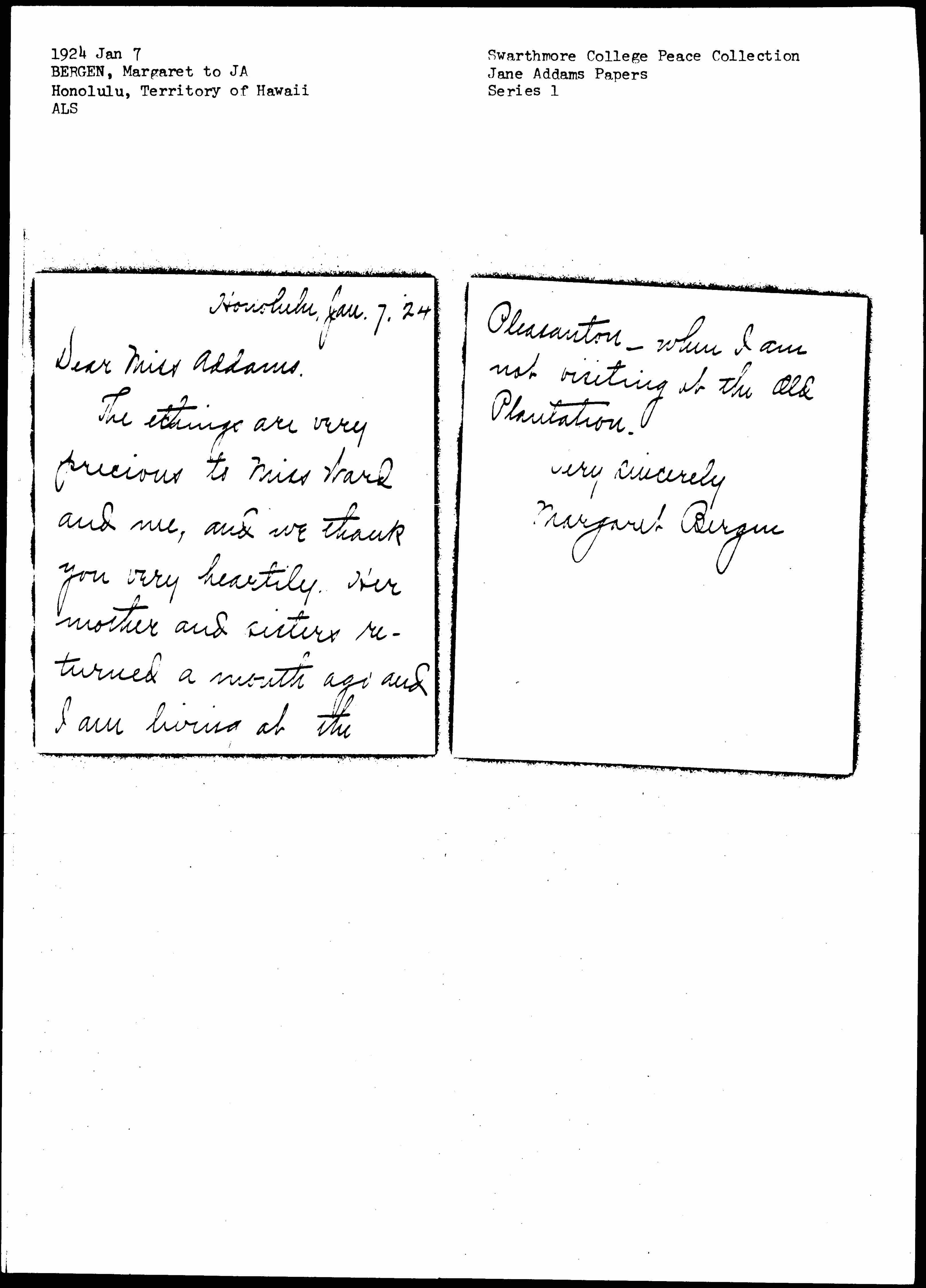 The etchings are very precious to Miss Ward and me, and we thank you very heartily. Her mother and sister returned a month ago and I am living at the [page 2] Plantation -- when I am not visiting at the Old Plantation.