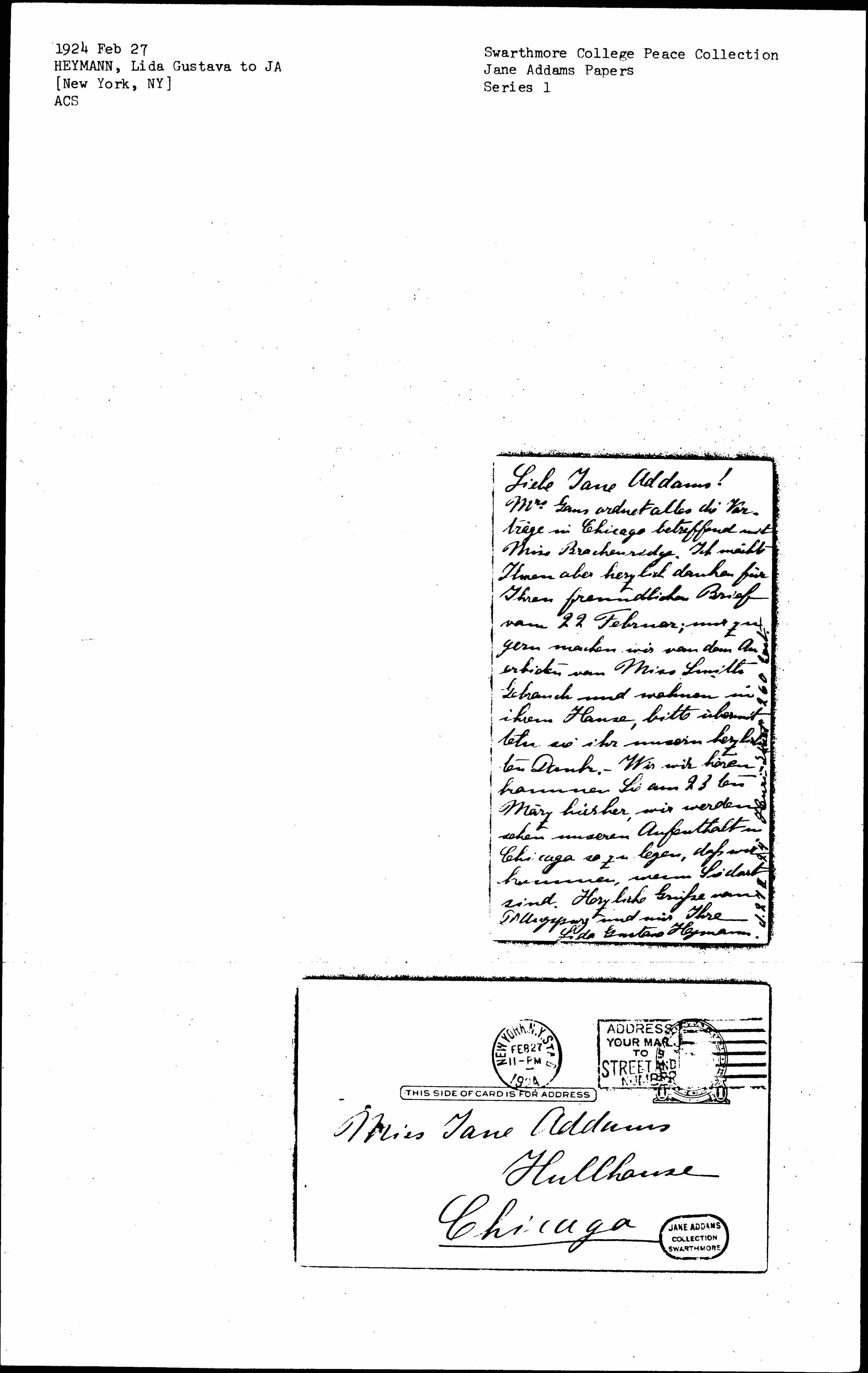 Mrs. Gans arranges everything concerning the contracts in Chicago with Miss Brackenridge. I would also like to thank you very much for your kind letter of 22 February; we are only too happy to make use of Miss Smith’s offer and stay at her house, please convey our sincere thanks to her. We [illegible] hear you are coming here on March 23rd, we will see to schedule our stay in Chicago so that we come when you are there. Warm regards from Dr. Augspurg and me