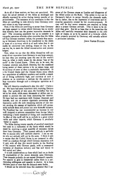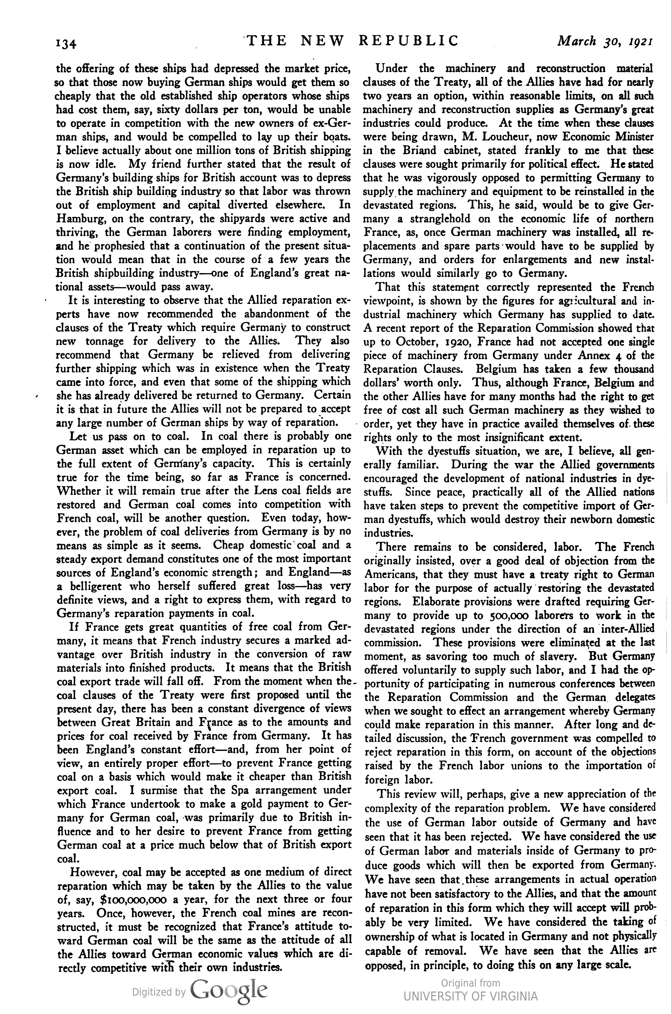 A day or two ago, I talked with a banker who had just arrived from England, and I asked him about the operation of these shipping clauses of the Treaty which were designed primarily for the benefit of Great Britain. He said that the British government had endeavored to sell the German ships, and on account of the lack of demand [page 2] the offering of these ships had depressed the market price, so that those now buying German ships would get them so cheaply that the old established ship operators whose ships had cost them, say, sixty dollars per ton, would be unable to operate in competition with the new owners of ex-German ships, and would be compelled to lay up their boats. I believe actually about one million tons of British shipping is now idle. My friend further stated that the result of Germany's building ships for British account was to depress the British ship building industry so that labor was thrown out of employment and capital diverted elsewhere. In Hamburg, on the contrary, the shipyards were active and thriving, the German laborers were finding employment, and he prophesied that a continuation of the present situation would mean that in the course of a few years the British shipbuilding industry -- one of England's great national assets -- would pass away.