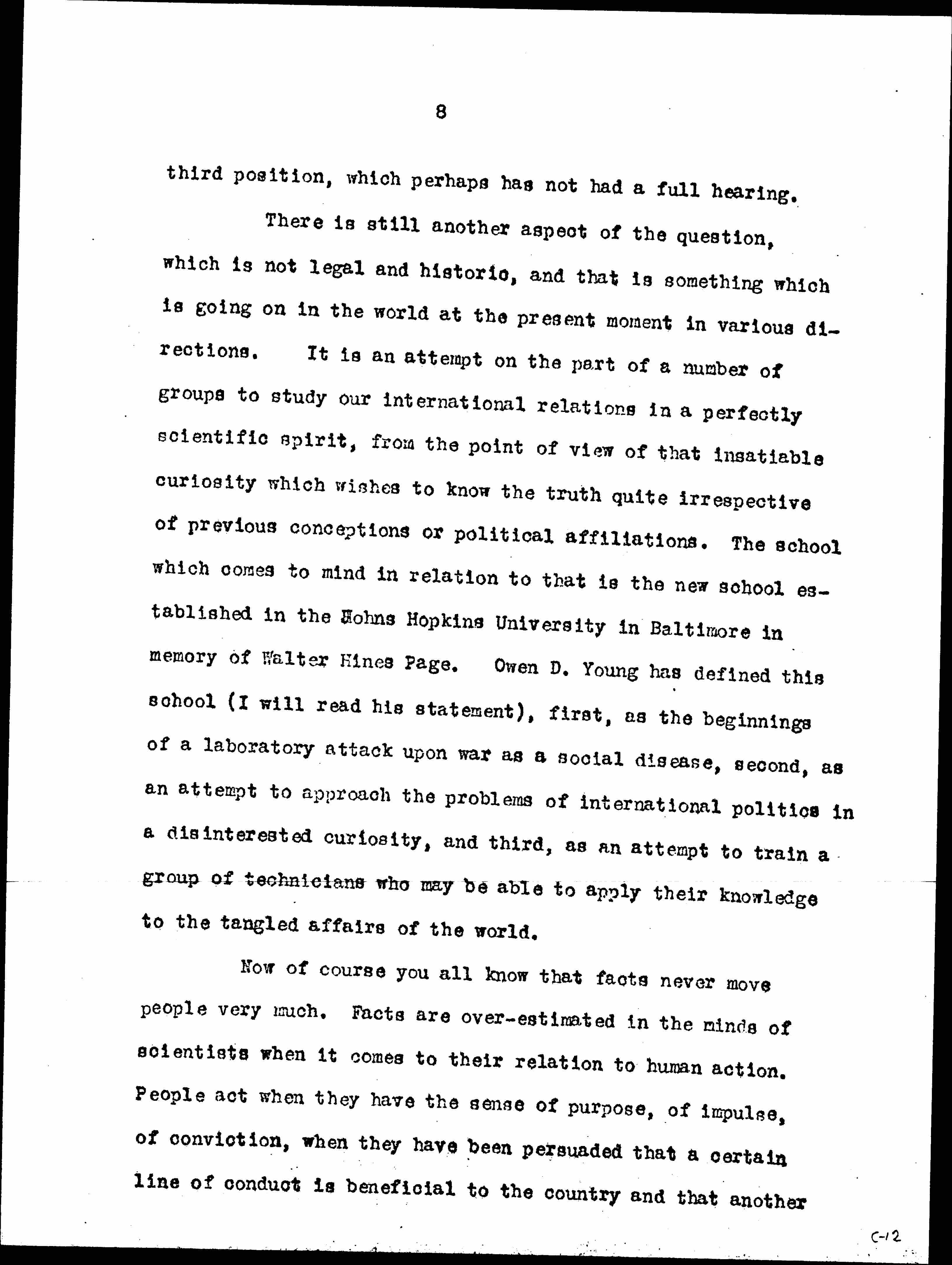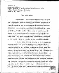 Now of course you all know that facts never move people very much. Facts are [overestimated] in the minds of scientists when it comes to their relation to human action. People act when they have the sense of purpose, of impulse, of conviction, when they have been persuaded that a certain line of conduct is beneficial to the country and that another [page 9] line will injure the country. That is what moves them to political action. In the major interests of mankind, which are, I presume, religion, art, and politics, facts are a wonderful foundation, but they do not move to action. Mankind has to be moved, persuaded, urged on by an appeal to their emotions rather than merely by an appeal to their adherence to a set of facts. That is the sort of thing which this new group is trying to work out in the Robert Brookings School in Washington, the sort of thing which has induced people to endow Mr. Lindemann who is working out the experiment. It is the kind of thing which they tried to do at the Chinese Conference in Baltimore, to urge people to bring their minds together -- not to argue, not to get up anybody’s back, so to speak, but to get at some opinion which will not represent any individual opinion but will represent the opinion of a group trying quite honestly to act together in this new light that is opening before [women] as well as men that they must act as parties, as distinct groups, quite unlike the old individual action. That, it seems to me, is one of the new approaches to this whole international situation which it is well for a club like this to consider.