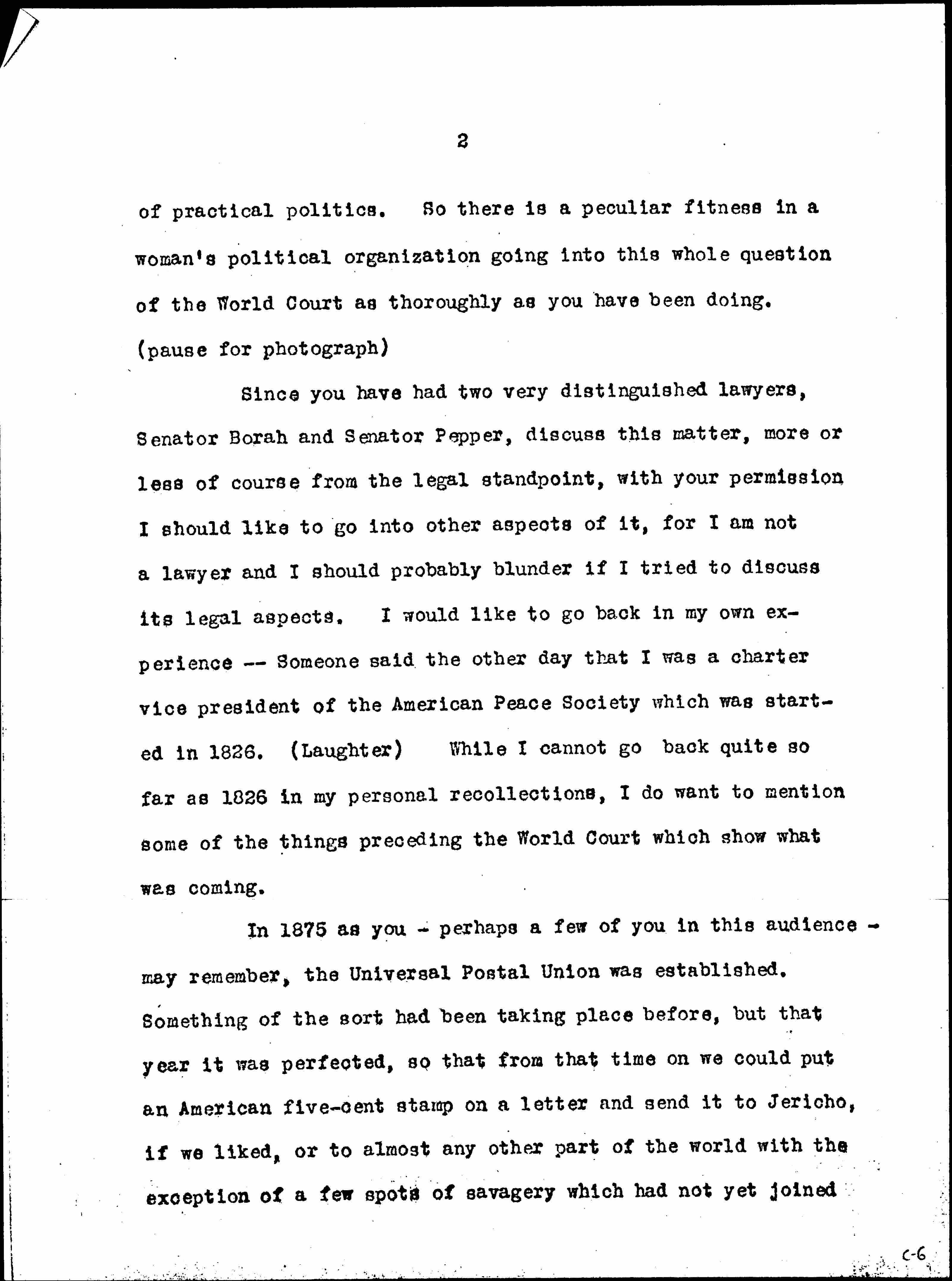 I do not think it is a mistake, or to be regretted, that the discussion promises to be prolonged in the Senate. I do not think it is a mistake, or to be regretted, that many people, in smaller groups, are taking it up; and I am sure that this organization, committed as it is to political affairs and their discussion, will realize that there is something rather interesting in the fact that women in so many countries received the franchise (certainly the women in England, Germany and various parts of the European continent, as well as ourselves) at the very moment that these international questions became matters [page 2] of practical politics. So there is a peculiar fitness in a woman’s political organization going into this whole question of the World Court as thoroughly as you have been doing. (pause for photograph)