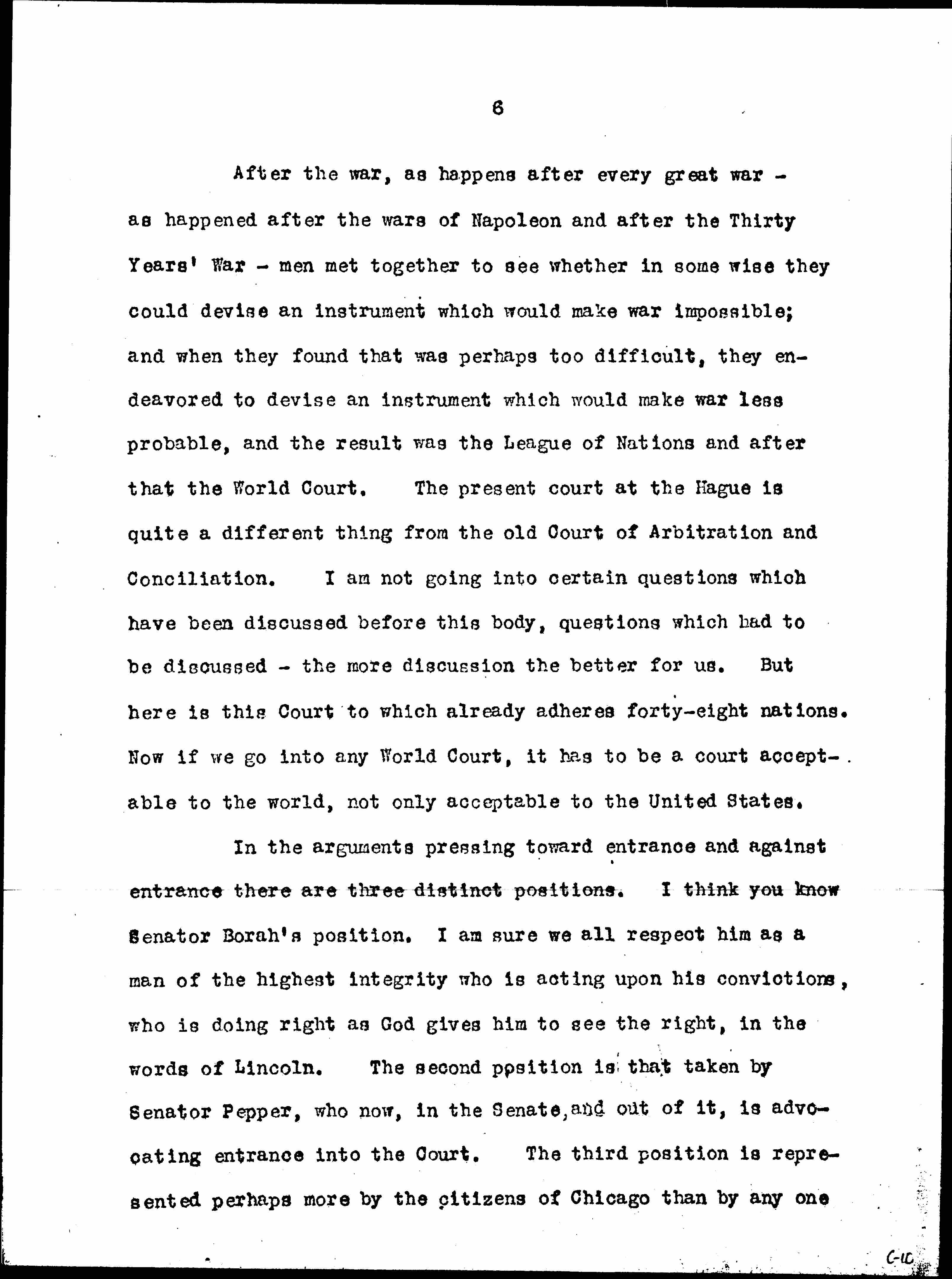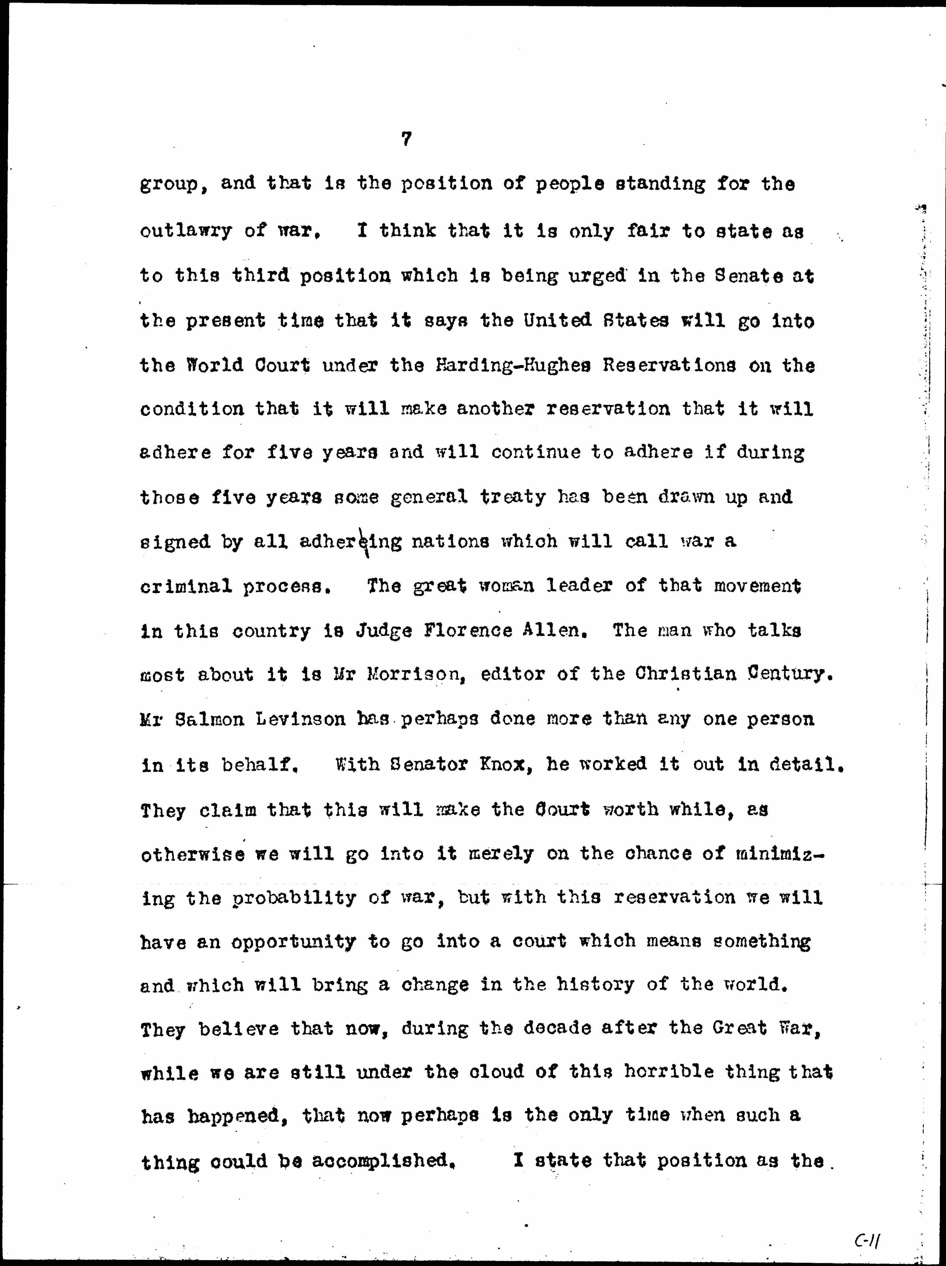 In the arguments pressing toward entrance and against entrance there are three distinct positions. I think you know Senator Borah’s position. I am sure we all respect him as a man of the highest integrity who is acting upon his convictions, who is doing right as God gives him to see the right, in the words of Lincoln. The second position is that taken by Senator Pepper, who now, in the Senate, and out of it, is advocating entrance into the Court. The third position is represented perhaps more by the citizens of Chicago than by any one [page 7] group, and that is the position of people standing for the outlawry of war. I think that it is only fair to state as to this third position which is being urged in the Senate at the present time that it says the United States will go into the World Court under the Harding-Hughes Reservations on the condition that it will make another reservation that it will adhere for five years and will continue to adhere if during those five years some general treaty has been drawn up and signed by all [adhering] nations which will call war a criminal process. The great woman leader of that movement in this country is Judge Florence Allen. The man who talks most about it is Mr Morrison, editor of the Christian Century. Mr Salmon Levinson has perhaps done more than any one person in its behalf. With Senator Knox, he worked it out in detail. They claim that this will make the Court [worthwhile], as otherwise we will go into it merely on the chance of minimizing the probability of war, but with this reservation we will have an opportunity to go into a court which means something and which will bring a change in the history of the world. They believe that now, during the decade after the Great War, while we are still under the cloud of this horrible thing that has happened, that now perhaps is the only time when such a thing could be accomplished. I state that as the [page 8] third position, which perhaps has not had a full hearing.