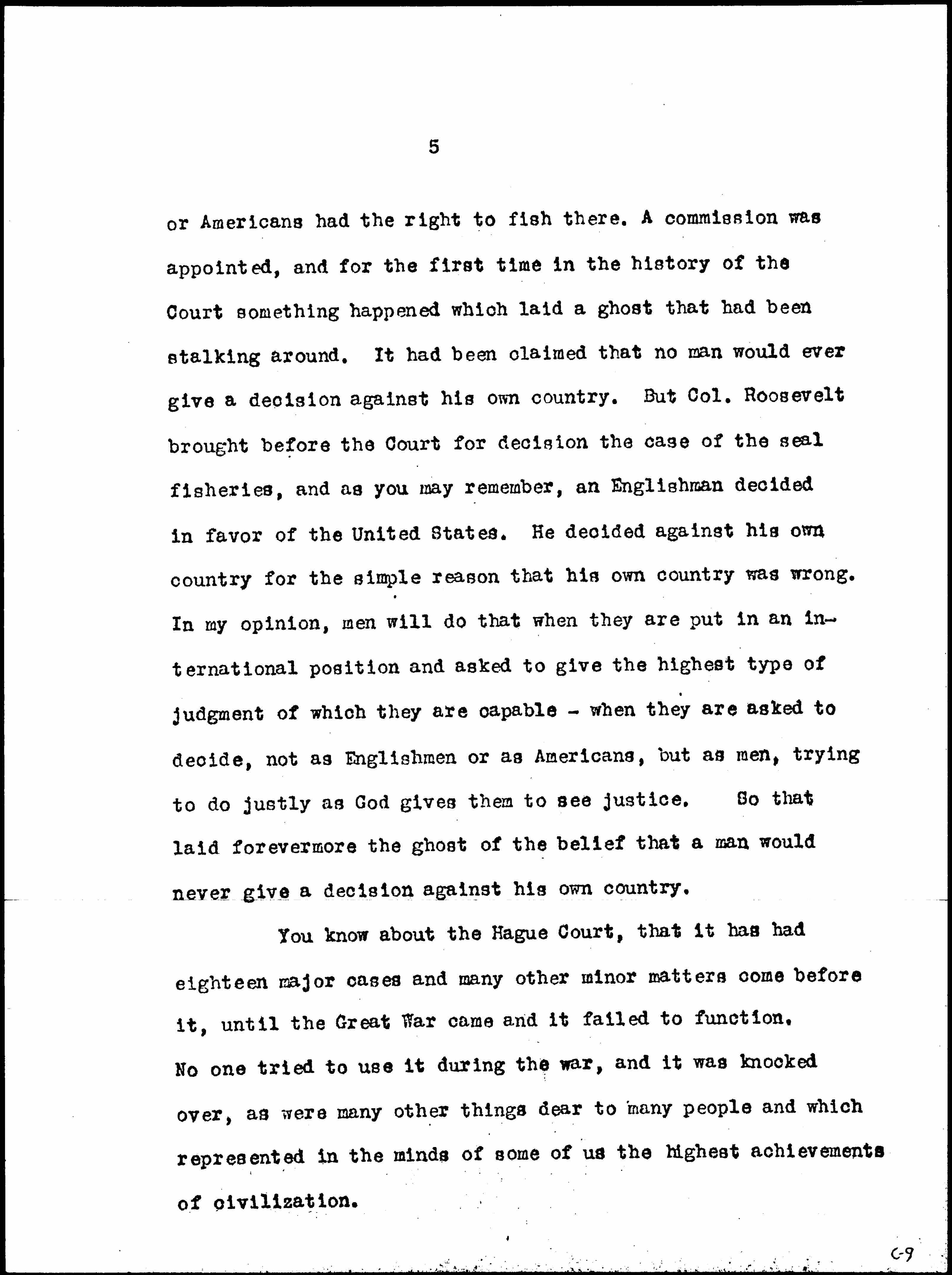 There was another remarkable thing connected with Col. Roosevelt and the Court. That was later, when he brought that case before it which had to do with determining the Seal Fisheries question in Alaska waters, whether Canadians [page 5] or Americans had the right to fish there. A commission was appointed, and for the first time in the history of the Court something happened which laid a ghost that had been stalking around. It had been claimed that no man would ever give a decision against his own country. But Col. Roosevelt brought before the Court for decision the case of the seal fisheries, and as you may remember, an Englishman decided in favor of the United States. He decided against his own country for the simple reason that his own country was wrong. In my opinion, men will do that when they are put in an international position and asked to give the highest type of judgment of which they are capable -- when they are asked to decide, not as Englishmen or as Americans, but as men, trying to do justly as God gives them to see justice. So that laid forevermore the ghost of the belief that a man would never give a decision against his own country.