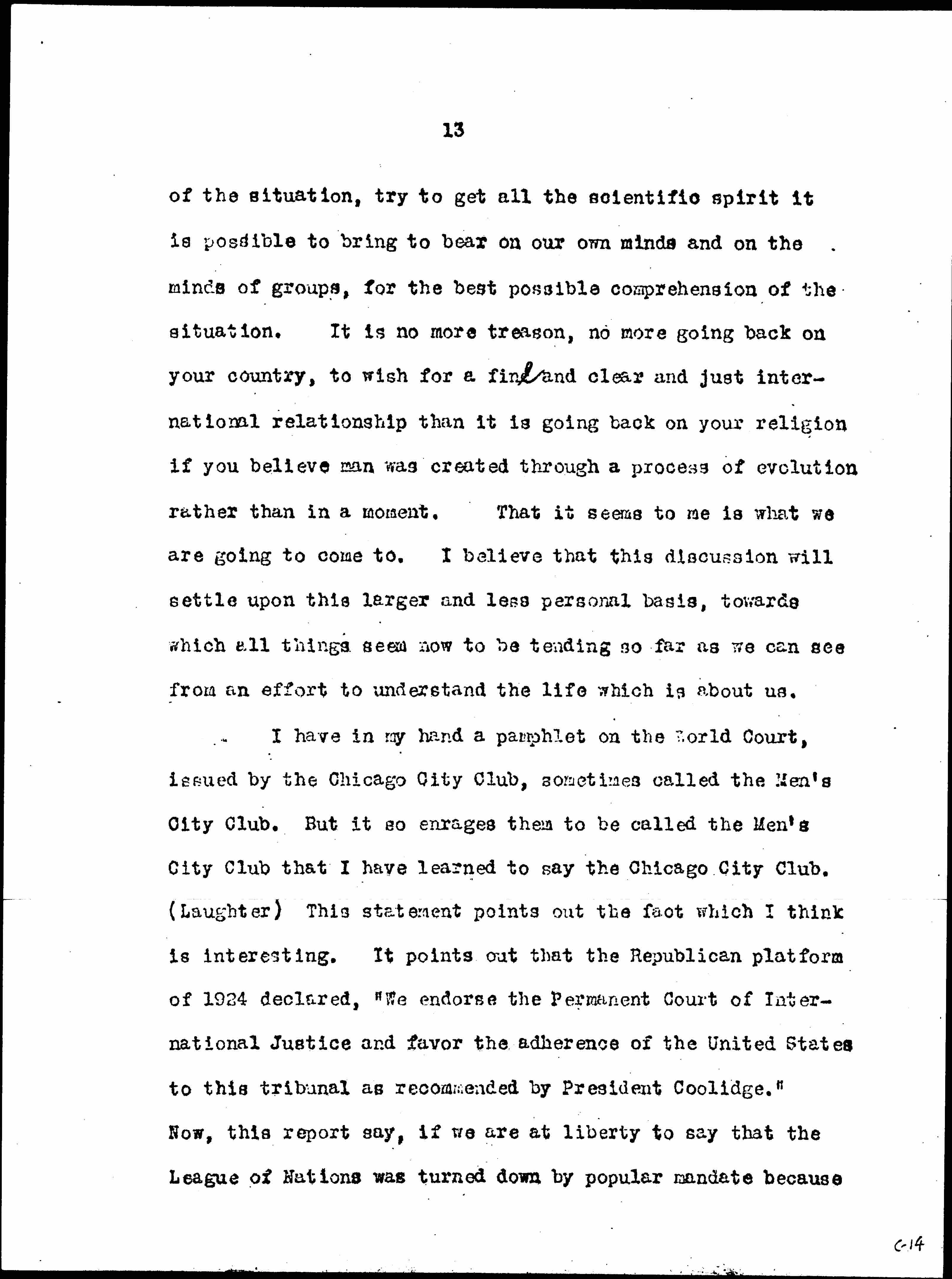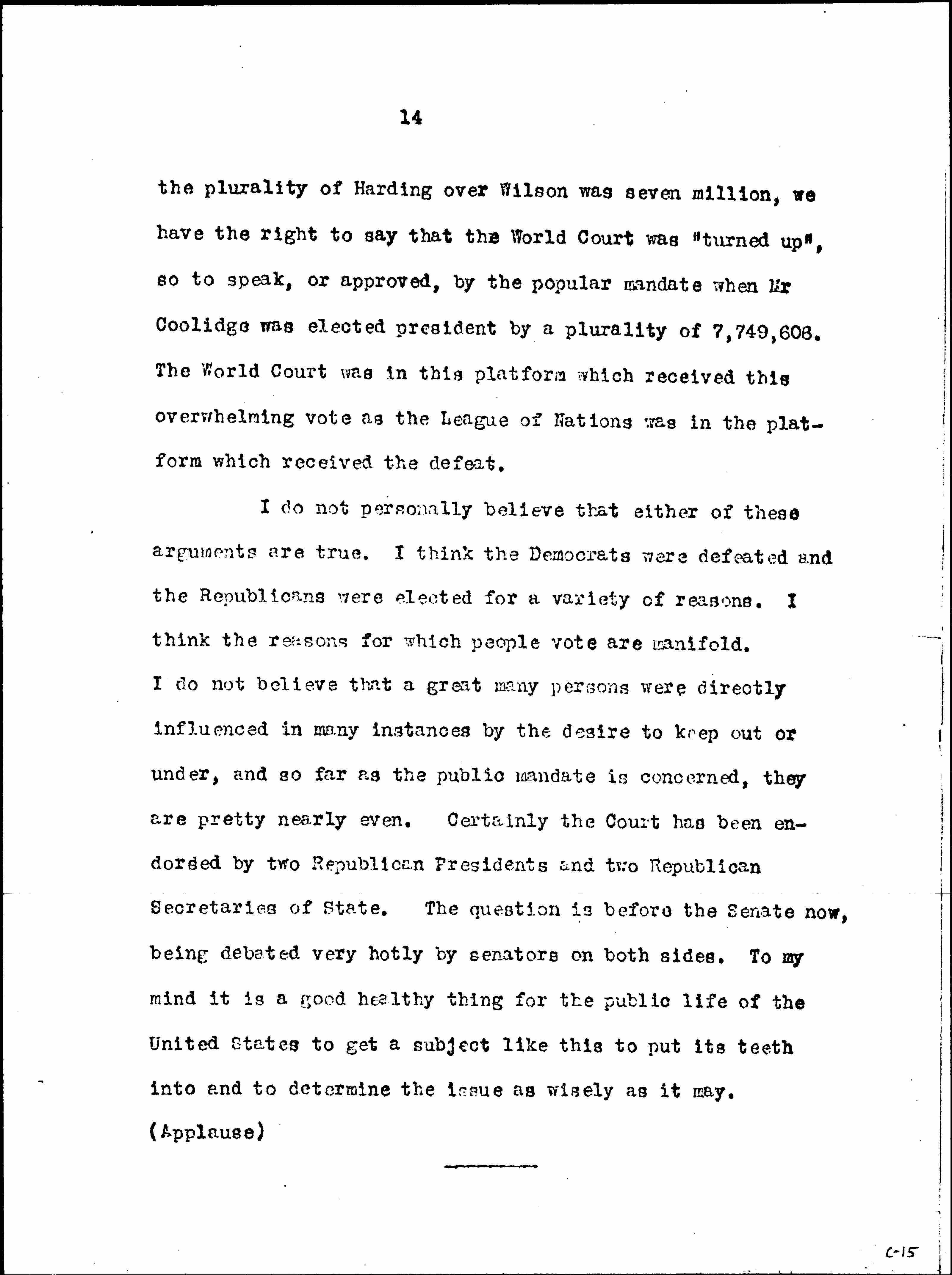 I have in my hand a pamphlet on the World Court, issued by the Chicago City Club, sometimes called the Men’s City Club. But it so enrages them to be called the Men’s City Club that I have learned to say the Chicago City Club. (Laughter) This statement points out the fact which I think is interesting. It points out that the Republican platform of 1924 declared, “We endorse the Permanent Court of International Justice and favor the adherence of the United States to this tribunal as recommended by President Coolidge.” Now, this report say, if we are at liberty to say that the League of Nations was turned down by popular mandate because [page 11] the plurality of Harding over Wilson was seven million, we have the right to say that the World Court was “turned up,” so to speak, or approved, by the popular mandate when Mr Coolidge was elected president by a plurality of 7,749,606. The World Court was in this platform which received this overwhelming vote as the League of Nations was in the platform which received the defeat.