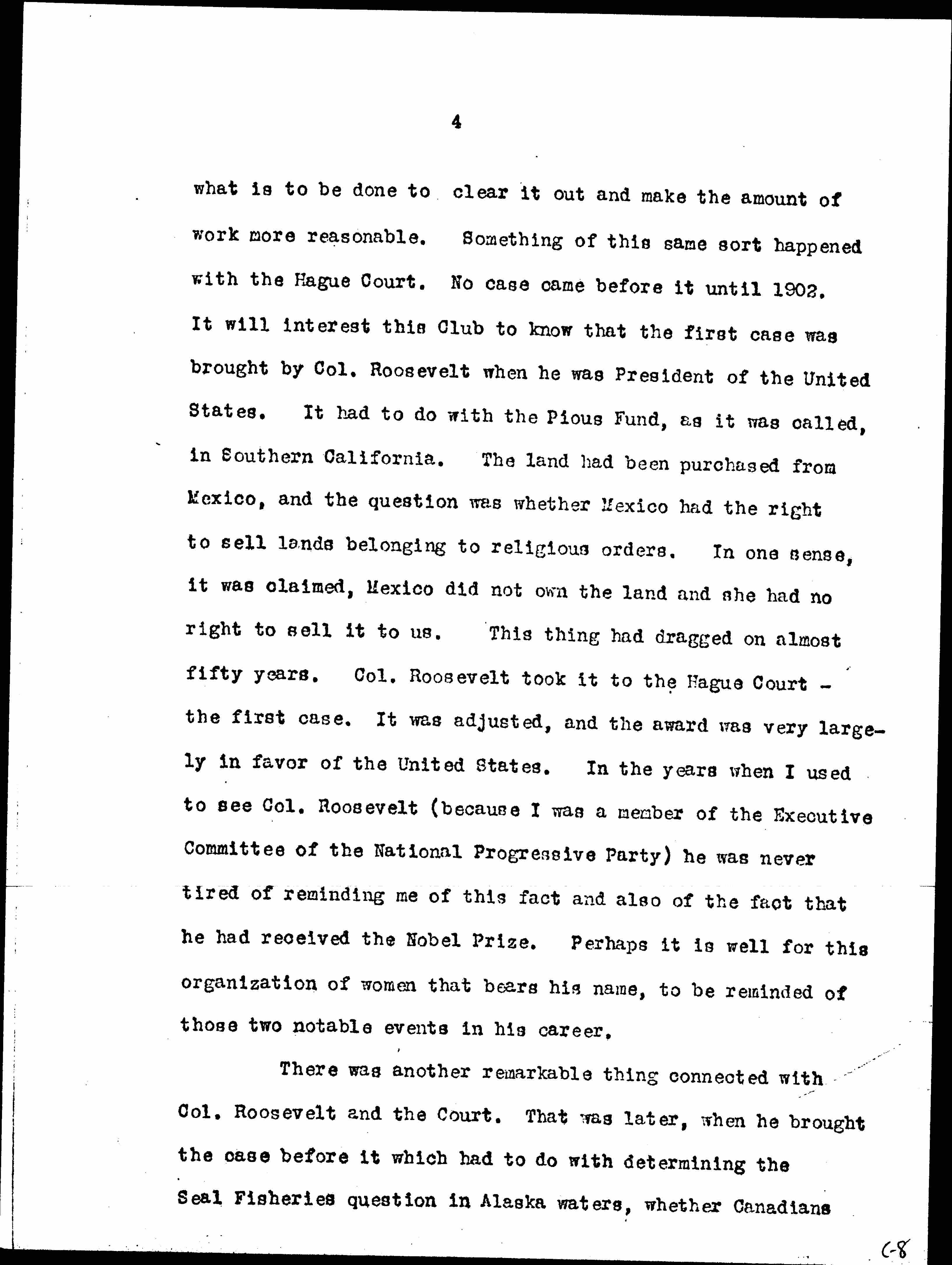 It was with it much the same as with our own Supreme Court in the United States when it was organized and bid to meet every February and August. It met first in February 1790, and then in August 1790; then it met in February 1791, and in August 1791, and in February 1792; and not a single case was brought before it until it met in August 1792. While now, as you know, its calendar is so crowded that it is a great question [page 4] what is to be done to clear it out and make the amount of work more reasonable. Something of this same sort happened with the Hague Court. No case came before it until 1902. It will interest this Club to know that the first case was brought by Col. Roosevelt when he was President of the United States. It had to do with the Pious Fund, as it was called, in Southern California. The land had been purchased from Mexico, and the question was whether Mexico had the right to sell lands belonging to religious orders. In one sense, it was claimed, Mexico did not own the land and she had no right to sell it to us. This thing had dragged on almost fifty years. Col. Roosevelt took it to the Hague Court -- the first case. It was adjusted, and the award was very largely in favor of the United States. In the years when I used to see Col. Roosevelt (because I was a member of the Executive Committee of the National Progressive Party) he was never tired of reminding me of this fact and also of the fact that he had received the Nobel Prize. Perhaps it is well for this organization of women that bears his name, to be reminded of those two notable events in his career.