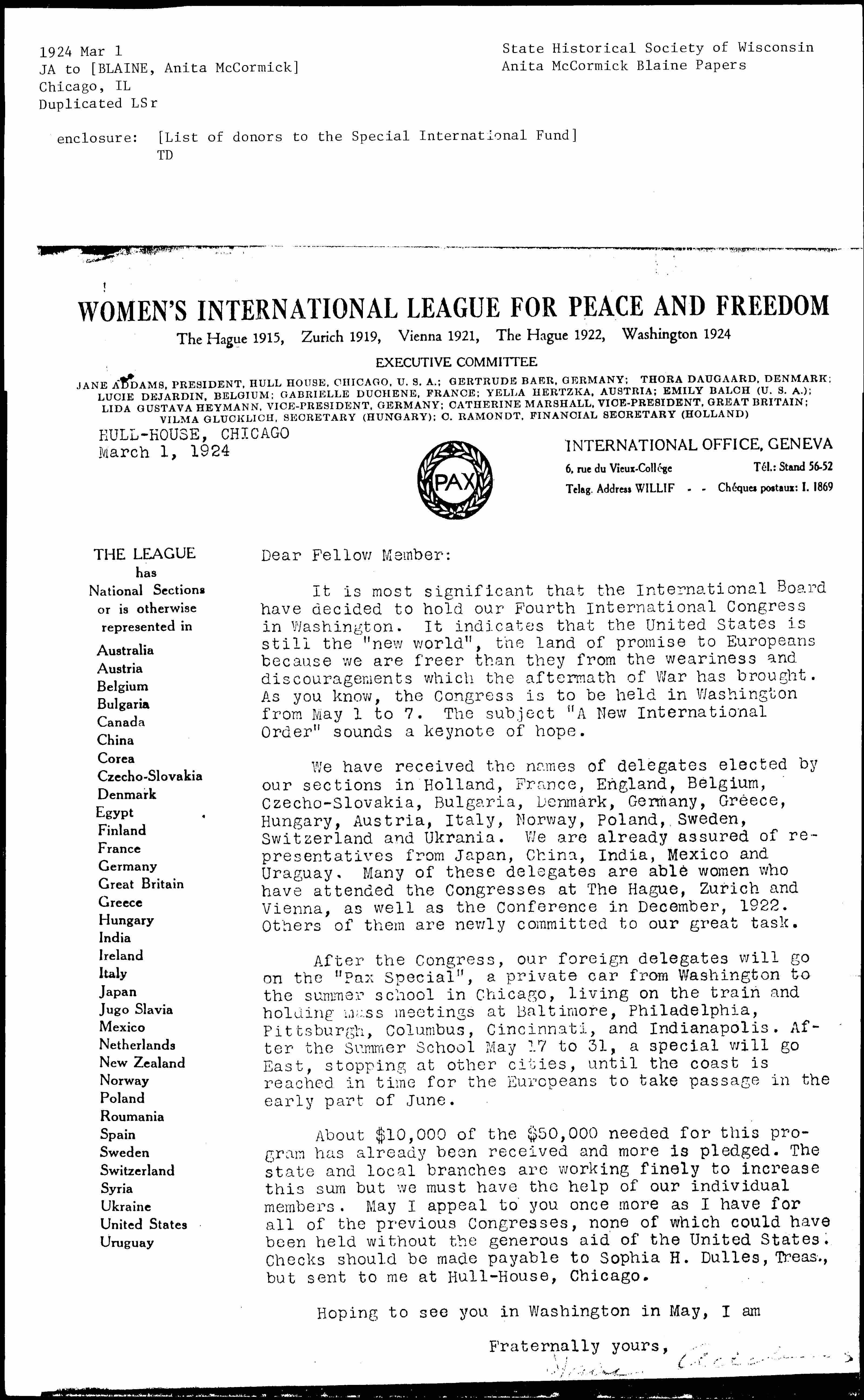 About $10,000 of the $50,000 needed for this program has already been received and more is pledged. The state and local branches are working finely to increase this sum but we must have the help of our individual members. May I appeal to you once more as I have for all of the previous Congresses, none of which could have been held without the generous aid of the United States. Checks should be made payable to Sophia H. Dulles, Treas., but sent to me at Hull-House, Chicago.