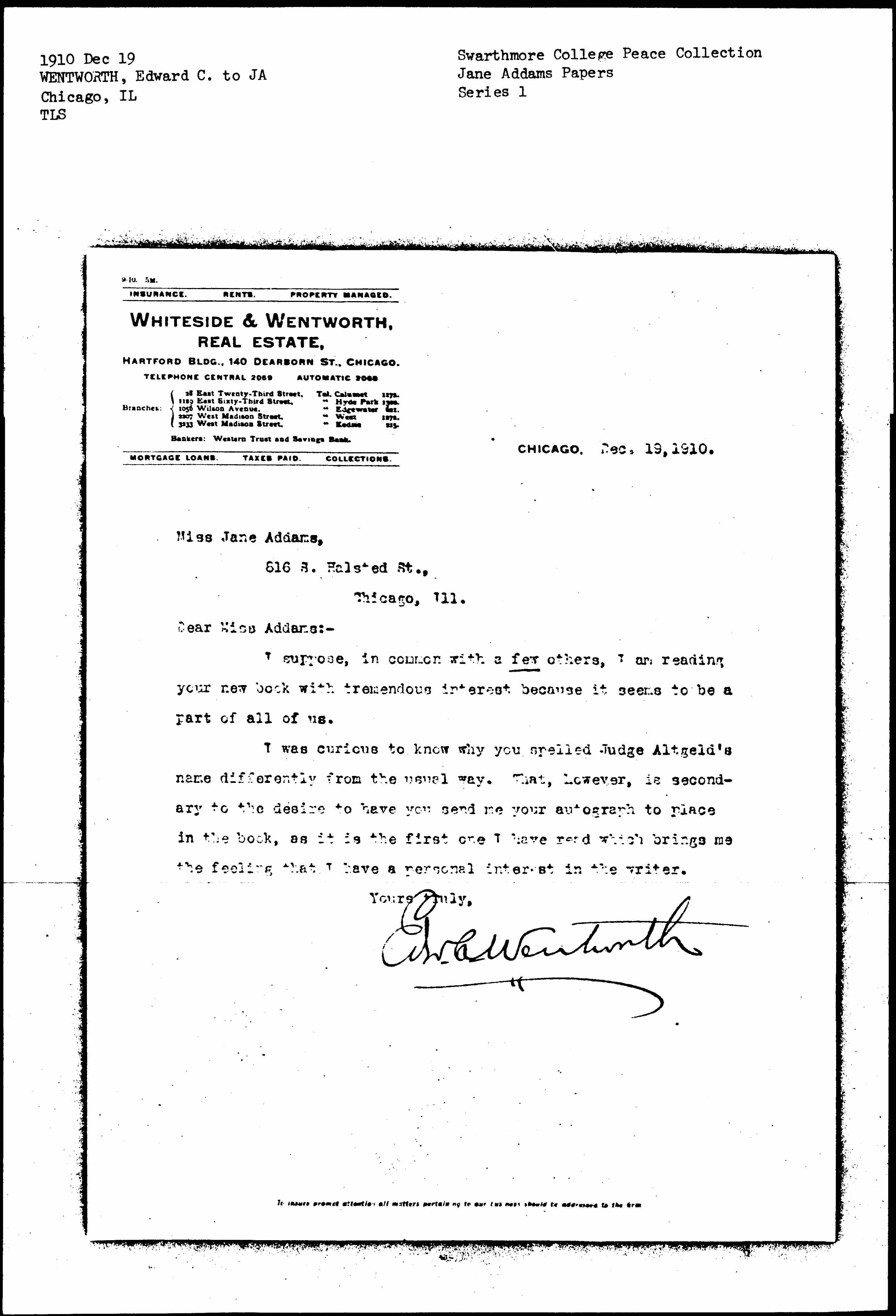 I was curious to know why you spelled Judge Altgeld's name differently from the usual way. That, however, is secondary to the desire to have you send me your autograph to place in the book, as it is the first one I have read which brings me the feeling that I have a personal interest in the writer.