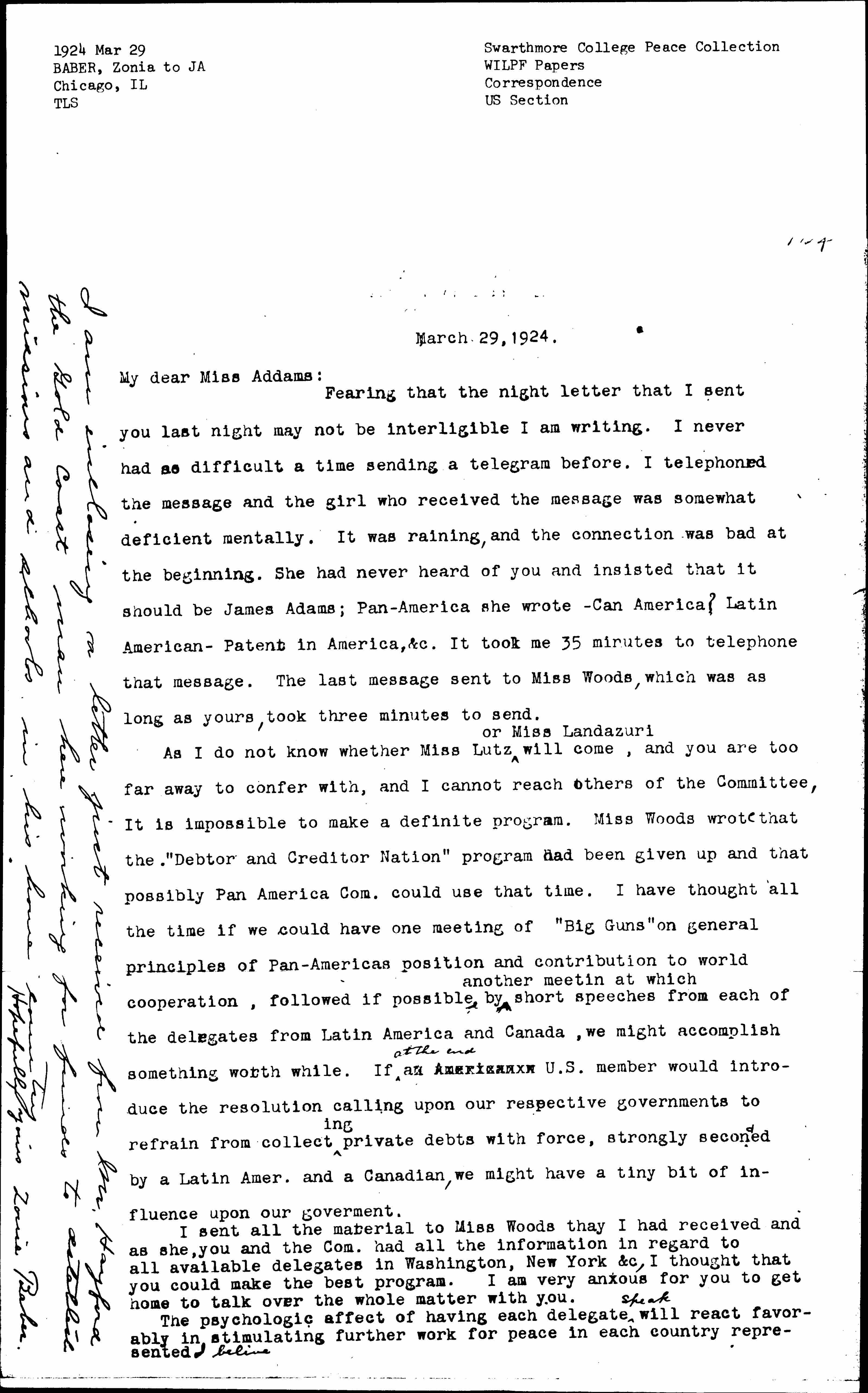 As I do not know whether Miss Lutz ↑or Miss Landázuri↓ will come, and you are too far away to confer with, and I cannot reach others of the Committee. It is impossible to make a definite program. Miss Woods wrote that the "Debtor and Creditor Nation" program had been given up and that possibly Pan America Com. could use that time. I have thought all the time if we could have one meeting of "Big Guns" on general principles of Pan-Americas position and contribution to world cooperation, followed if possible by ↑another [meeting] at which↓ short speeches from each of the delegates from Latin America and Canada, we might accomplish something worth while. If ↑at the end↓ [an American] a U.S. member would introduce the resolution calling upon our respective governments to refrain from collecting private debts with force, strongly seconded by a Latin Amer. and a Canadian, we might have a tiny bit of influence upon our [government].