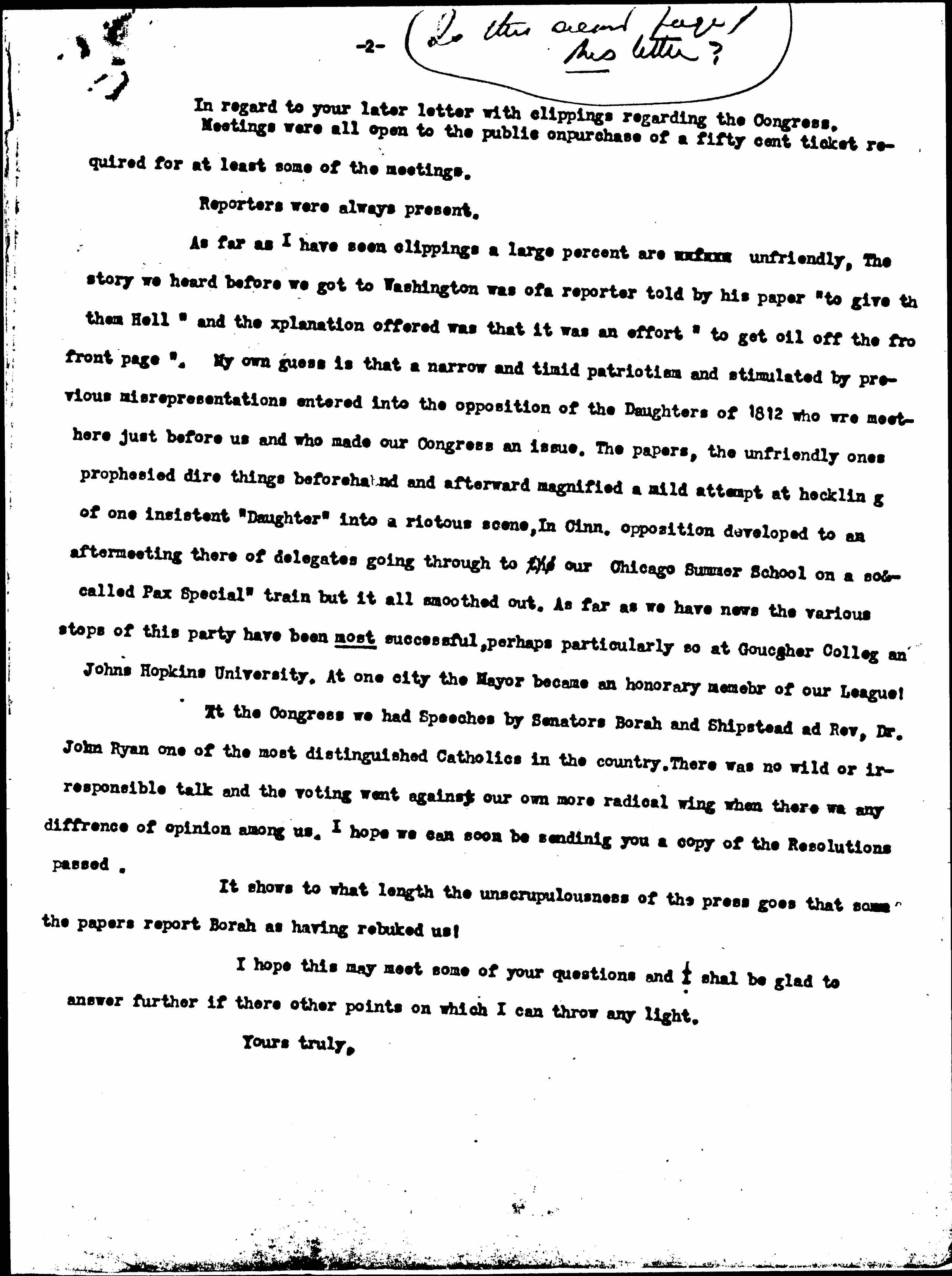 I think Mrs. Mead, 89 Euston St., Brookline, Mass., could get you a copy of the Decatur report and tell you all about that affair. I mean Mrs. Lund's amazing proposal that the N.C.W. should investigate its sister organizations. [page 2]In regard to your later letter with clippings regarding the Congress. Meetings were all open to the public on purchase of a fifty cent ticket required for at least some of the meetings.