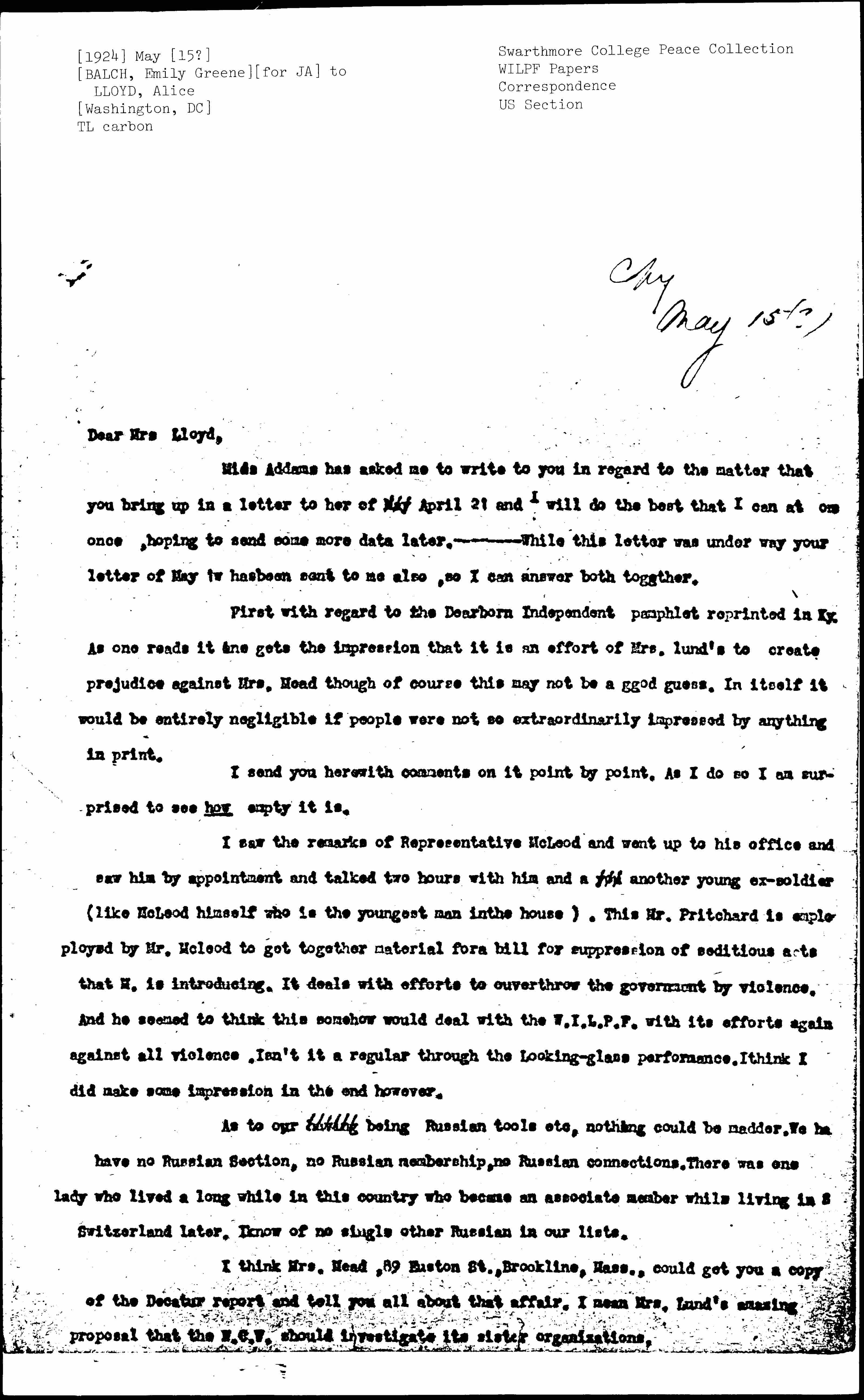 I saw the remarks of Representative McLeod and went up to his office and saw him by appointment and talked two hours with him and a you another young ex-soldier (like McLeod himself who is the youngest man in the house). This Mr. Pritchard is employed by Mr. McLeod to get together material for a bill for suppression of seditious acts that M. is introducing. It deals with efforts to [overthrow] the government by violence. And he seemed to think this somehow would deal with the W.I.L.P.F. with its efforts again against all violence. Isn't it a regular through the Looking-glass performance. I think I did make some impression in the end however.