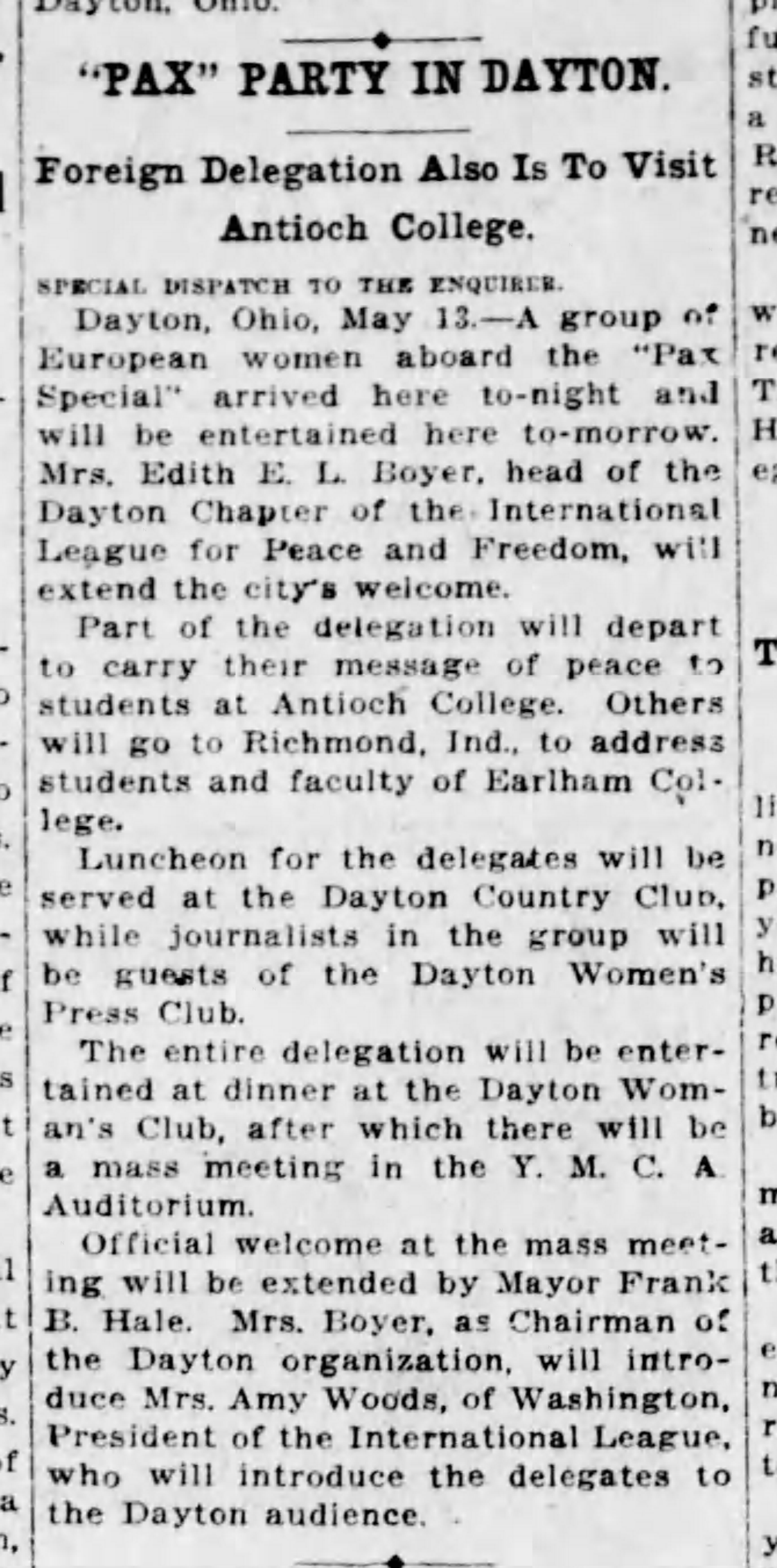 Dayton, Ohio, May 13. -- A group of European women aboard the "Pax Special" arrived here [tonight] and will be entertained here [tomorrow]. Mrs. Edith E. L. Boyer, head of the Dayton Chapter of the International League for Peace and Freedom, will extend the city's welcome.
