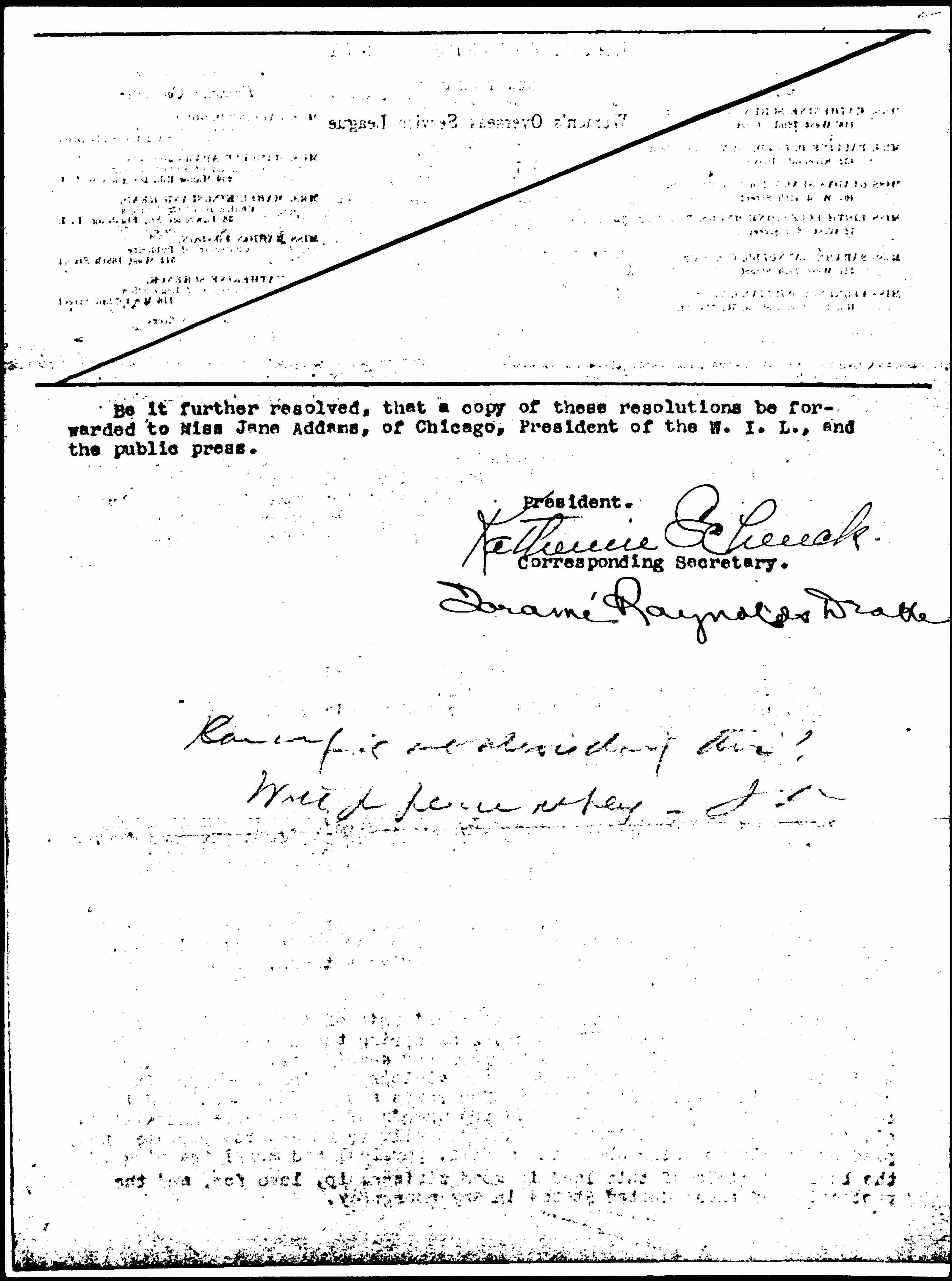 Be it further resolved, that a copy of these resolutions be forwarded to Miss Jane Addams, of Chicago, President of the W.I.L., and the public press.