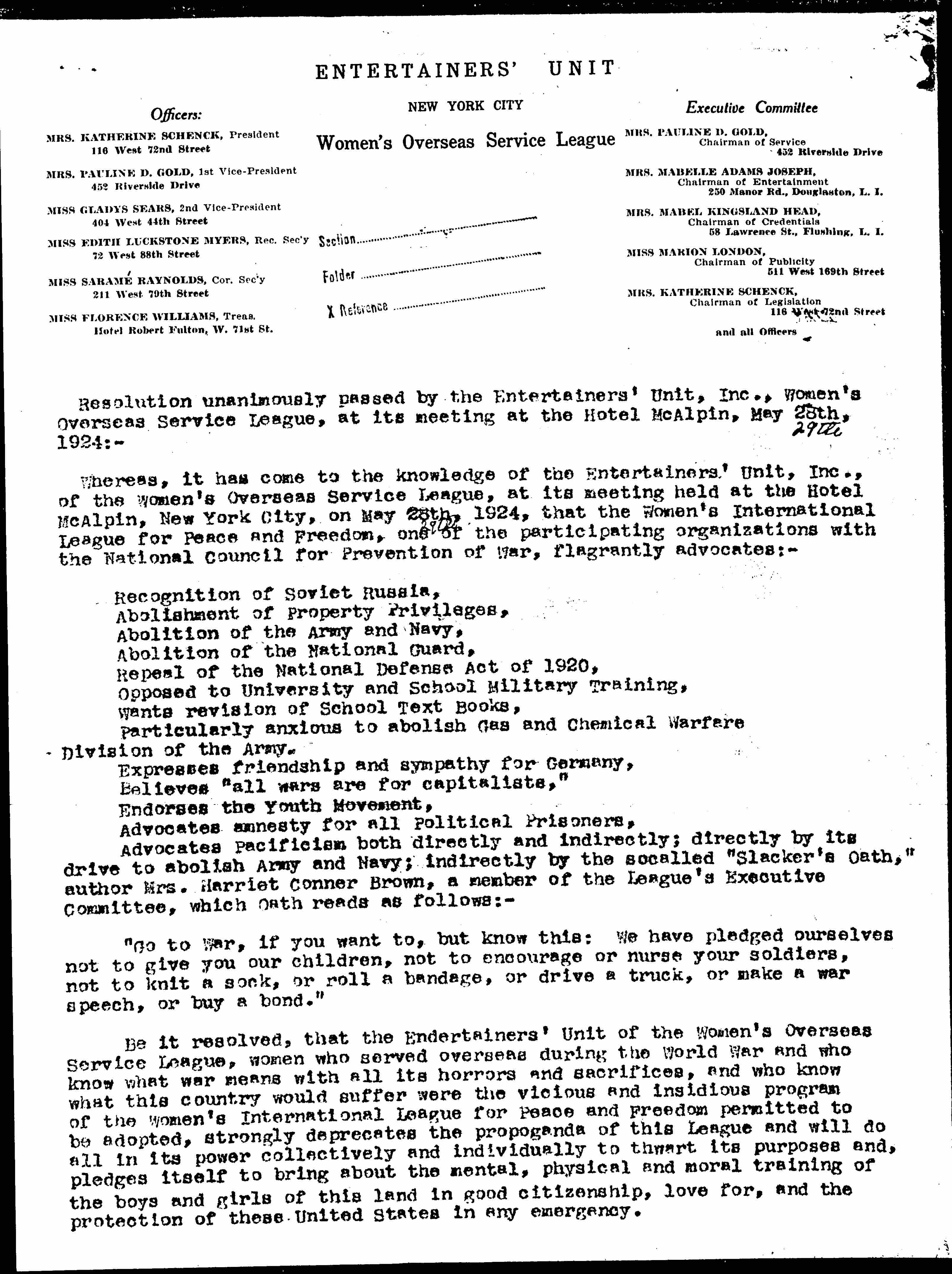 Whereas, it has come to the knowledge of the Entertainers' Unit, Inc., of the Women's Overseas Service League, at its meeting held at the Hotel McAlpin, New York City, on May 28th ↑29th↓, 1924, that the Women's International League for Peace and Freedom, one of the participating organizations with the National Council for Prevention of War, flagrantly advocates: --