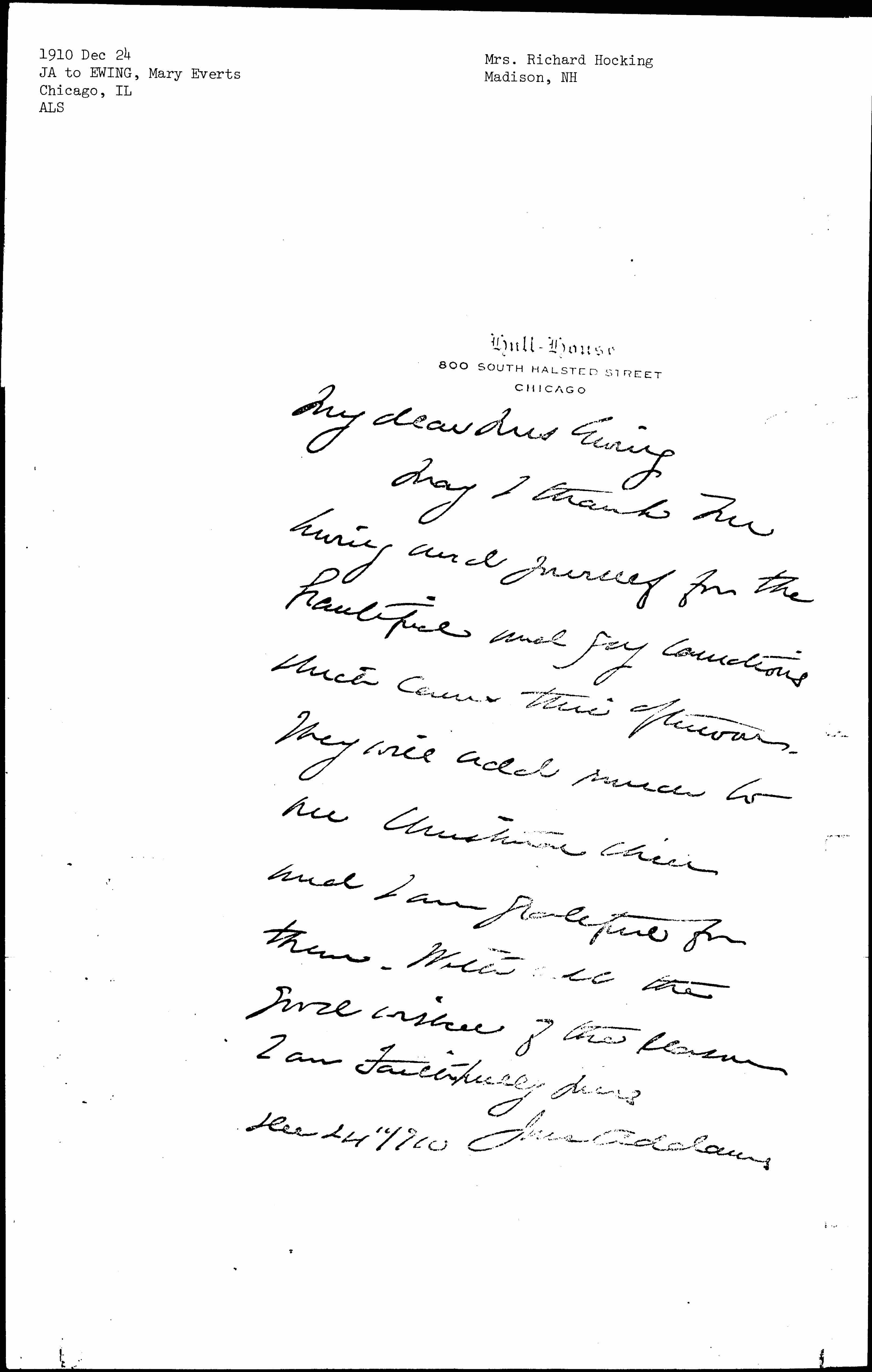 May I thank Mr. Ewing and yourself for the beautiful and gay carnations which came this afternoon. They will add much to our Christmas cheer and I am grateful for them. With all the good wishes of the season