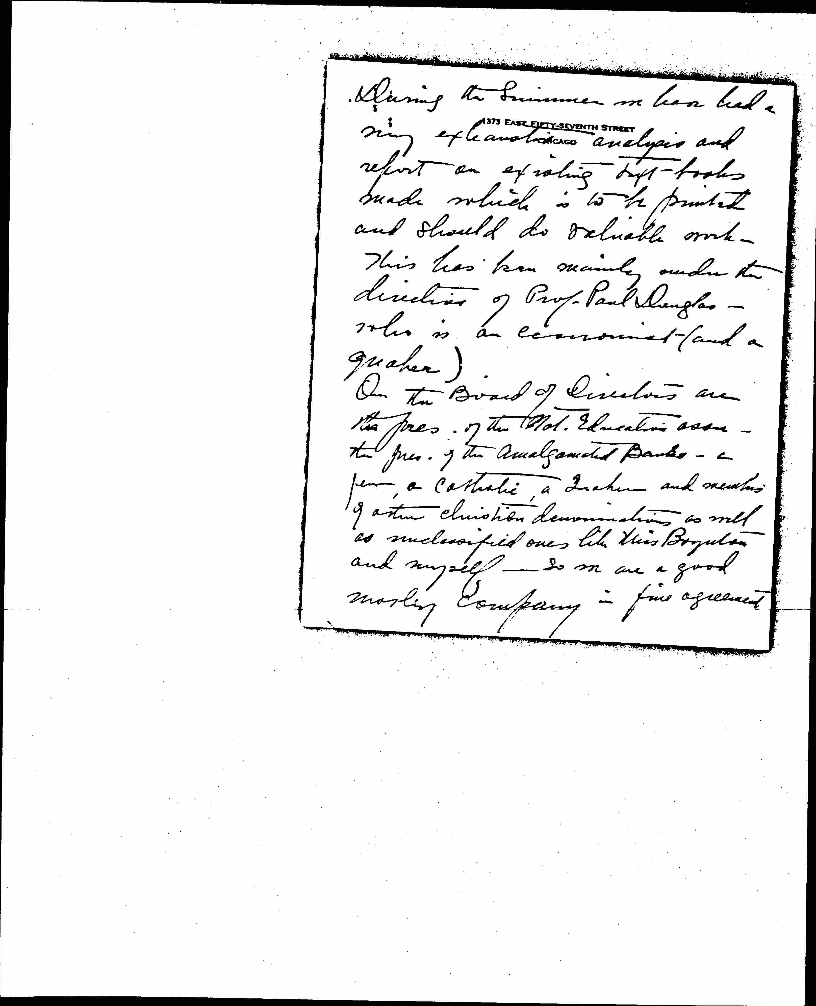 During the Summer we have had a very exhausting analysis and report on existing text-books made which is to be printed and should do valuable work. This has been mainly under the direction of Prof. Paul Douglas -- who is an economist (and a Quaker).