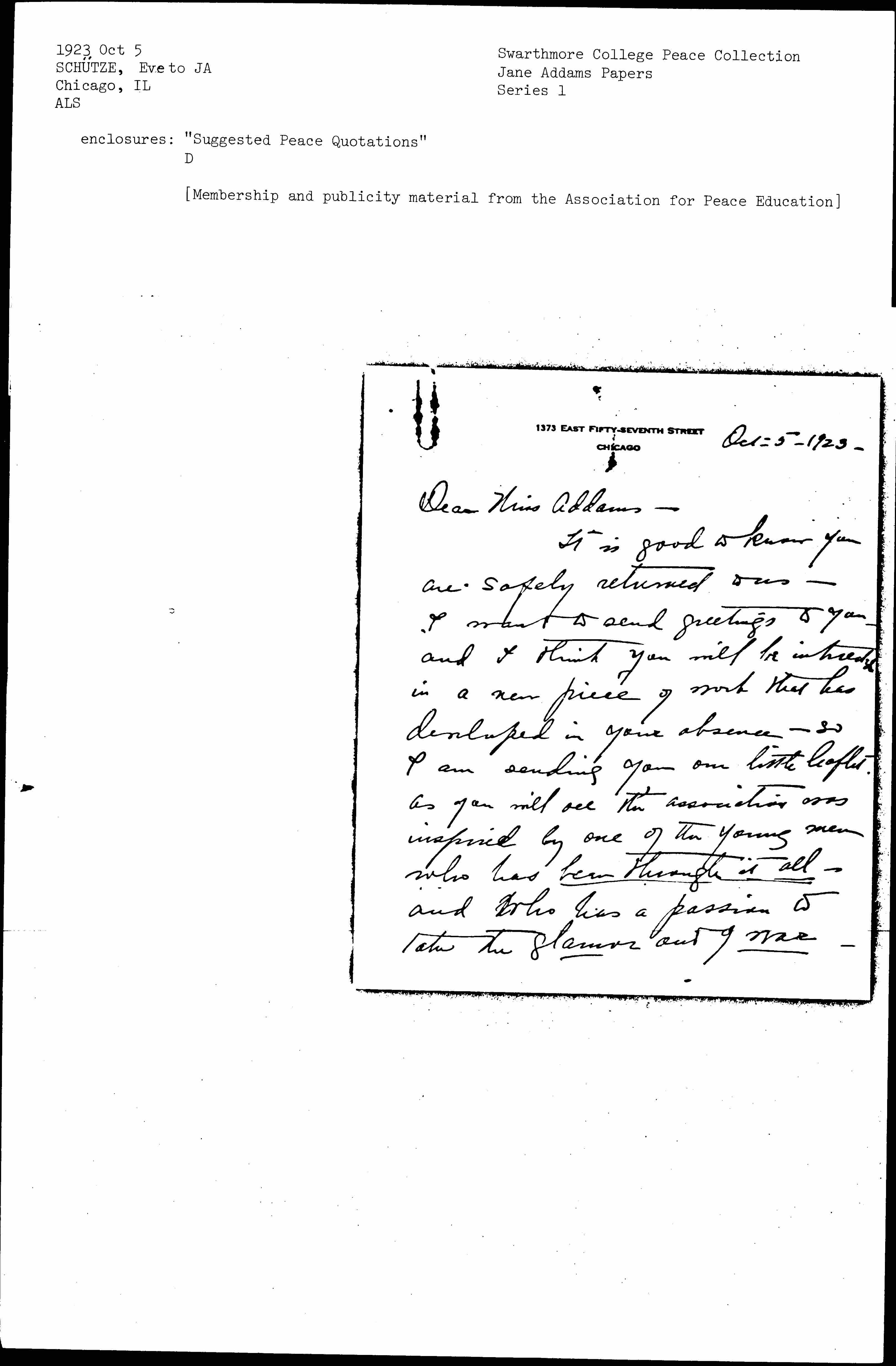 It is good to know you are safely returned to us -- I want to send greetings to you -- and I think you will be interested in a new piece of work that has developed in your absence-- so I am sending you our little leaflet. As you will see the association was inspired by one of the young men who has been through it all -- and who has a passion to take the glamor out of war [page 2] to have the truth about it taught to little children, so no image of glory would [rise] before them again as the word "War," as it always did in his childhood and youth. It has seemed to me the answer to the thing we could not find the way to do in 1915 -- and here is a young and fearless voice speaking out of his horrible experience -- and able to reach members of the legion -- the churches, and other backward (!) people -- because he has been in it.