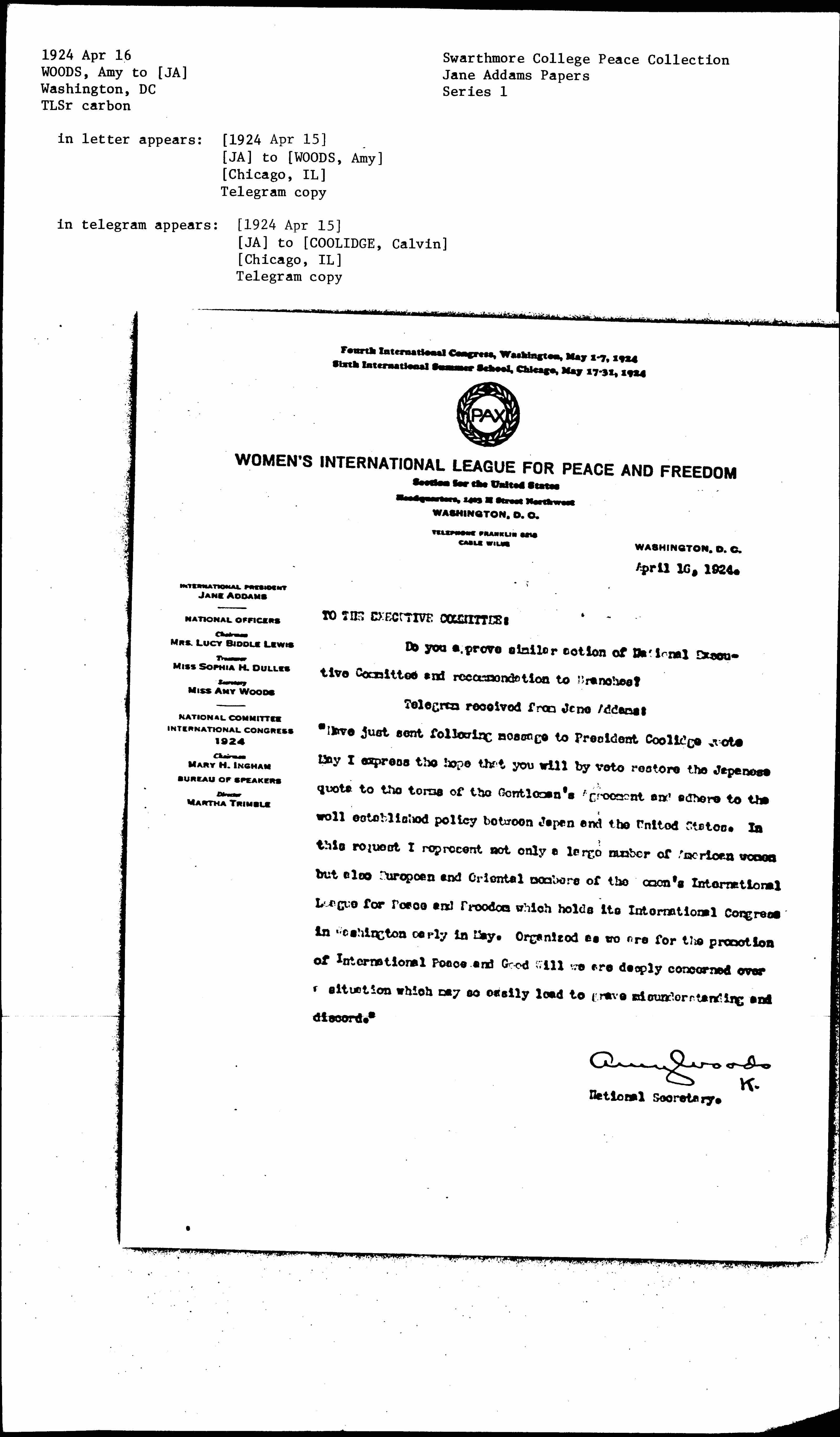 "Have just sent following message to President Coolidge wrote May I express the hope that you will by veto restore the [Japanese] quota to the terms of the Gentlemen's Agreement and adhere to the [well-established] policy between Japan and the United States. In this request I represent not only a large number of American women but also European and Oriental members of the Women's International League for Peace and Freedom which holds its International Congress in Washington early in May. Organized as we are for the promotion of International Peace and Good Will we are deeply concerned over [a] situation which may so easily lead to grave misunderstanding and discord."