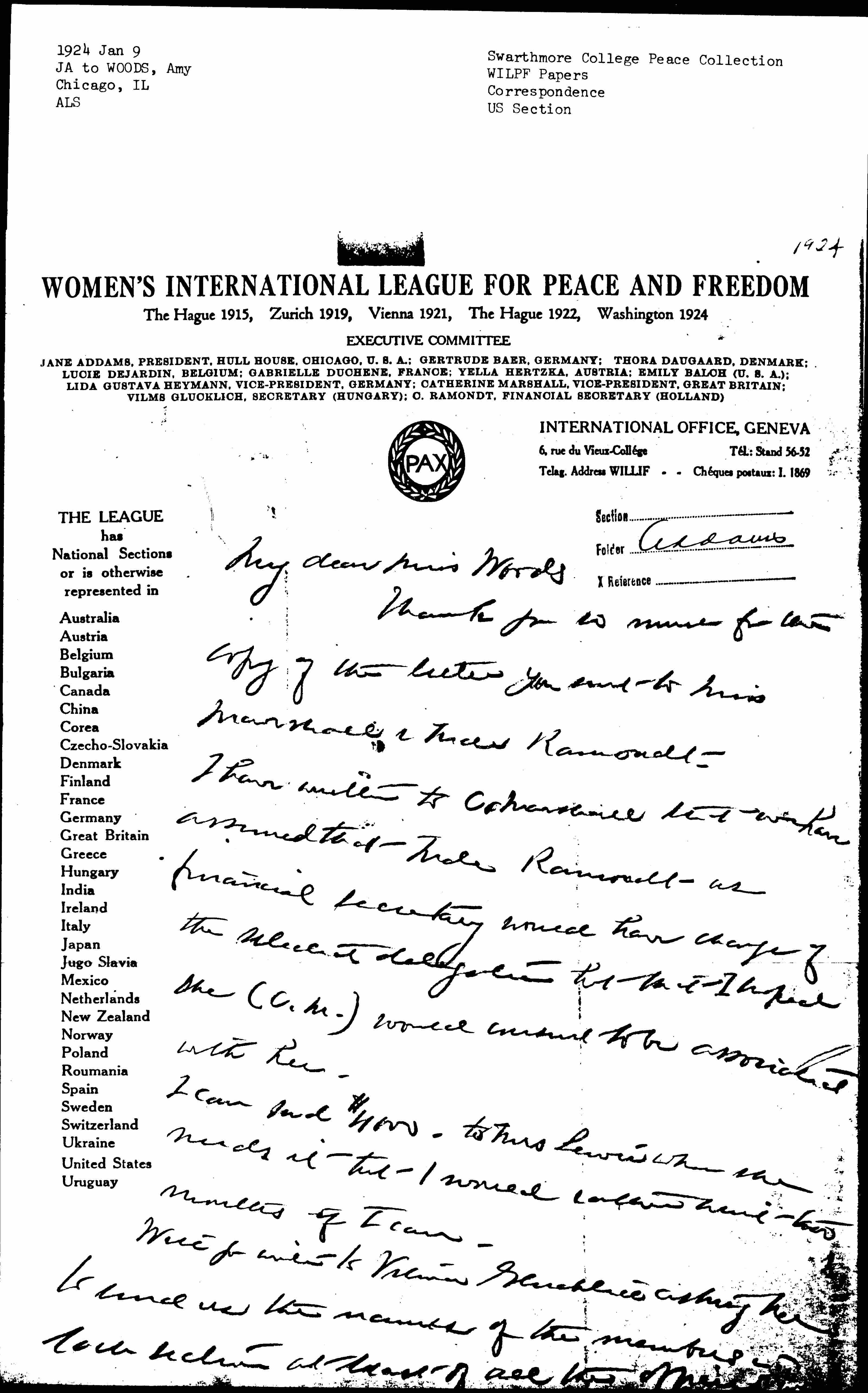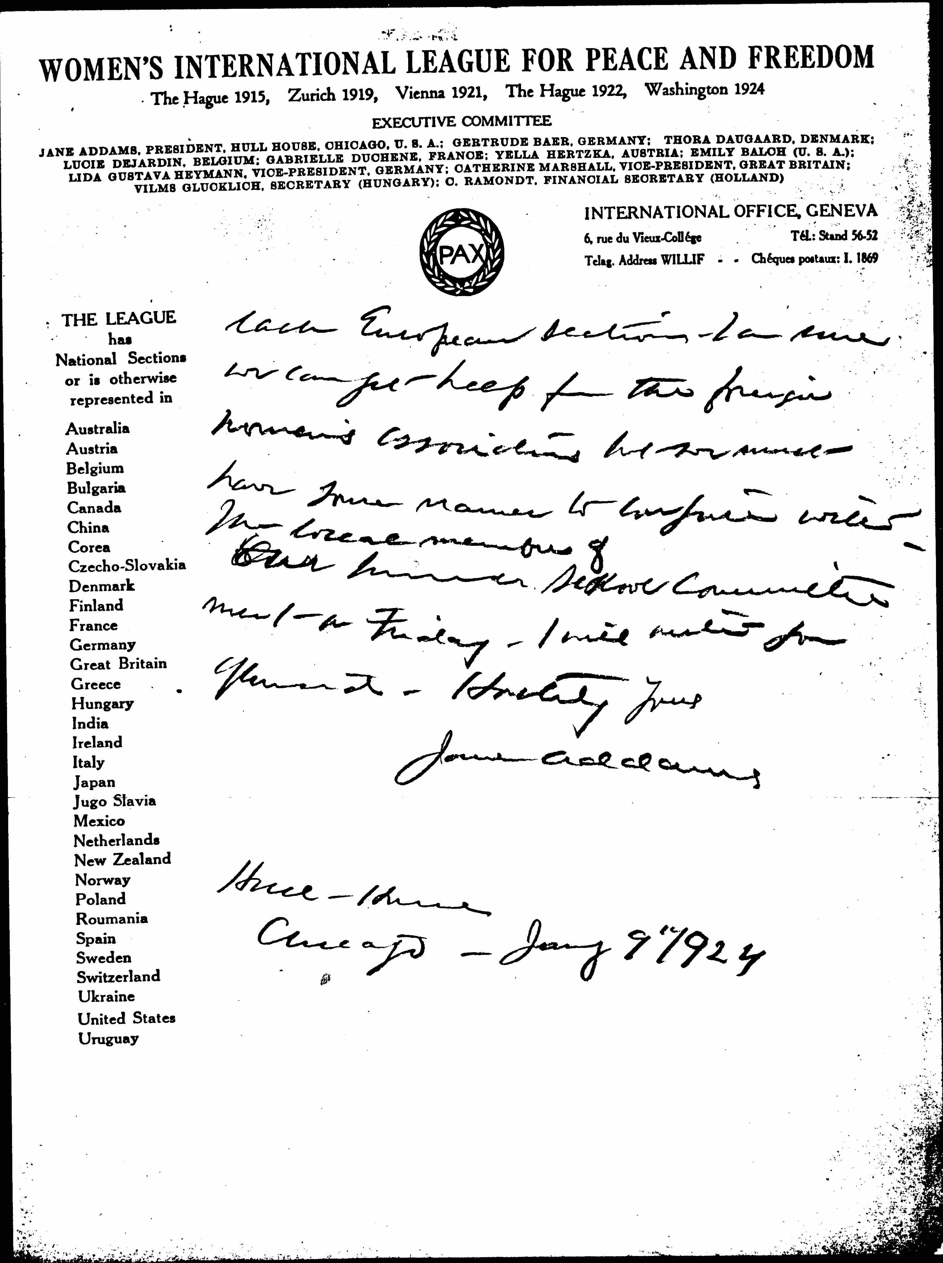 Will you write to Vilma Glücklich asking her to send us the names of the members of each section at least of all the official [page 2] each European section. I am sure we can get help from the foriegn women's associations but we must have some names to compare with.