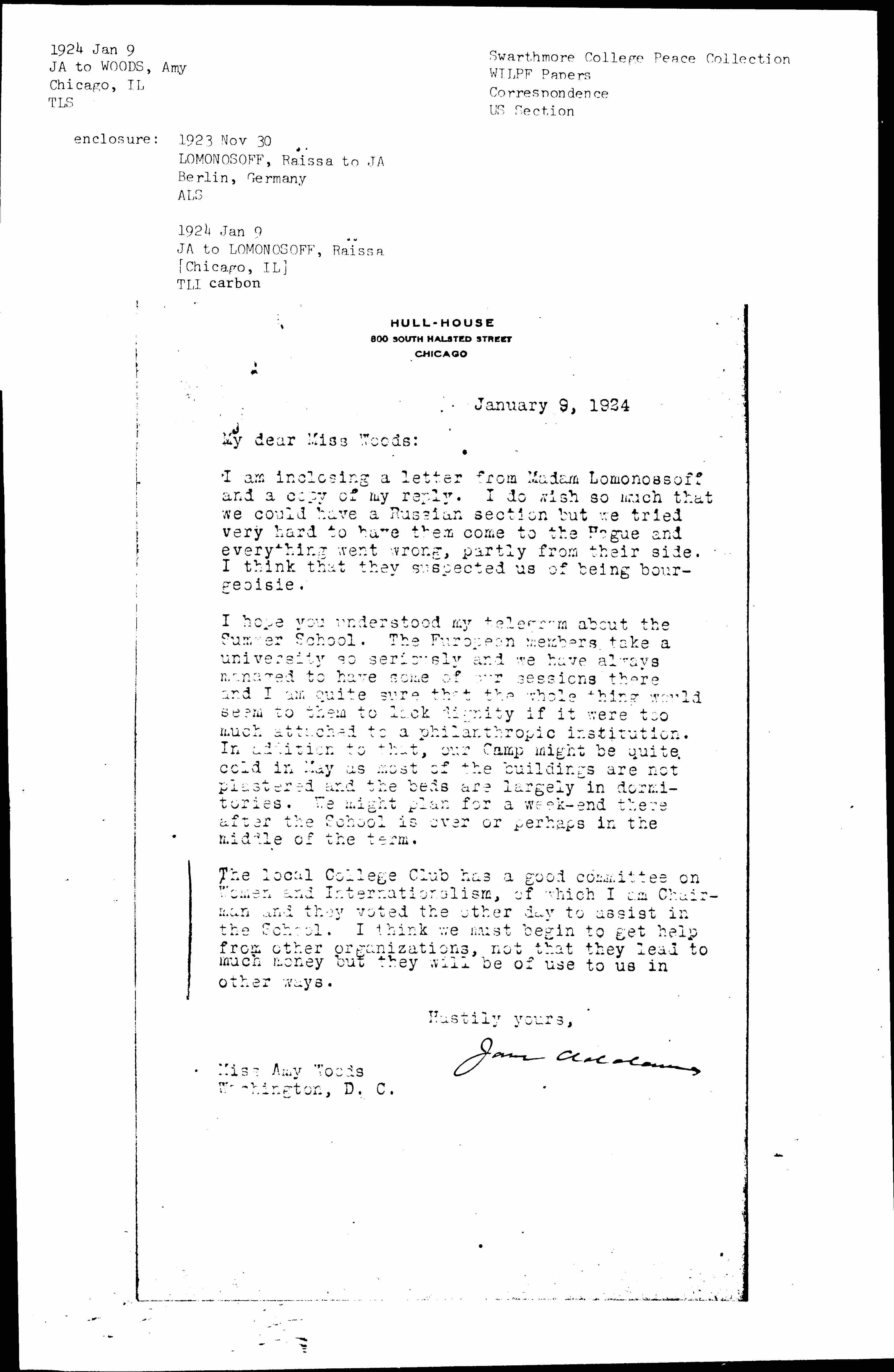 I am [enclosing] a letter from Madam [Lomonosoff] and a copy of my reply. I do wish so much that we could have a Russian section but we tried very hard to have them come to the Hague and everything went wrong, partly from their side. I think that they suspected us of being bourgeoisie.