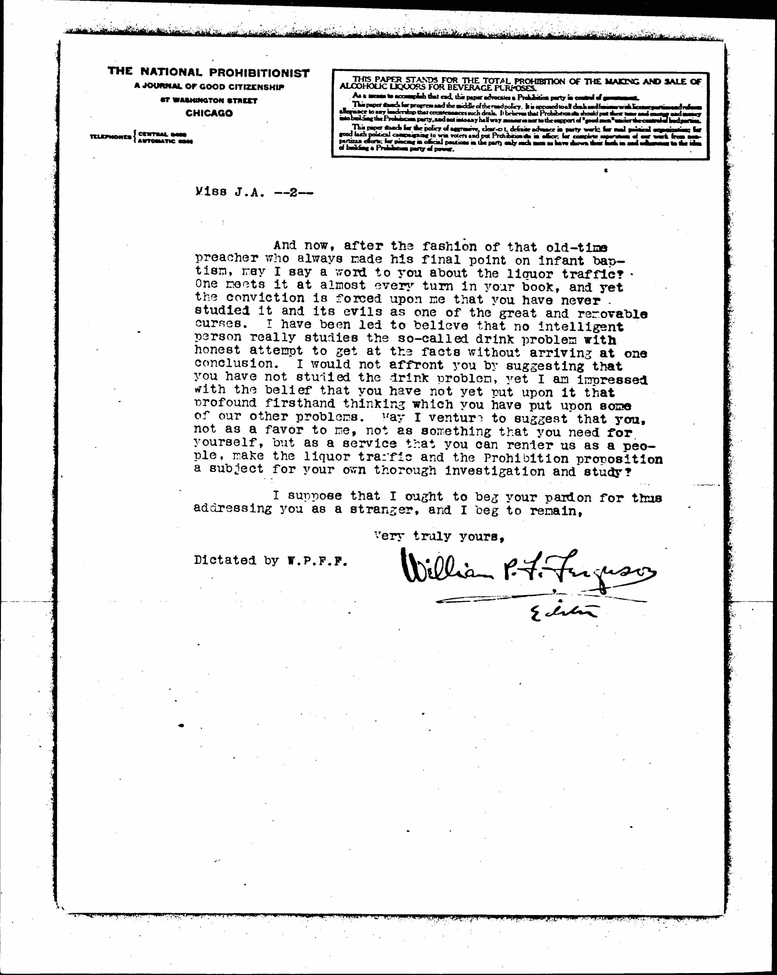 And now, after the fashion of that old-time preacher who always made his final point on infant baptism, may I say a word to you about the liquor traffic? One meets it at almost every turn in your book, and yet the conviction is forced upon me that you have never studied it and its evils as one of the great and removable curses. I have been led to believe that no intelligent person really studies the so-called drink problem with honest attempt to get at the facts without arriving at one conclusion. I would not affront you by suggesting that you have not studied the drink problem, yet I am impressed with the belief that you have not yet put upon it that profound firsthand thinking which you have put upon some of our other problems. May I venture to suggest that you, not as a favor to me, not as something that you need for yourself, but as a service that you can render us as a people, make the liquor traffic and the Prohibition proposition a subject for your own thorough investigation and study?