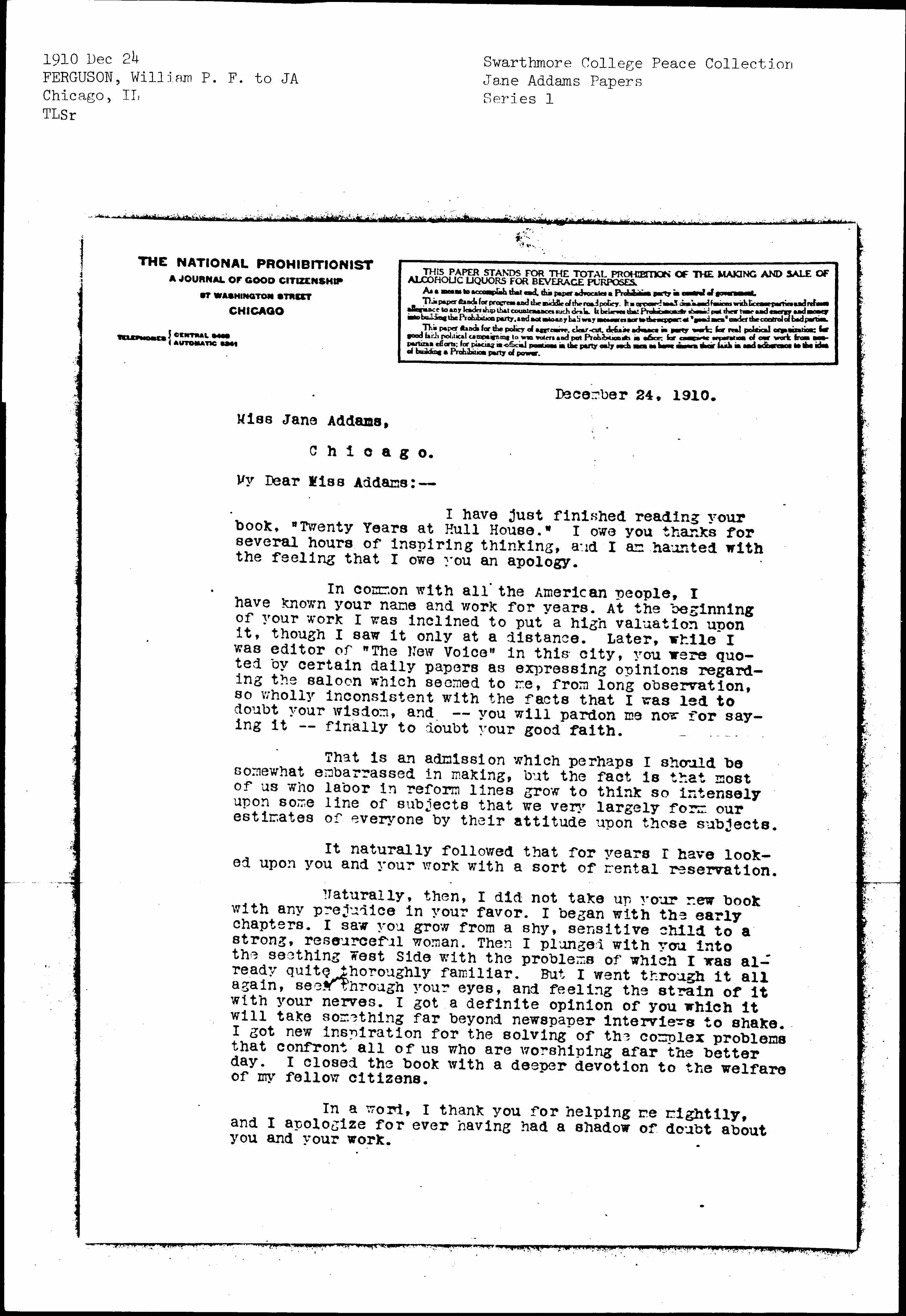 I have just finished reading your book, "Twenty Years at Hull House." I owe you thanks for several hours of inspiring thinking, and I am haunted with the feeling that I owe you an apology.