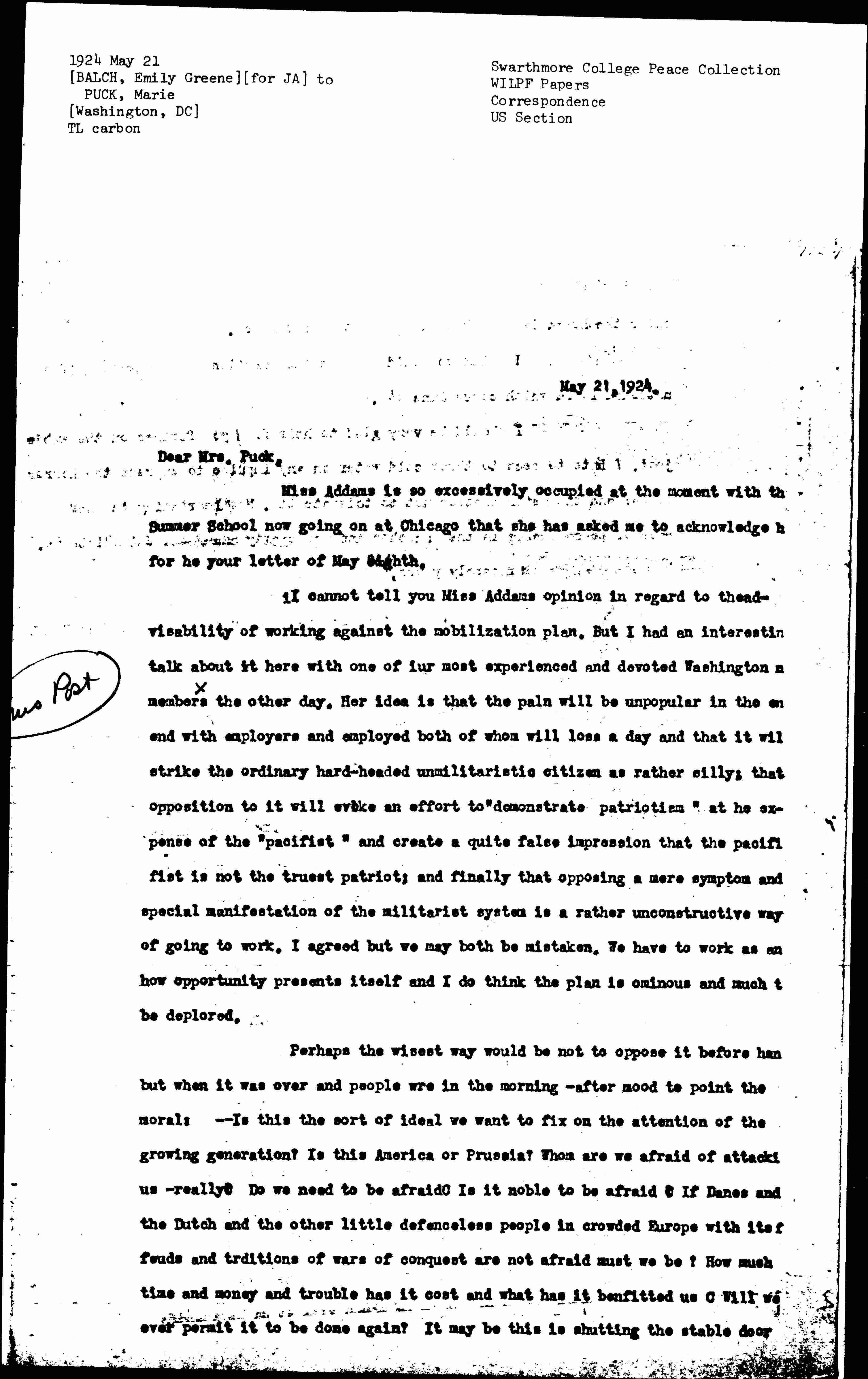 Miss Addams is so excessively occupied at the moment with [the] Summer School now going on at Chicago that she has asked me to acknowledge for [her] your letter of May eighth. I cannot tell you Miss Addams opinion in regard to the advisability of working against the mobilization plan. But I had [an] interesting talk about it here with one of our most experienced and devoted Washington members↑x↓ the other day. Her idea is that the plan will be unpopular in the end with employers and employed both of whom will [lose] a day and that it [will] strike the ordinary hard-headed unmilitaristic citizen as rather silly; that opposition to it will evoke an effort to "demonstrate patriotism" at [the] expense of the "pacifist" and create a quite false impression that the [pacifist] is not the truest patriot; and finally that opposing a mere symptom and special manifestation of the militarist system is a rather unconstructive way of going to work. I agreed but we may both be mistaken. We have to work as [and?] how opportunity presents itself and I do think the plan is ominous and much [to] be deplored.