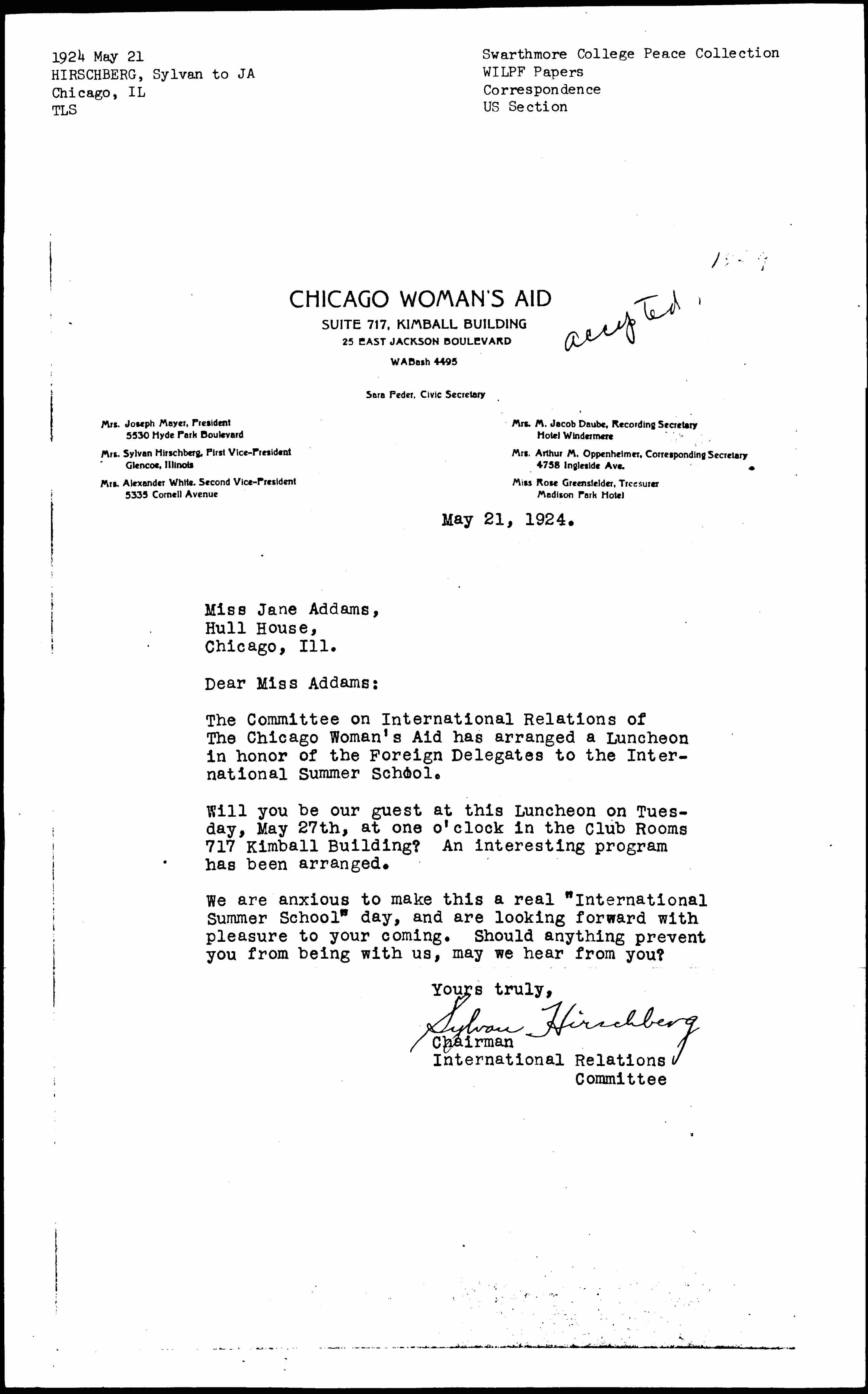 [Mrs.] Sylvan Hirschberg [signed]