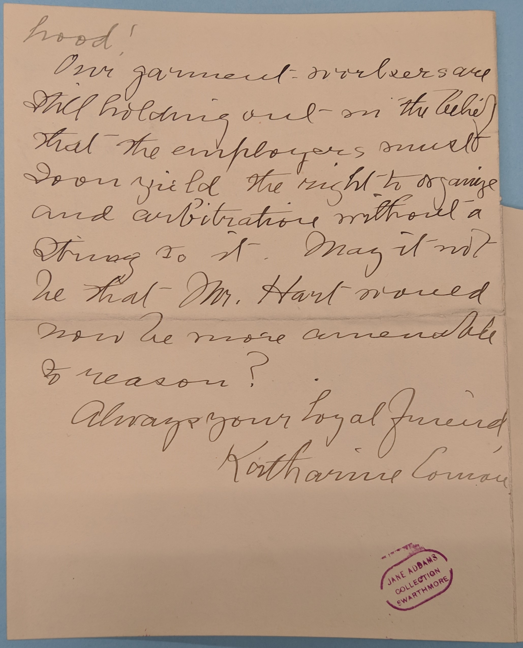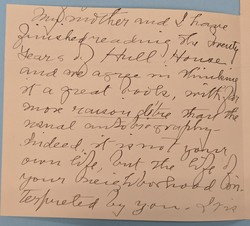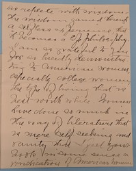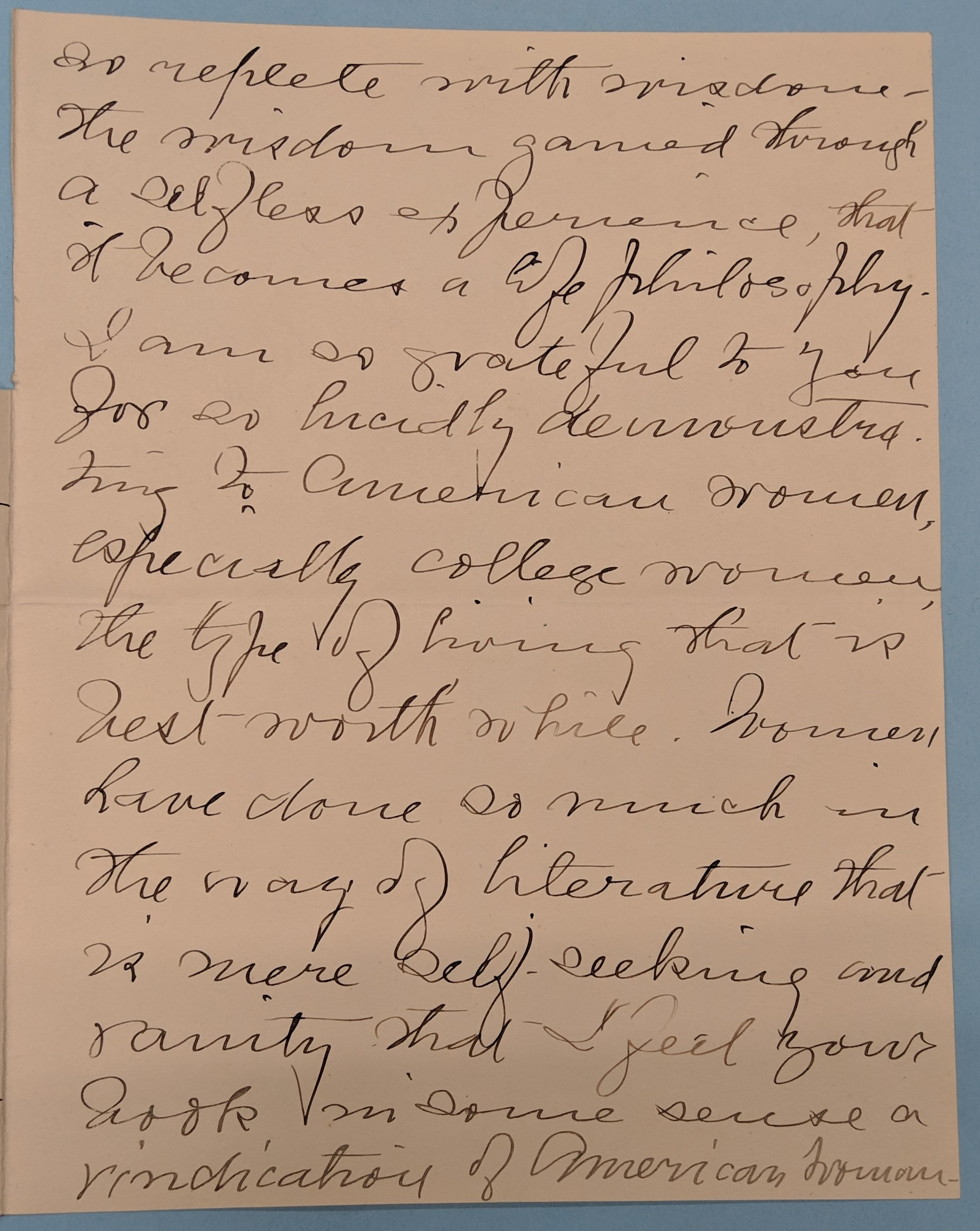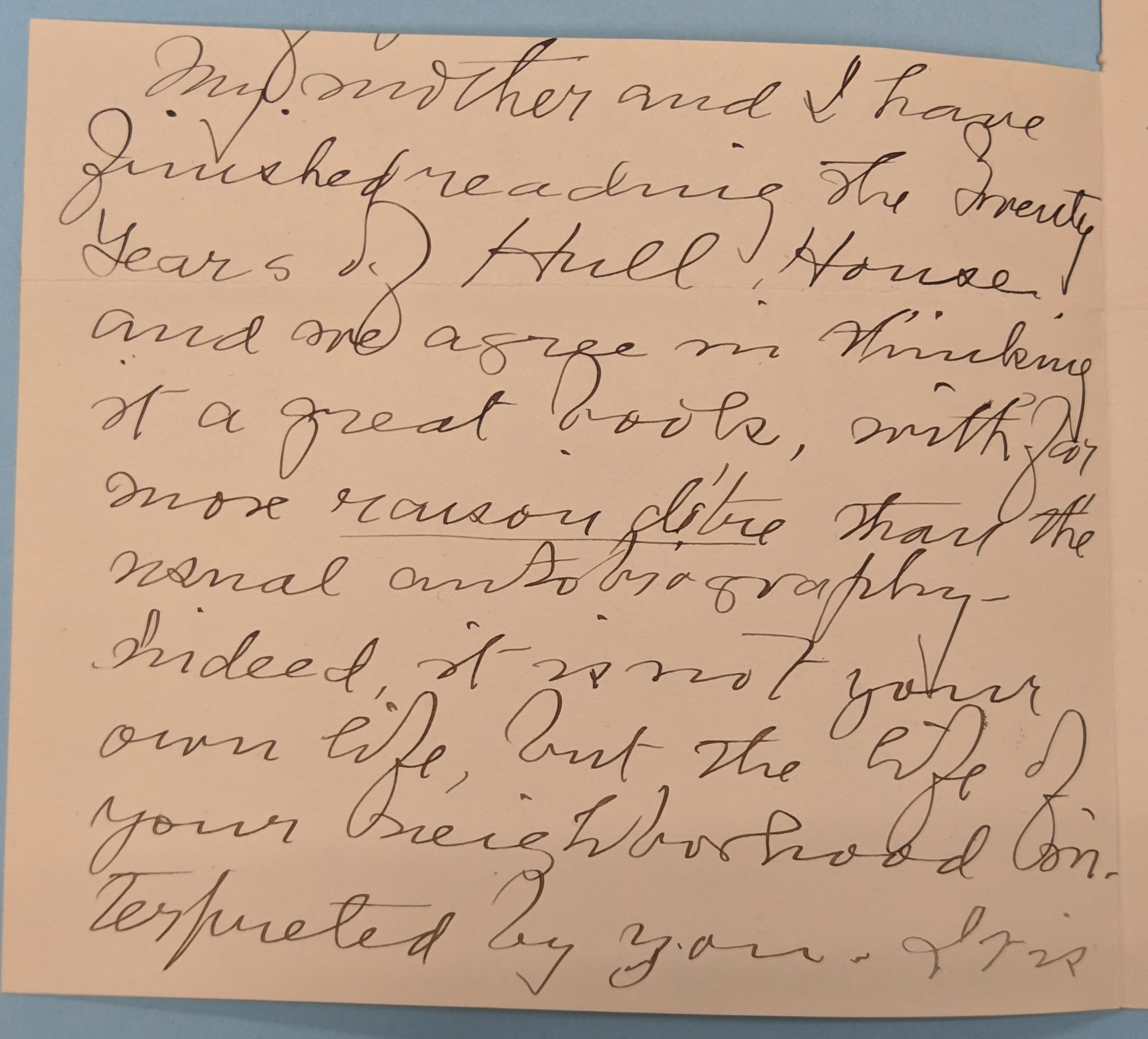 My mother and I have finished reading the Twenty Years of Hull House and we agree in thinking it a great book, with far more raison d'etre than the normal autobiography. Indeed, it is not your own life, but the life of your neighborhood interpreted by you. It is [page 3] so replete with wisdom -- the wisdom gained through a selfless experience, that it becomes a life philosophy. I am so grateful to you for so lucidly demonstrating to American women, especially college women, the type of living that is best worth while. Women have done so much in the way of literature that is mere self-seeking and vanity that I feel your book in some sense a vindication of American womanhood! [page 4]