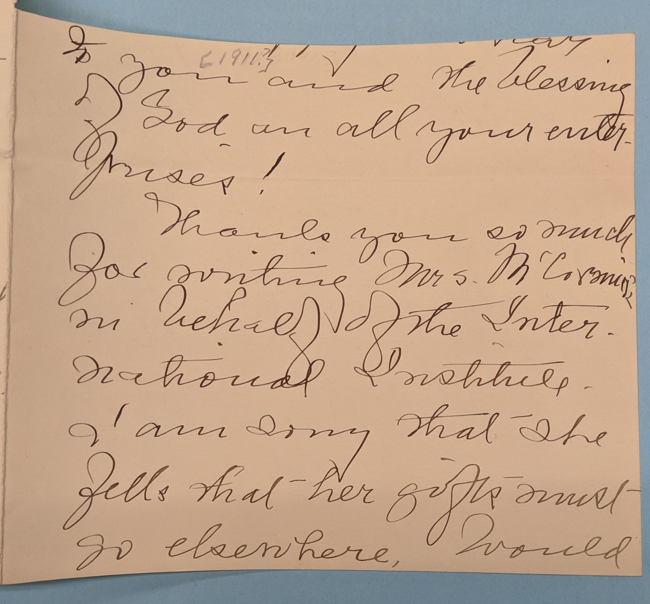Thank you so much for writing Mrs. McCormick on behalf of the International Institute. I am sorry that she feels that her gifts must go elsewhere. Would [page 2] [missing page(s)]