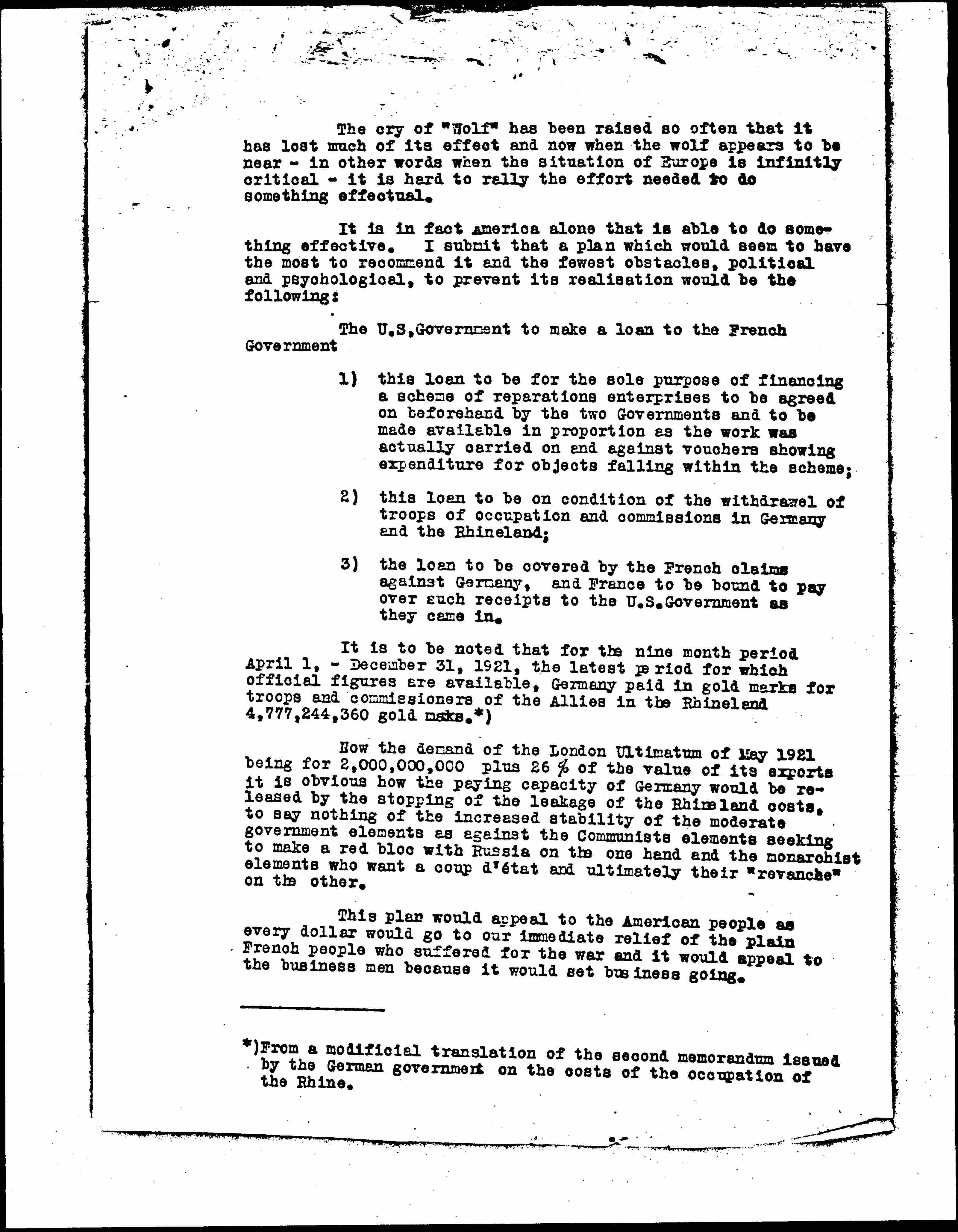 *) From a modificial translation of the second memorandum issued by the German government on the costs of the occupation of the Rhine.
