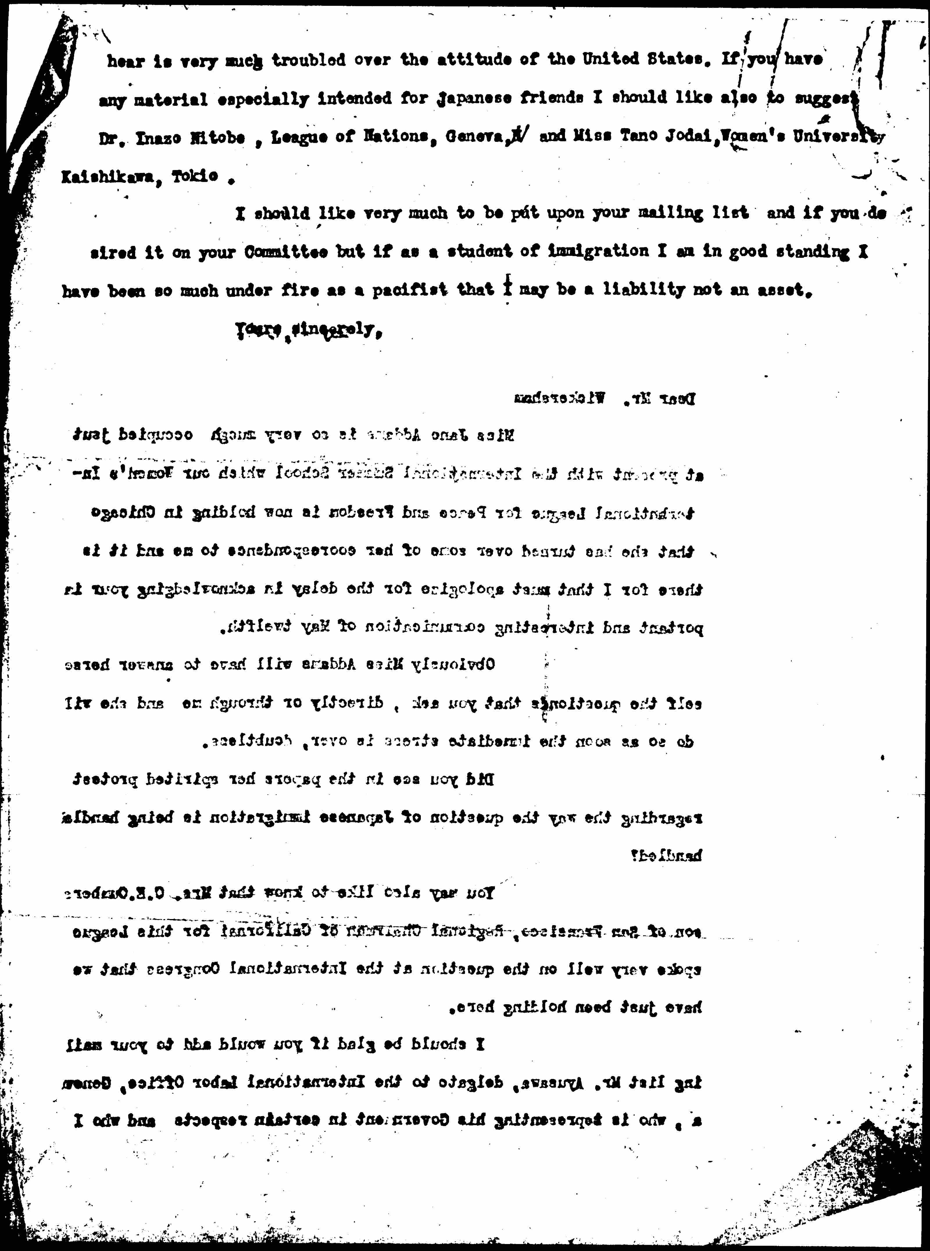 I should be glad if you would add to your mailing list Mr. Ayusawa, delegate to the International Labor Office, Geneva, who is representing his Government in certain respects and who I [page 2] hear is very much troubled over the attitude of the United States. If you have any material especially intended for Japanese friends I should like also to suggest Dr. Inazō Nitobe, League of Nations, Geneva, and Miss Tano Jōdai, Women's University [Koishikawa, Tokyo].