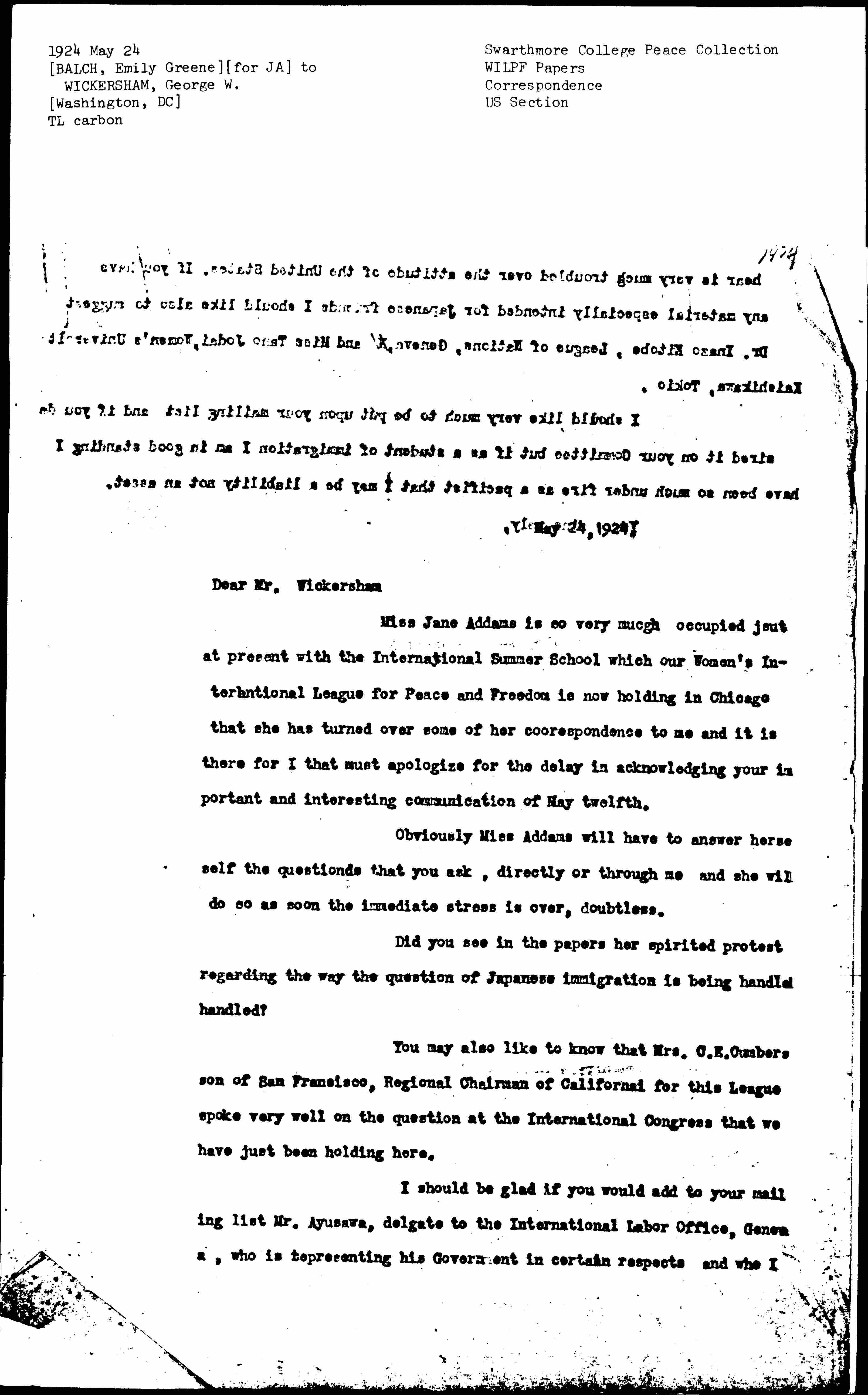 Miss Jane Addams is so very much occupied just at present with the International Summer School which our Women's International League for Peace and Freedom is now holding in Chicago that she has turned over some of her correspondence to me and it is [therefor] I that must apologize for the delay in acknowledging your important and interesting communication of May twelfth.