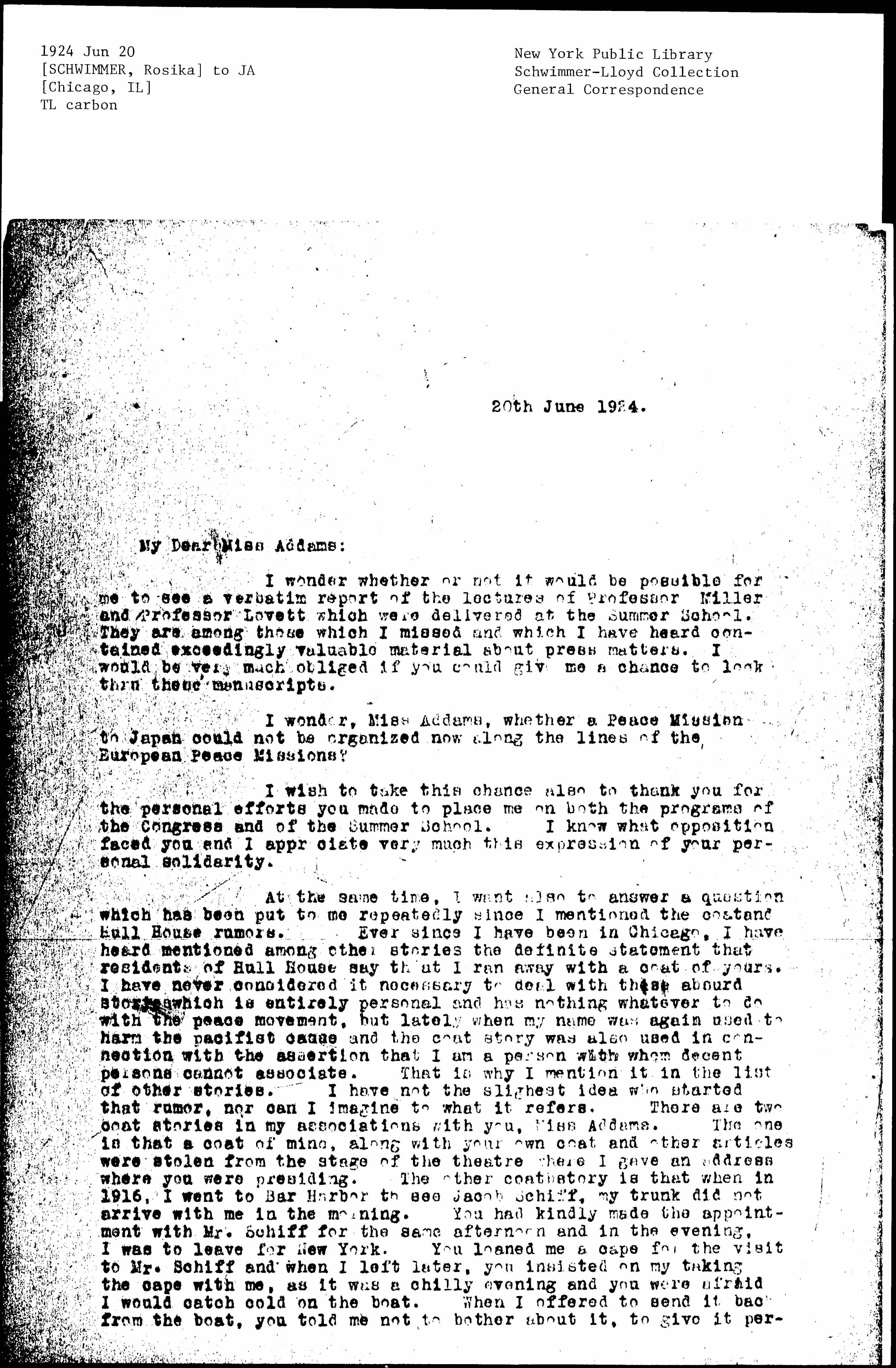 At the same time, I want also to answer a question which has been put to me repeatedly since I mentioned the [coat and] Hull House rumors. Ever since I have been in Chicago, I have heard mentioned among other stories the definite statement that residents of Hull House say that I ran away with a coat of yours. I have never considered it necessary to deal with these absurd stories which is entirely personal and has nothing whatever to do with the peace movement, but lately when my name was again used to harm the pacifist cause and the coat story was also used in connection with the assertion that I am a person with whom decent persons cannot associate. That is why I mention it in the list of other stories. I have not the slightest idea who started that rumor, nor can I imagine to what it refers. There are two coat stories in my associations with you, Miss Addams. The one in that a coat of mine, along with your own coat and other articles were stolen from the stage of the [theater] where I gave an address where you were presiding. The other coat story is that when in 1916, I went to Bar Harbor to see Jacob Schiff, my trunk did not arrive with me in the morning. You had kindly made the appointment with Mr. Schiff for the same afternoon and in the evening, I was to leave for New York. You loaned me a cape for the visit to Mr. Schiff and when I left later, you insisted on my taking the cape with me, as it was a chilly evening and you were afraid I would catch cold on the boat. When I offered to send it back from the boat, you told me not to bother about it, to give it perhaps [page 2] to the chamber maid in the hotel, as it was an old garment which you were no longer wearing. On your insisting on this point, I told you that I would dispose of it in Europe where there was greater need for it. I arrived in Hungary at the same time that the Transylvanian refugees came up because of the [Romanians] had invaded Hungary. With many other things, taken out of my own and my mother's wardrobe, I gave your cape to Mme. Urmossy, the wife of the Unitarian pastor from Transylvania, who with her husband was one of our pacifist and feminist leaders. They had fled, leaving all their earthly possessions, with several children one of whom died [in consequence], and we feminists tried to give as much help and relief as possible to the [coworkers], going to especial trouble with the Urmossy family, because they were among our most valuable [coworkers]. Should the famous story still circulate in Hull House emanating from this cape affair, I would beg you to explain the matter to those who still keep the story alive. The Urmossy family has returned to Transylvania, communication is extremely difficult, if not impossible, but I would consider it good sport to hunt them up and get their statement that they still have the black cape among the things which my mother and I gave them.
