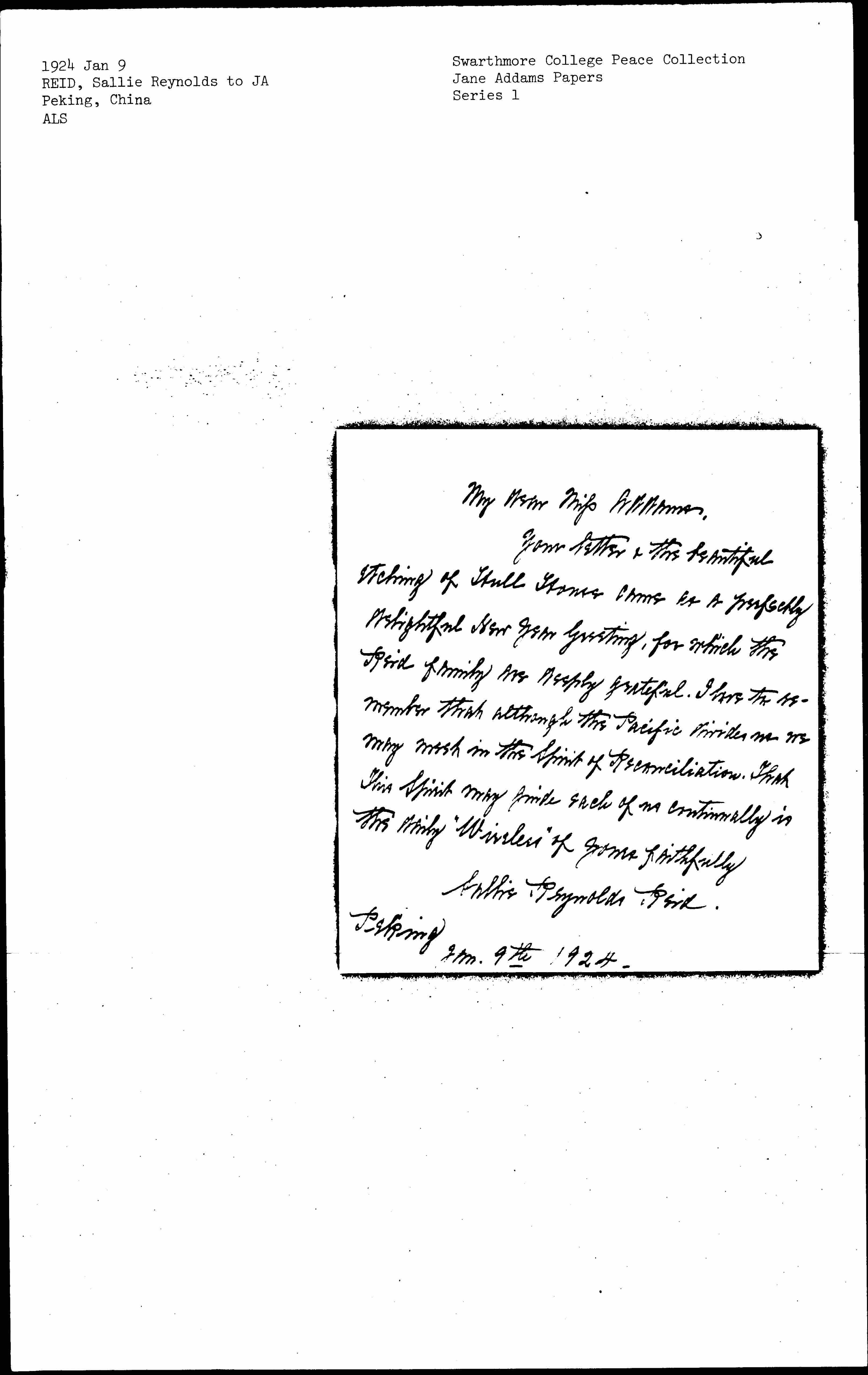 Your letter & the beautiful etching of Hull House comes as a perfectly delightful New Year Greeting, for which the Reid family was deeply grateful. I have to remember that although the Pacific divides us we may meet in the Spirit of Reconciliation. That this Spirit may guide each of us continually is the [daily] "Wireless" of yours faithfully