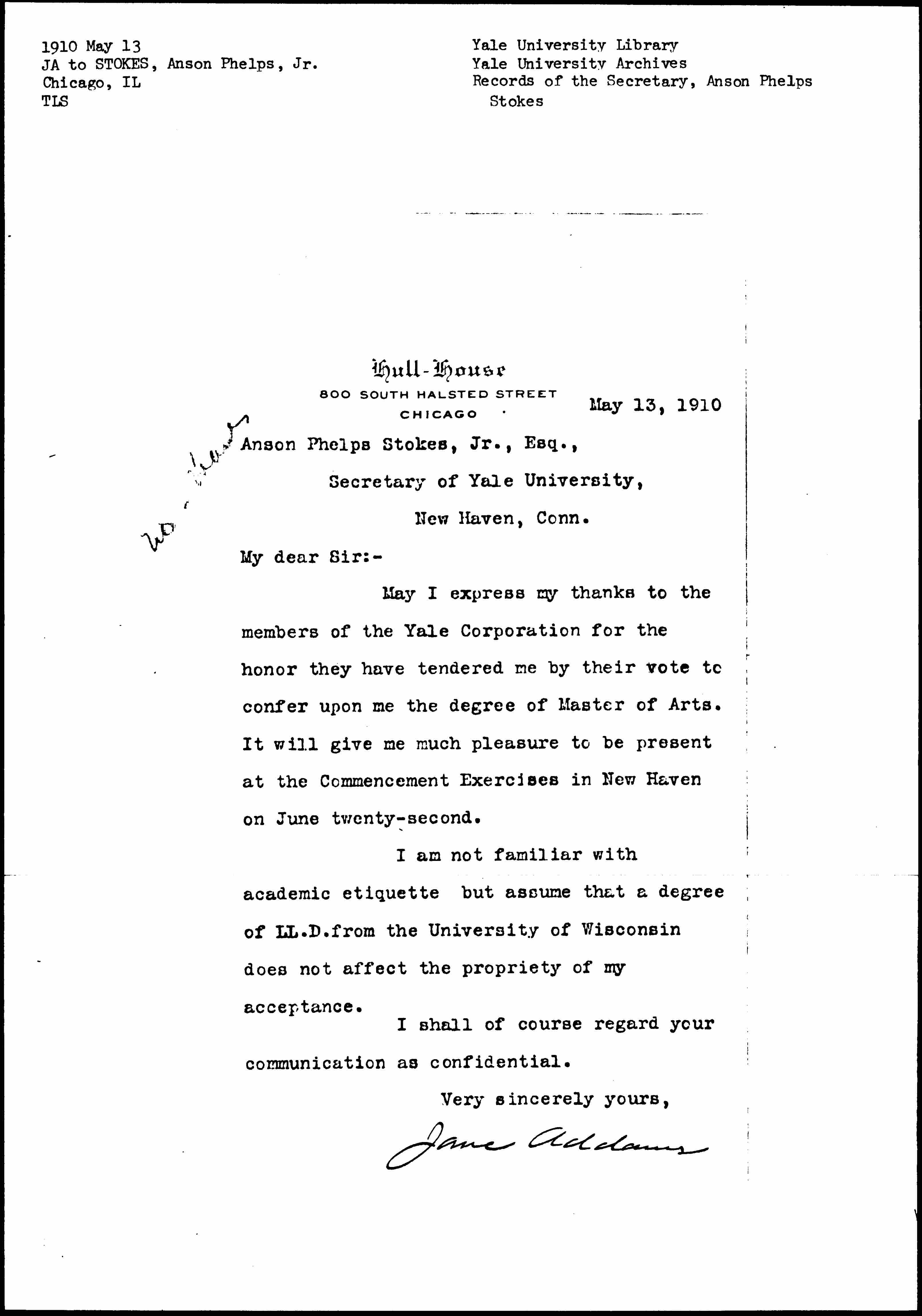 May I express my thanks to the members of the Yale Corporation for the honor they have tendered me by their vote to confer upon me the degree of Master of Arts. It will give me much pleasure to be present at the Commencement Exercises in New Haven on June twenty-second.