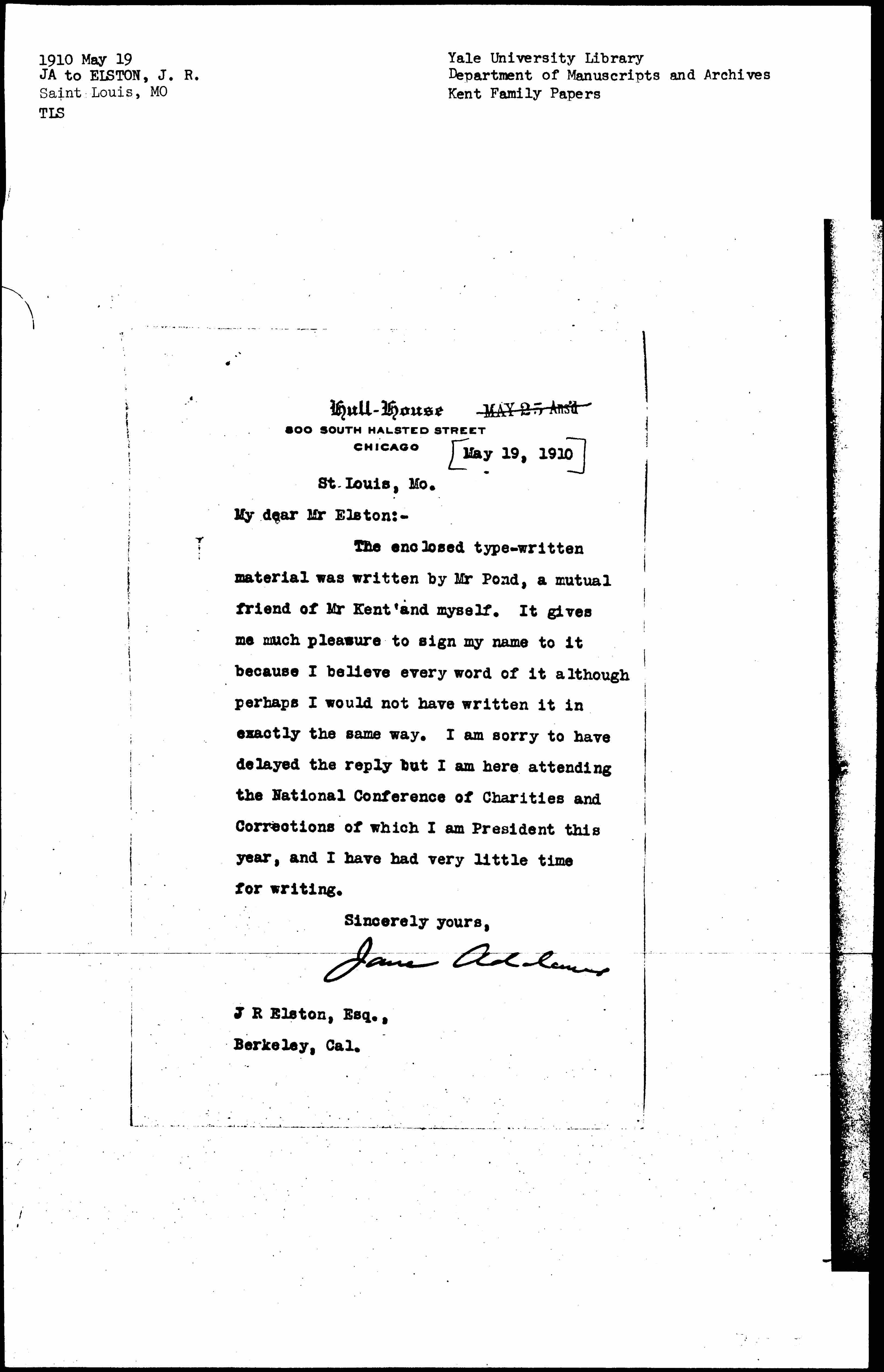 The enclosed type-written material was written by Mr Pond, a mutual friend of Mr Kent and myself. It gives me much pleasure to sign my name to it because I believe every word of it although perhaps I would not have written it in exactly the same way. I am sorry to have delayed the reply but I am here attending the National Conference of Charities and Corrections of which I am President this year, and I have had very little time for writing.