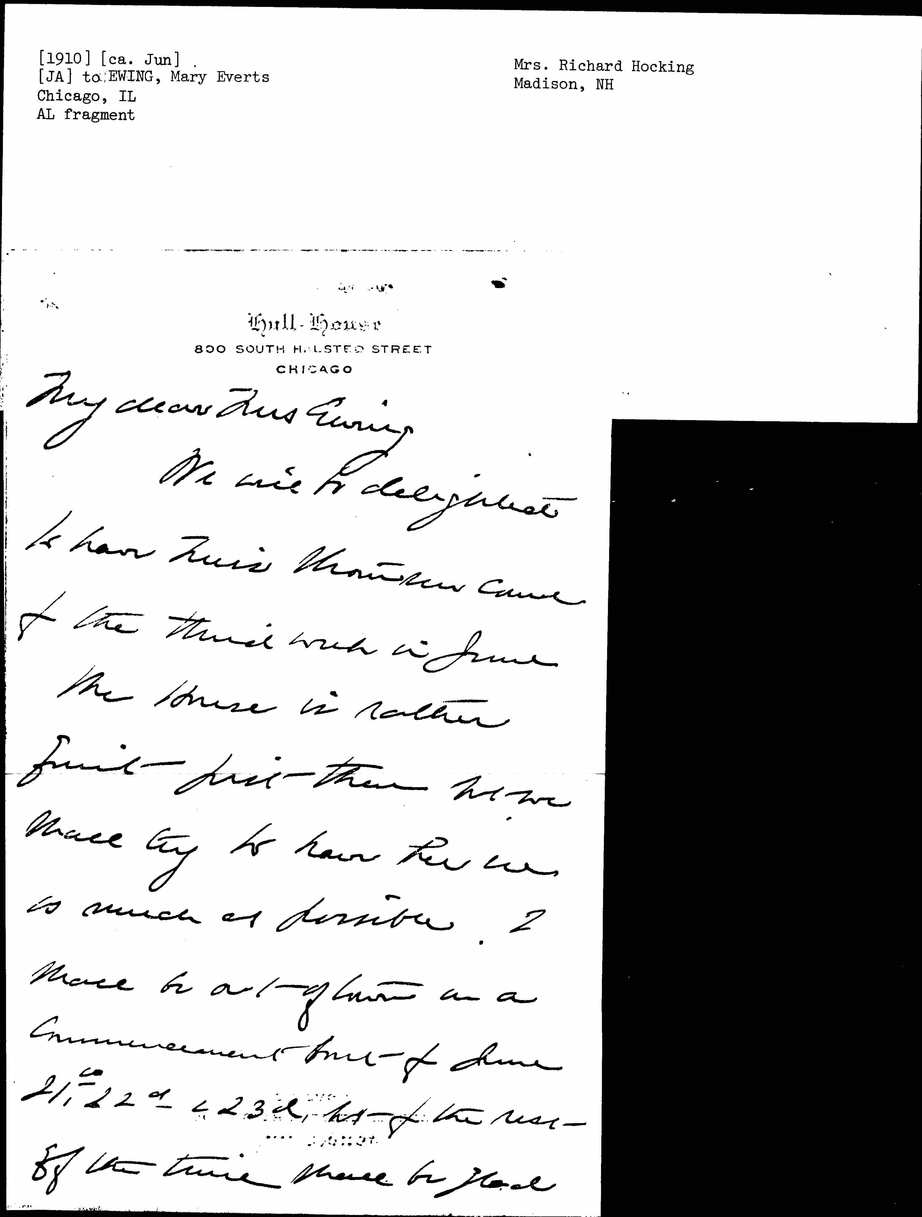 The House is rather quiet just then but we shall try to have her see as much as possible. I shall be out of town on a commencement [tour] for June 21st, 22d, & 23d, but for the rest of the time shall be glad [page(s) missing]