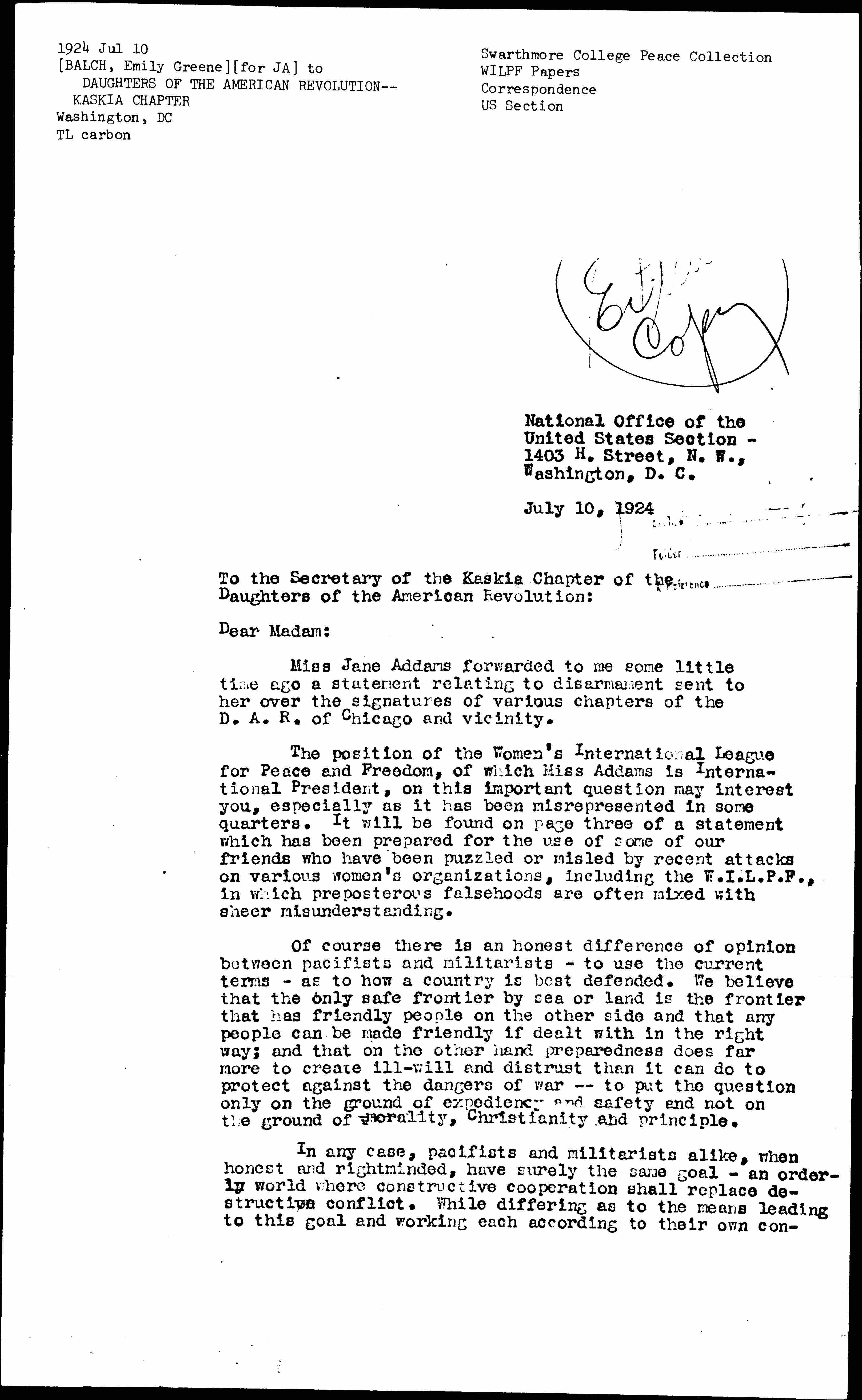 The position of the Women's International League for Peace and Freedom, of which Miss Addams is International President, on this important question may interest you, especially as it has been misrepresented in some quarters. It will be found on page three of a statement which has been prepared for the use of some of our friends who have been puzzled or misled by recent attacks on various women's organizations, including the W.I.L.P.F., in which preposterous falsehoods are often mixed with sheer misunderstanding.