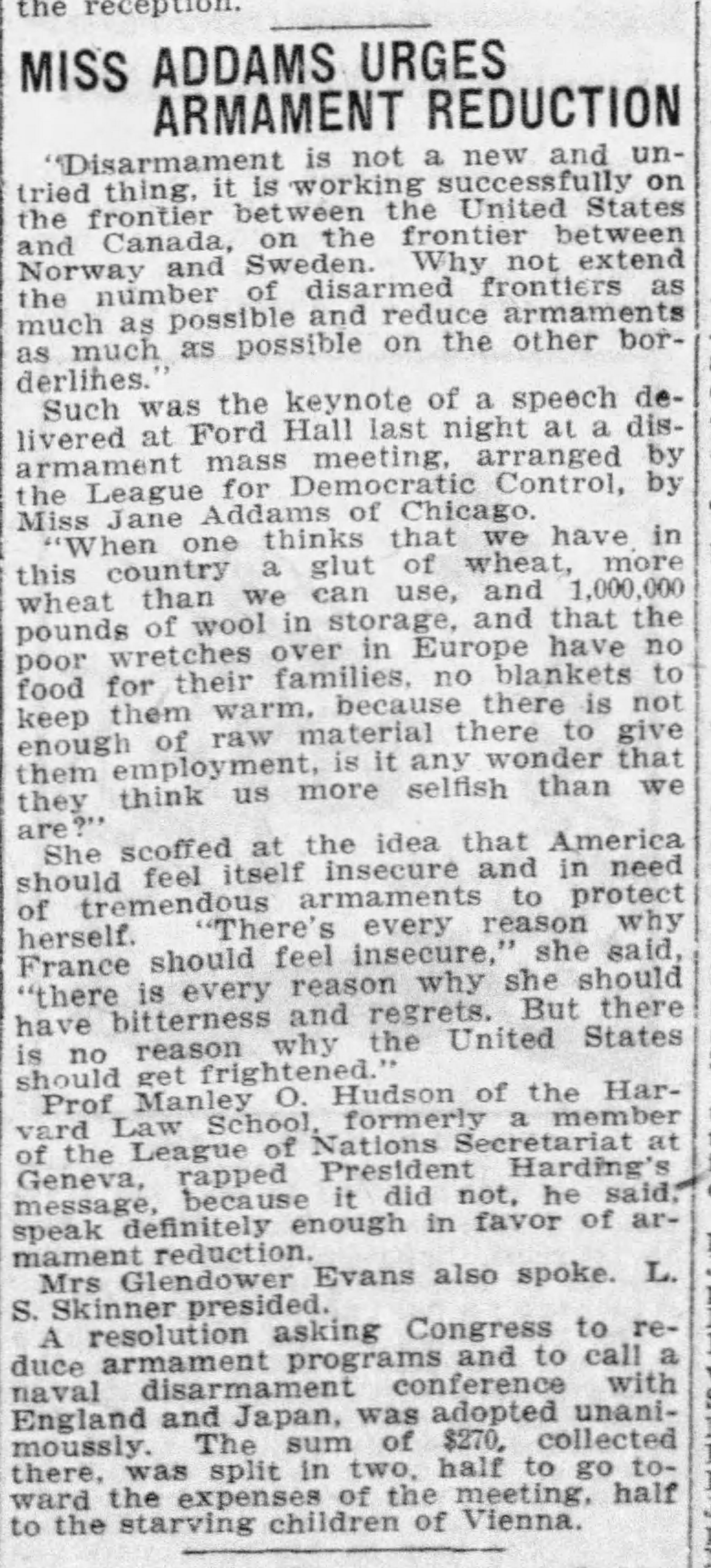 A resolution asking Congress to reduce armament programs and to call a naval disarmament conference with England and Japan, was adopted [unanimously]. The sum of $270, collected there, was split in two, half to go toward the expenses of the meeting, half to the starving children of Vienna.