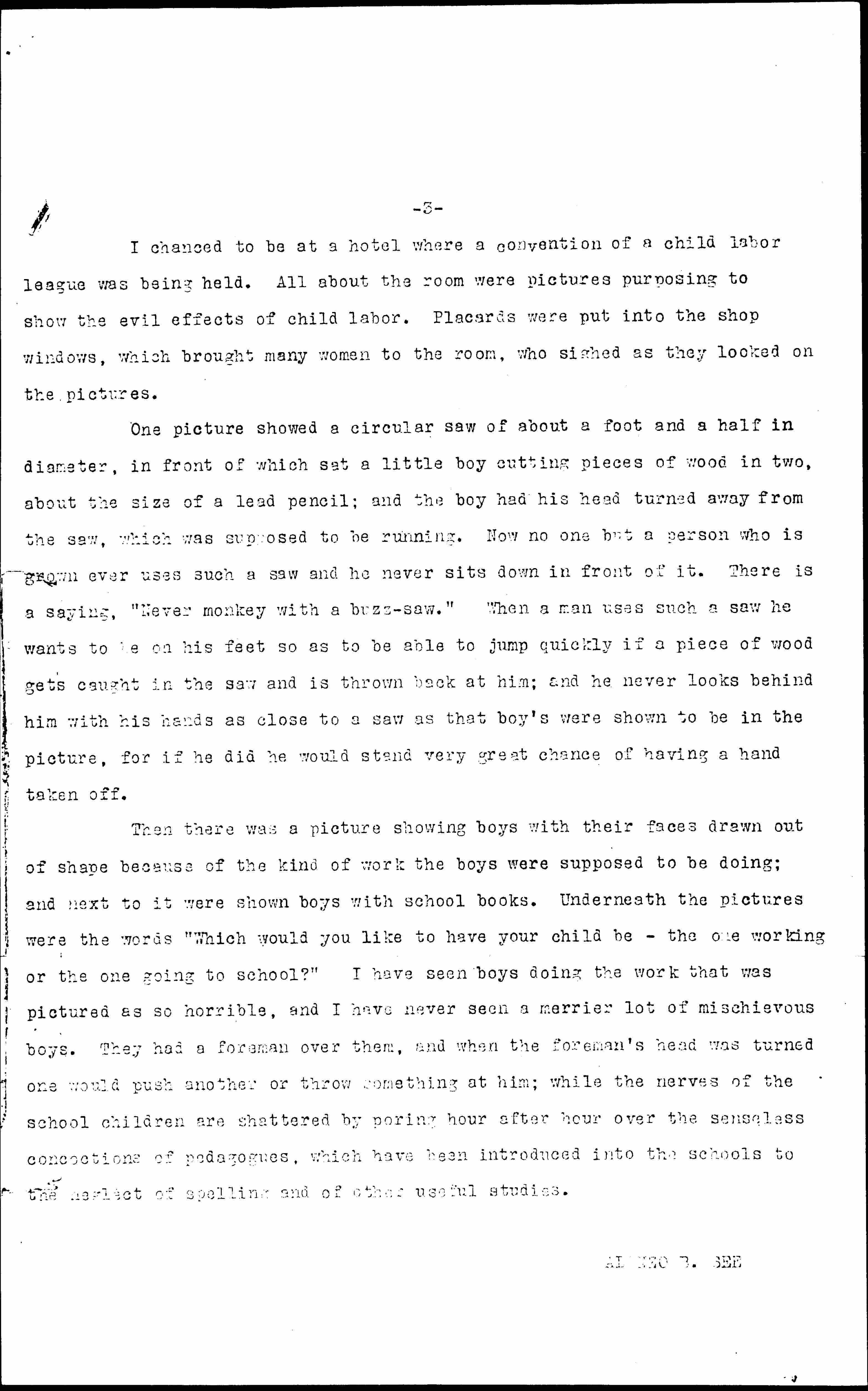 It is surprising how many persons there are who [will] allow their names to be used as supporters of things they know nothing about -- things which they never investigate. The men who allow their names to be used in this way are nothing more than stool pigeons, and are used as decoys to induce gullible people to give money [to] the support of these child labor leagues. [page 3]