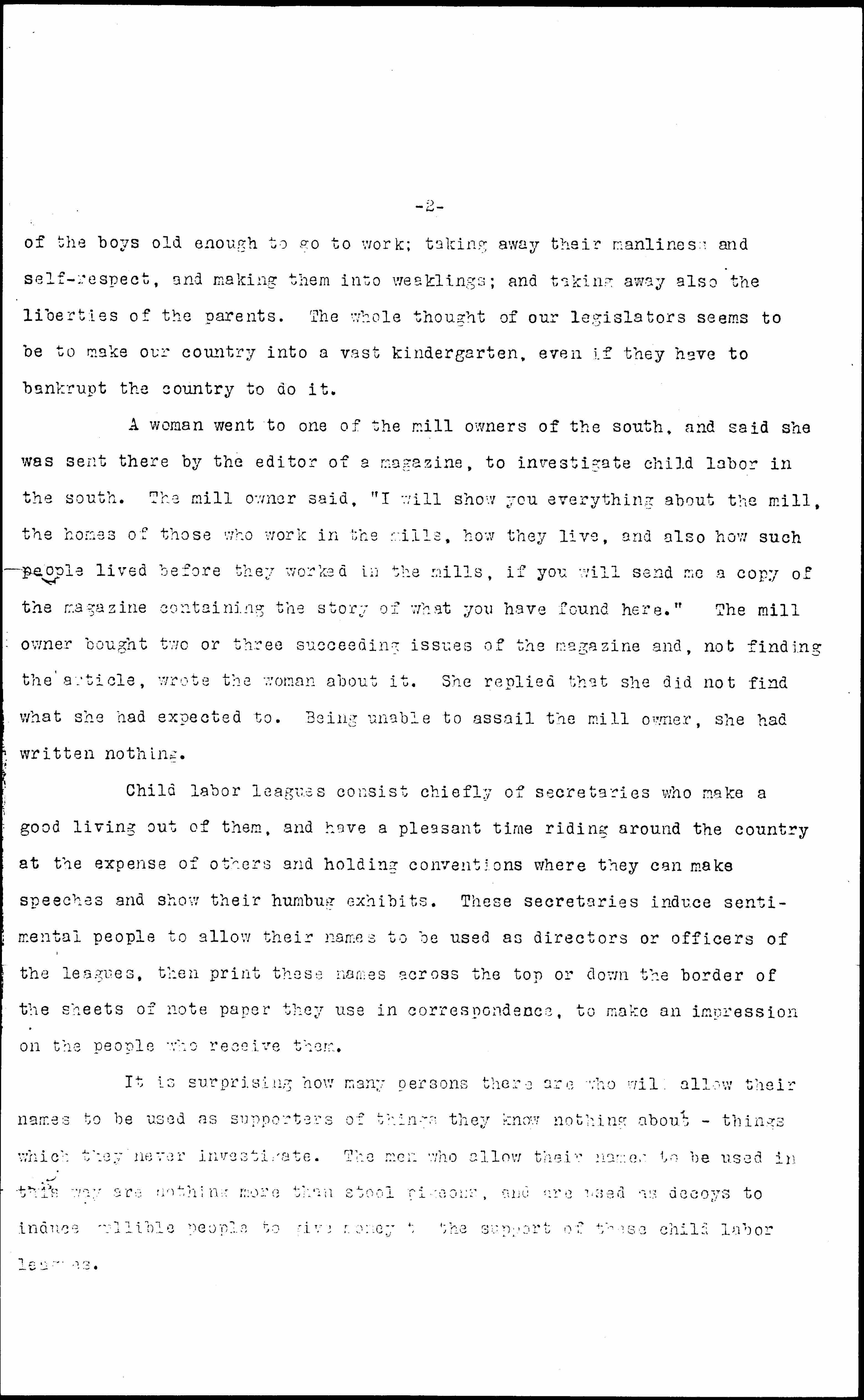 Read the story of how boys who want to work at the age of twelve, thirteen or fourteen, rose to prominent, useful and [happy] lives, and how, by these child labor laws, the office holders are taking away the liberties [page 2] of the boys old enough to go to work; taking away their manliness and self-respect, and making them into weaklings and taking away also the liberties of the parents. The whole thought of our legislators seems to be to make our country into a vast kindergarten, even if they have to bankrupt the country to do it.