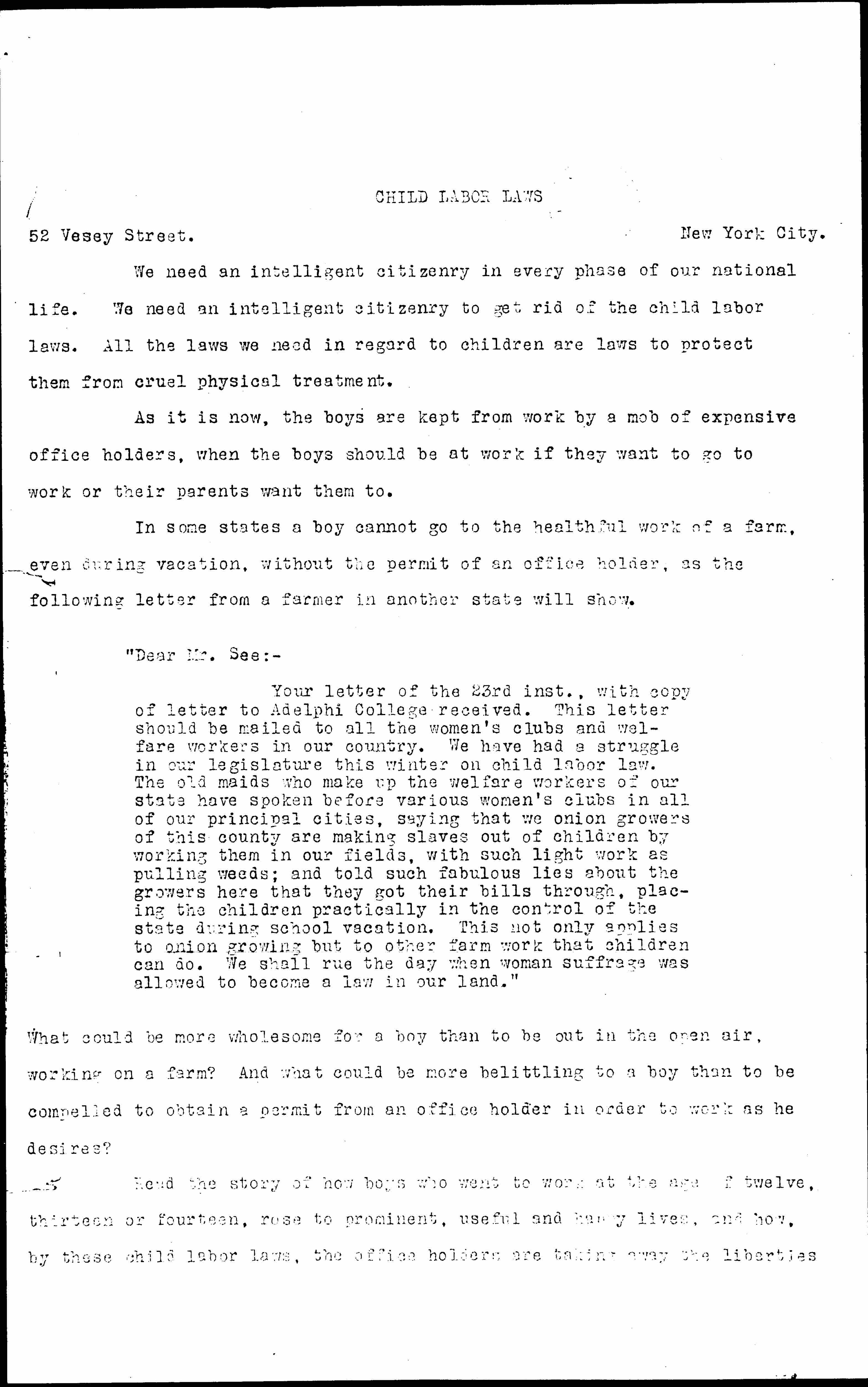 Your letter of the 23rd inst., with copy of letter to Adelphi College received. This letter should be mailed to all the women's clubs and welfare workers in our country. We have had a struggle in our legislature this winter on child labor law. The old maids who make up the welfare workers of our state have spoken before various women's clubs in all of our principal cities, saying that we onion growers of this county are making slaves out of children by working them in our fields, with such light work as pulling weeds; and told such fabulous lies about the growers here that they got their bills through, placing the children practically in the control of the state during school vacation. This not only applies to onion growing but to other farm work that children can do. We shall rue the day when woman suffrage was allowed to become a law in our land."