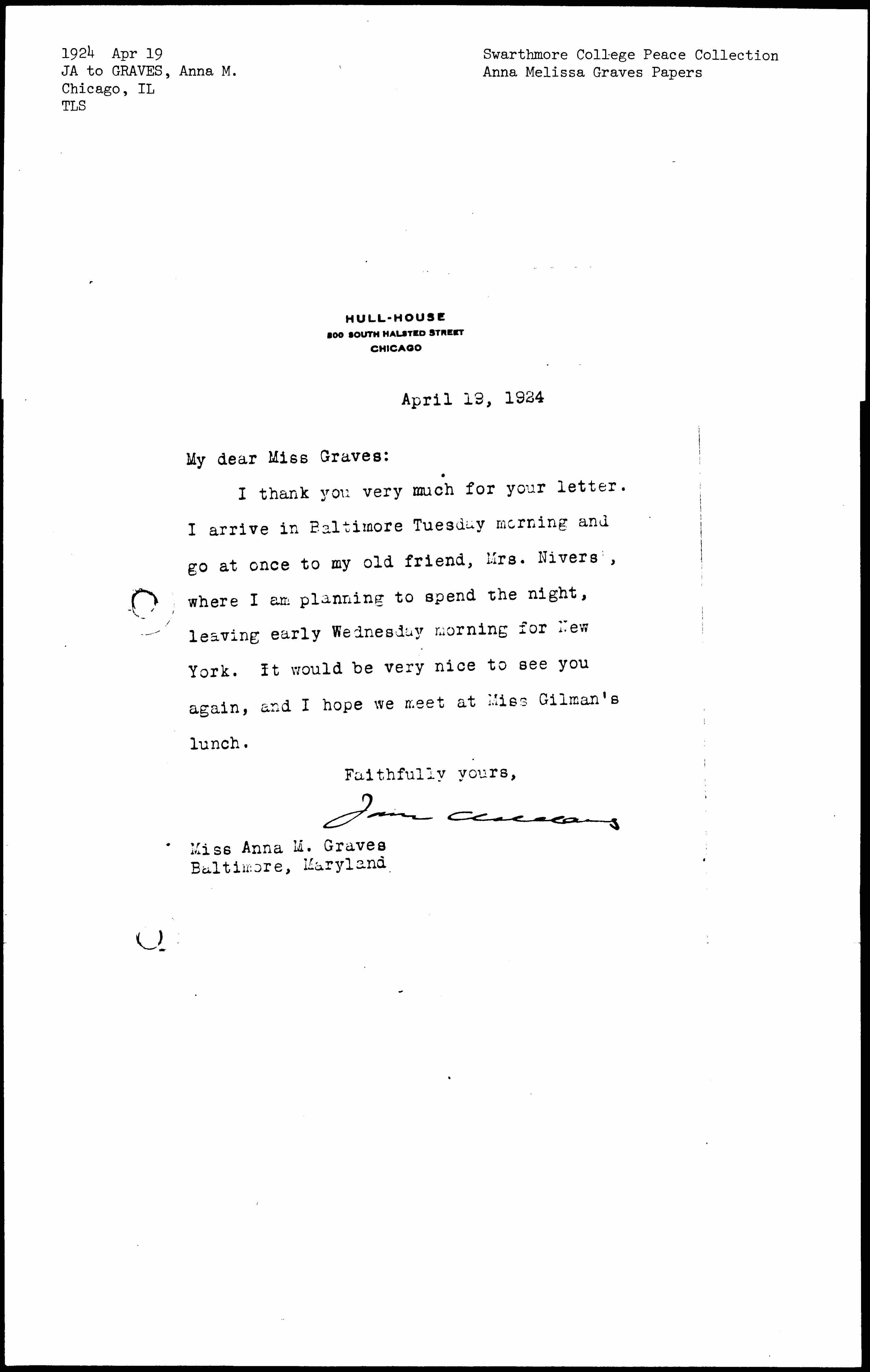 I thank you very much for your letter. I arrive in Baltimore Tuesday morning and go at once to my old friend, Mrs. Niver's, where I am planning to spend the night, leaving early Wednesday morning for New York. It would be very nice to see you again, and I hope we meet at Miss Gilman's lunch.