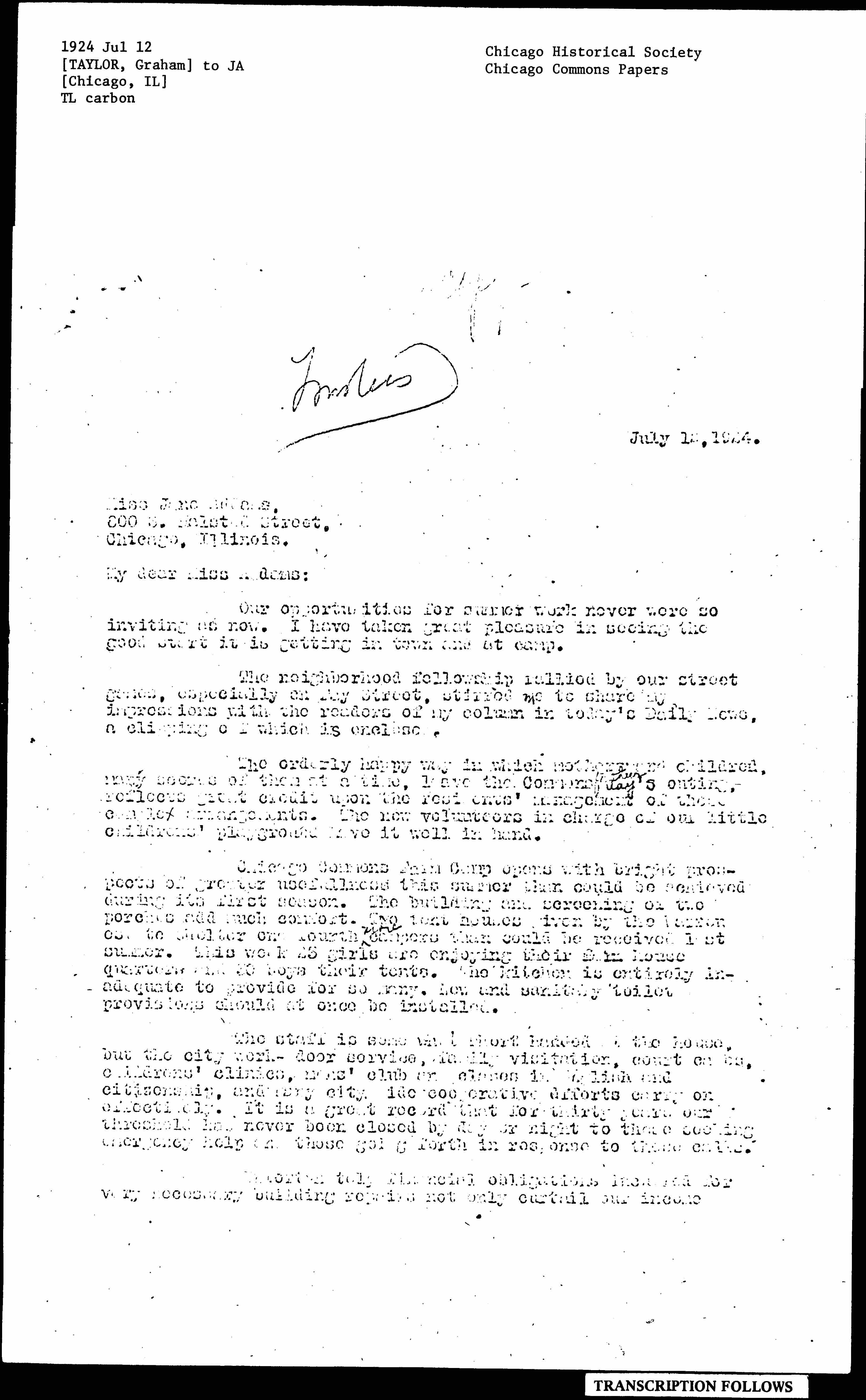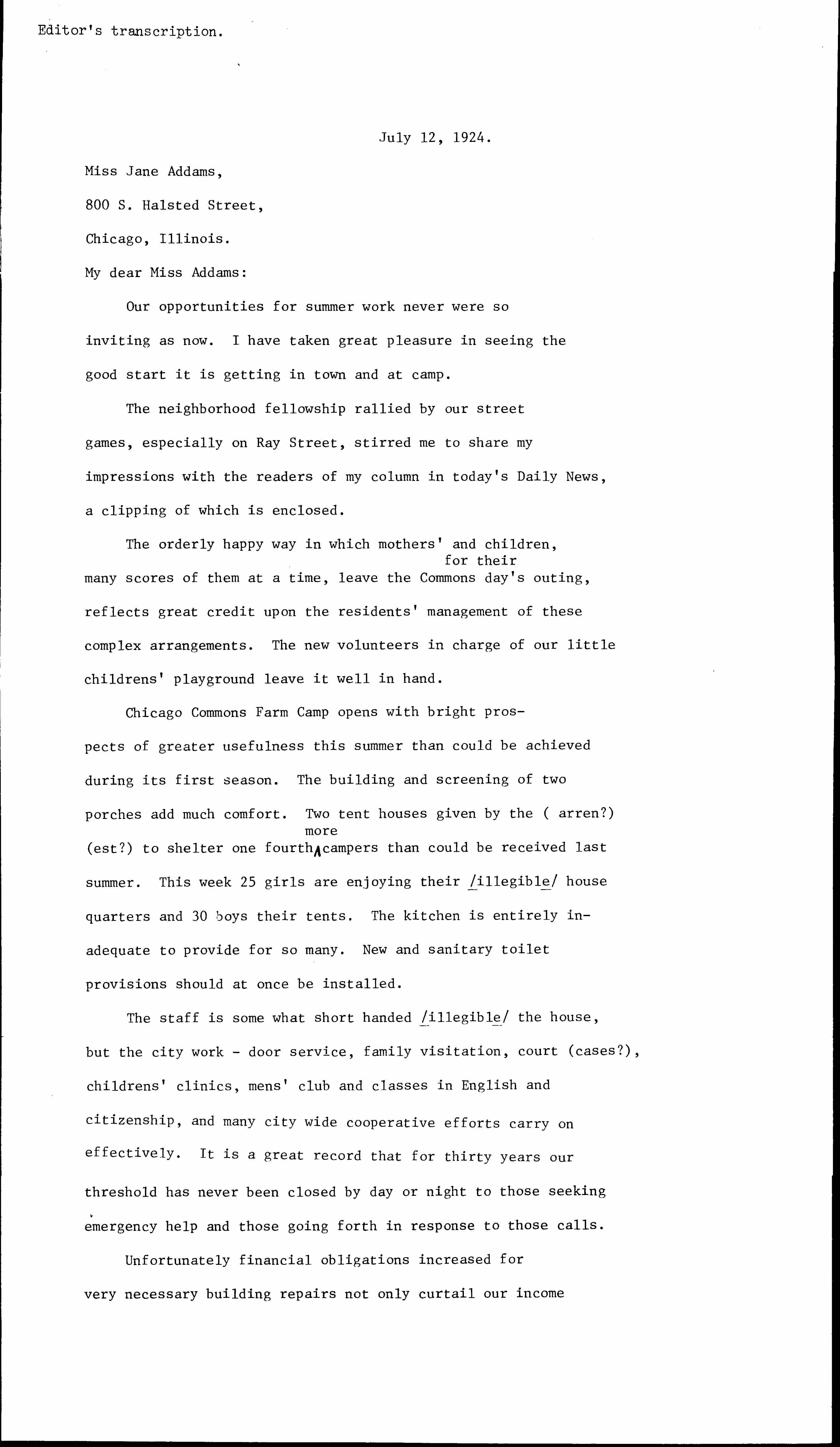 Chicago Commons Farm Camp opens with bright prospects of greater usefulness this summer than could be achieved during its first season. The building and screening [of] two porches add much comfort. Two tent houses given by the [Warren Co.?] to shelter one fourth ↑more↓ campers than could be received last summer. This week 25 girls are enjoying their [farm] house quarters [and] 30 boys their tents. The kitchen is entirely inadequate to provide for so many. New and sanitary toilet provisions should at once be installed.