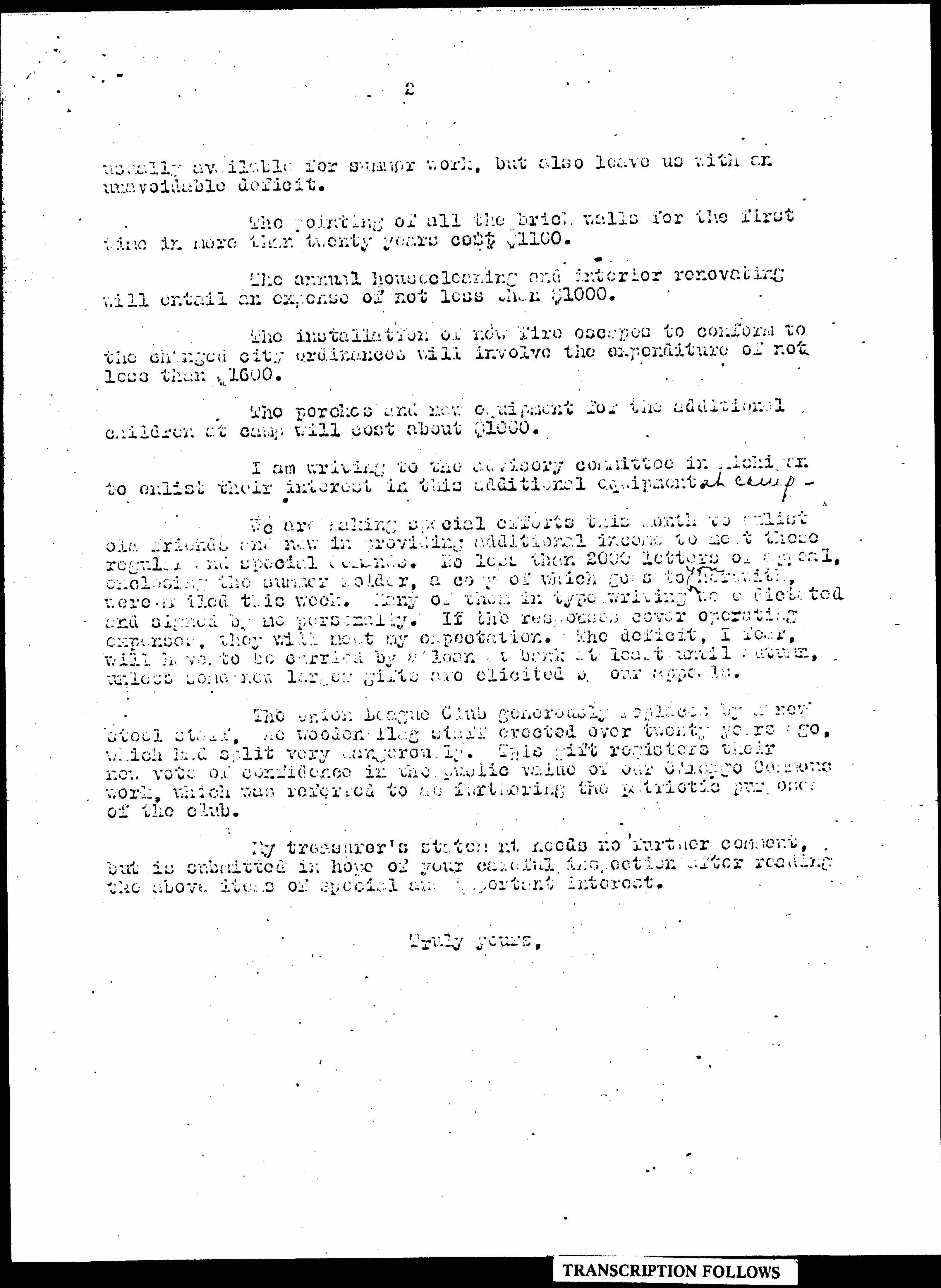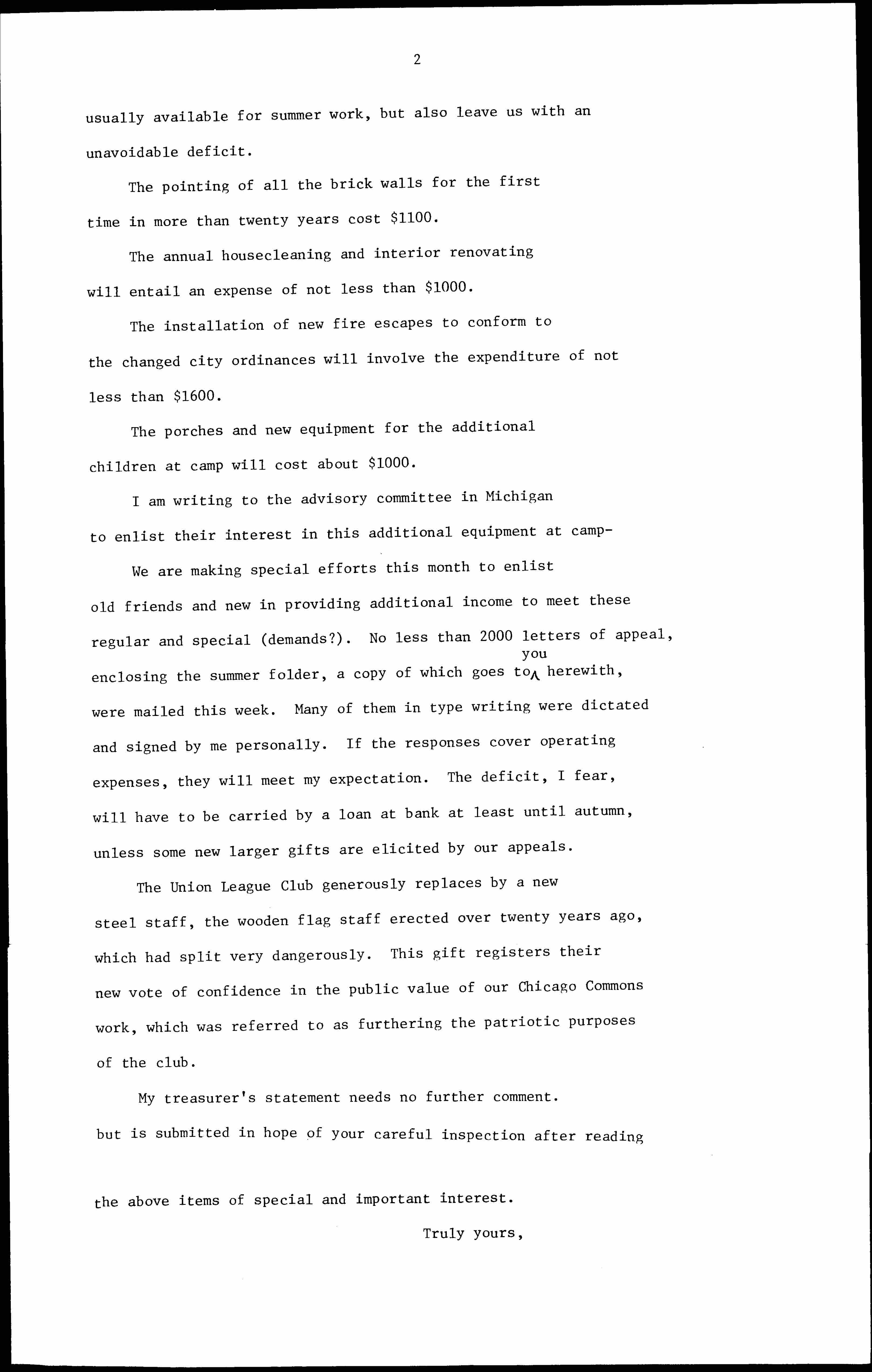 Unfortunately financial obligations [increased] for very necessary building repairs not only curtail our income [page 2] usually available for summer work, but also leave us with an unavoidable deficit.