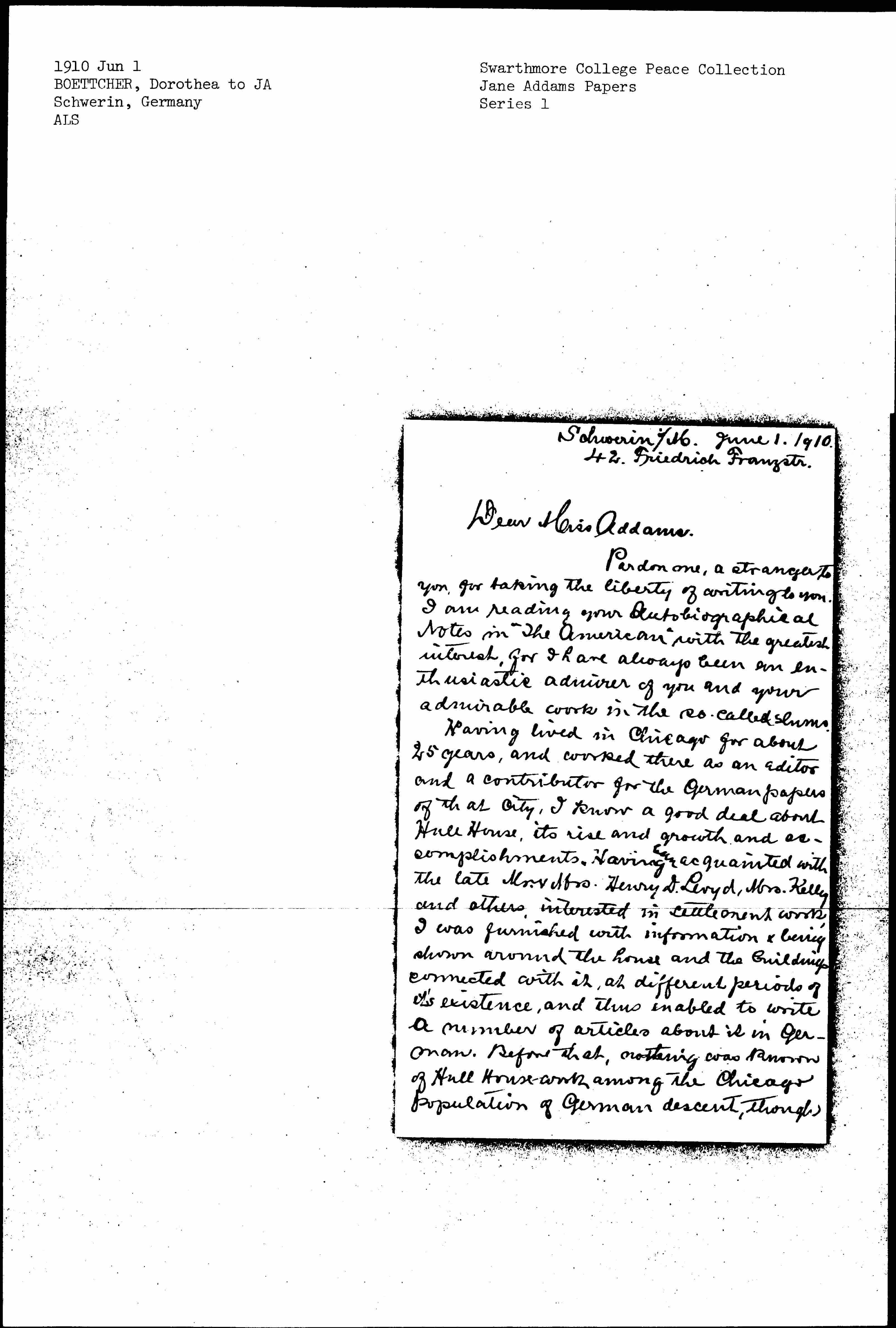 Having lived in Chicago for about 25 years, and worked there as an editor and a contributor for the German papers of that city, I know a good deal about Hull House, its rise and growth and accomplishments. Having ↑been↓ acquainted with the late Mr. & Mrs. Henry D. Lloyd, Mrs. [Kelley] and others interested in settlement work, I was furnished with information & being shown around the house and the buildings connected with it, at different periods of [its] existence, and thus enabled to write a number of articles about it in German. Before that, nothing was known of Hull House work among the Chicago population of German descent, though [page 2] their number is more than 500,000.
