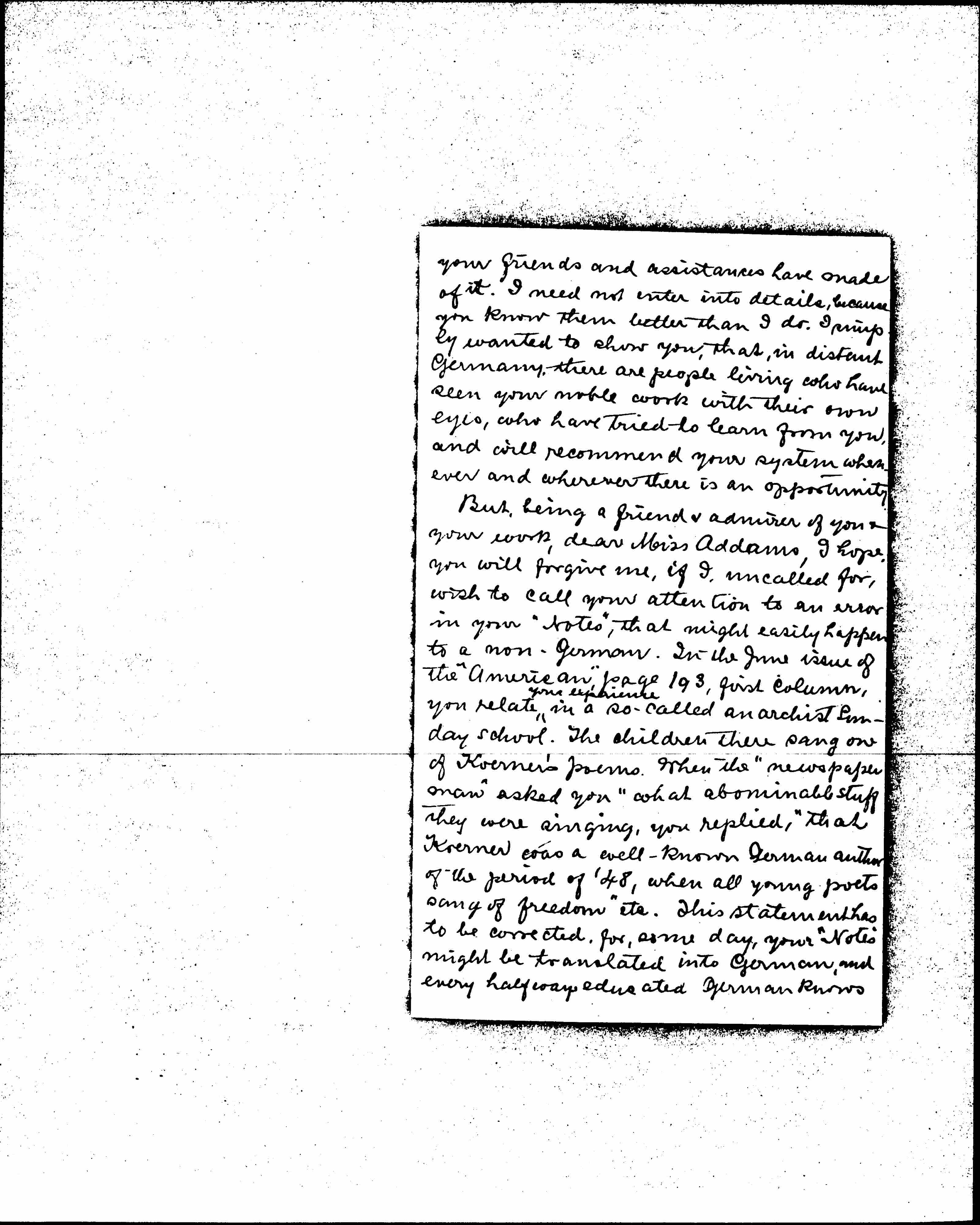 But, being a friend & admirer of you & your work, dear Miss Addams, I hope you will forgive me, if I, uncalled for, wish to call your attention to an error in your "Notes", that might easily happen to a non-German. In the June issue of the "American," page 193, first column, you relate ↑your experience↓ in a so-called anarchist Sunday school. The children there sang one of Koerner's poems. When the "newspaper man" asked you "what abominable stuff they were singing," you replied, "that Koerner was a well-known German author of the period of '48, when all young poets sang of freedom" etc. This statement has to be corrected, for, some day, your "Notes" might be translated into German, and every halfway educated German knows [page 4] that the German poet Theodor Koerner, born 1791, fought, as a volunteer, against the invader Napoleon I, and was killed in a battle, fought Aug. 26. 1813, only 22 years old. His battle-songs were all directed against the foreign invader. In spite of his youth, he wrote a number of fine poems, several dramas, and some prose-works. Theodor Koerner, the poet as well as the patriot, are in high favor in Germany especially among the young people, his works being read in every school.