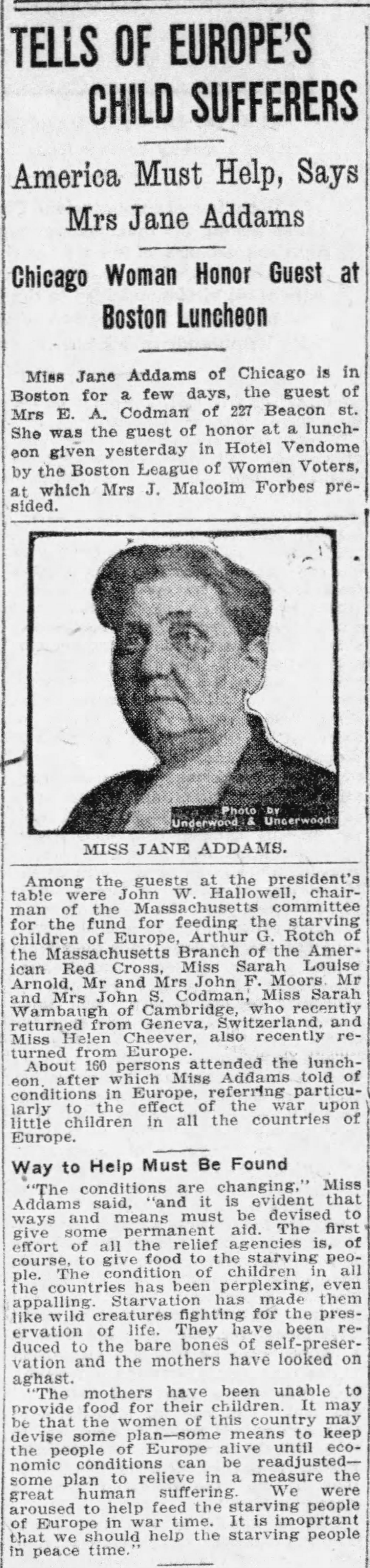 About 160 persons attended the luncheon, after which Miss Addams told of conditions in Europe, referring particularly to the effect of the war upon little children in all the countries of Europe.