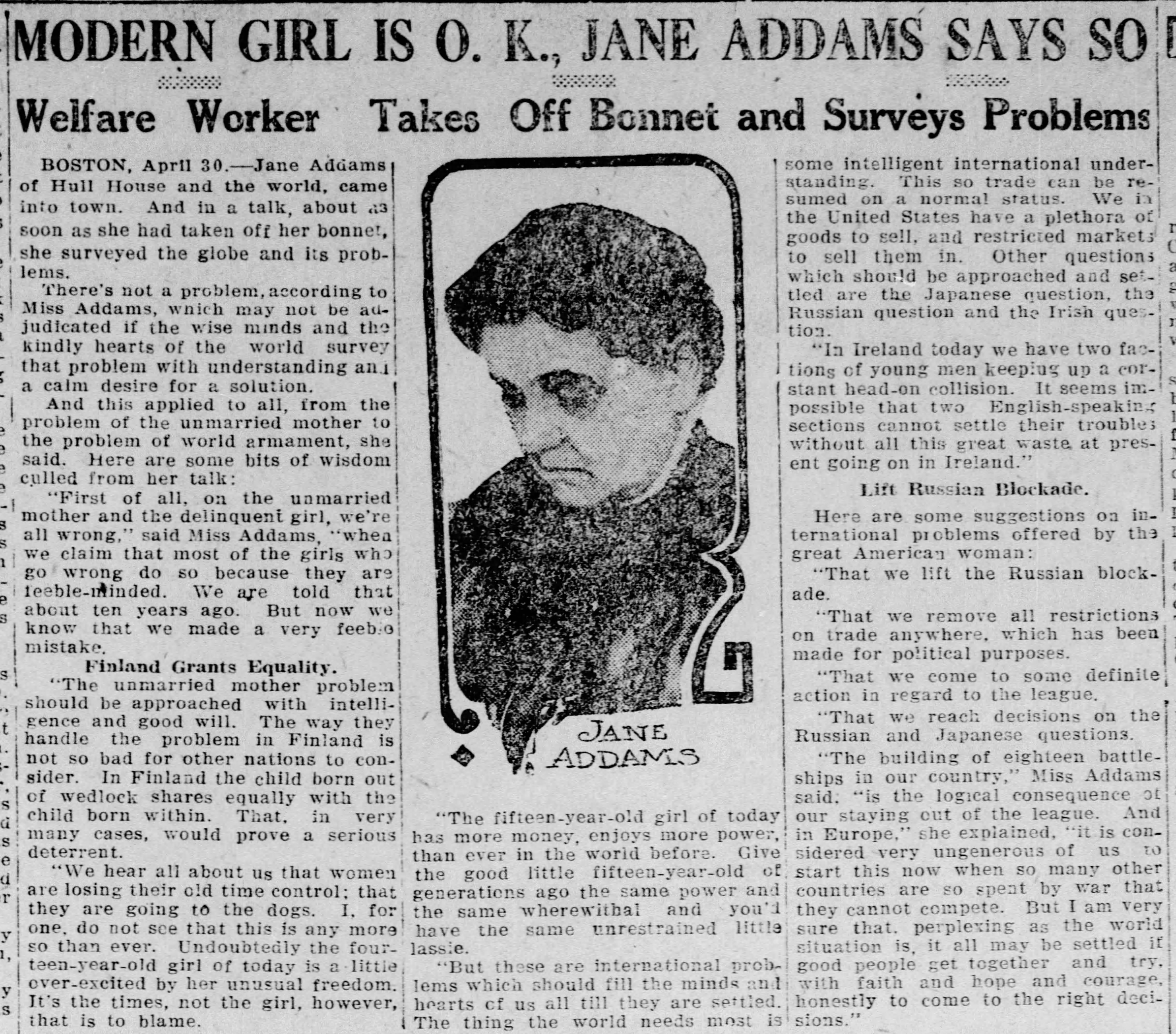 "First of all, on the unmarried mother and the delinquent girl, we're all wrong," said Miss Addams, "when we claim that most of the girls who go wrong do so because they are feeble-minded. We are told that about ten years ago. But now we know that we made a very feeble mistake."