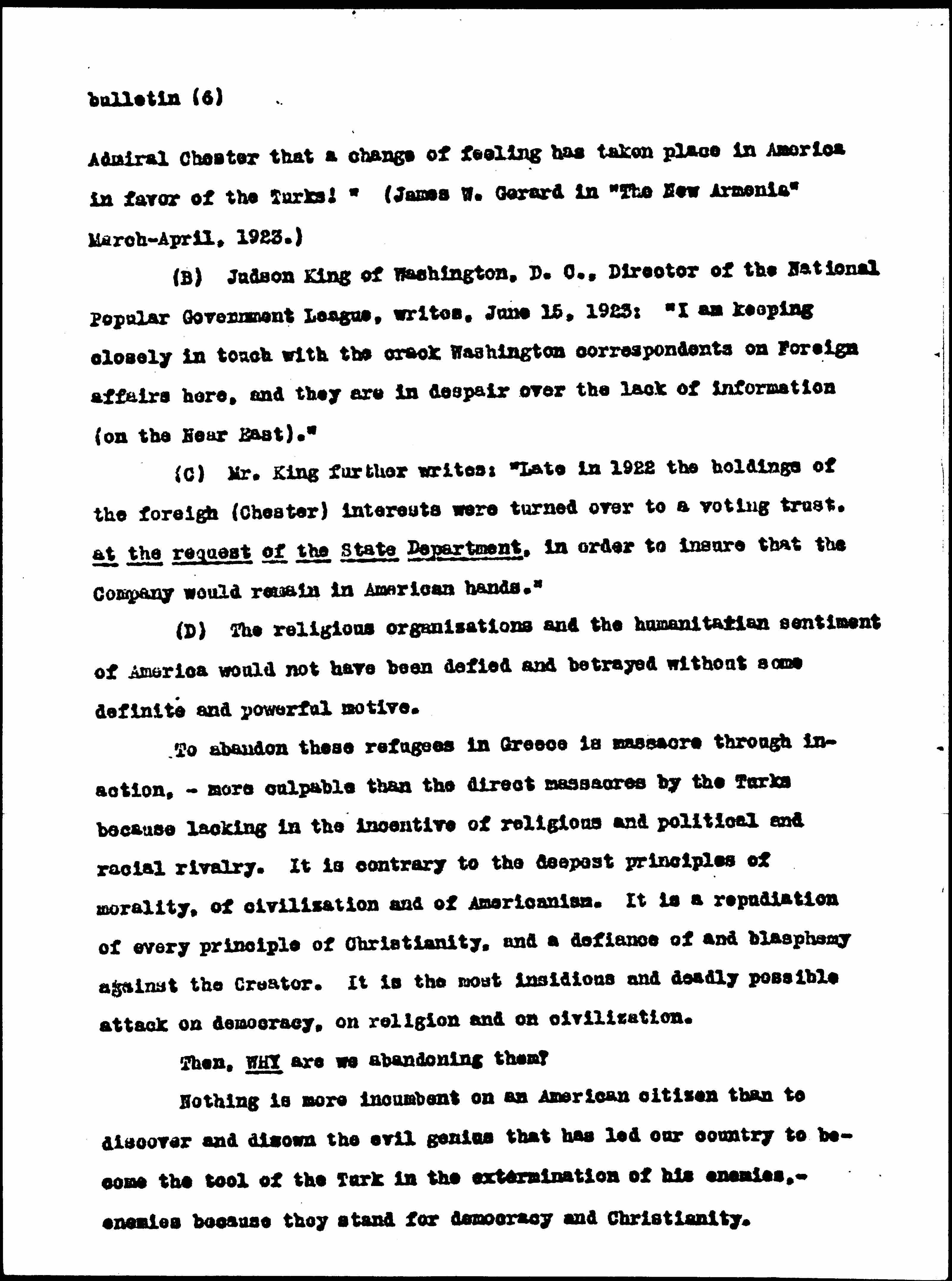 (B) Judson King of Washington, D.C., Director of the National Popular Government League, writes, June 15, 1923: "I am keeping closely in touch with the crack Washington correspondents on Foreign affairs here, and they are in despair over the lack of information (on the Near East)."